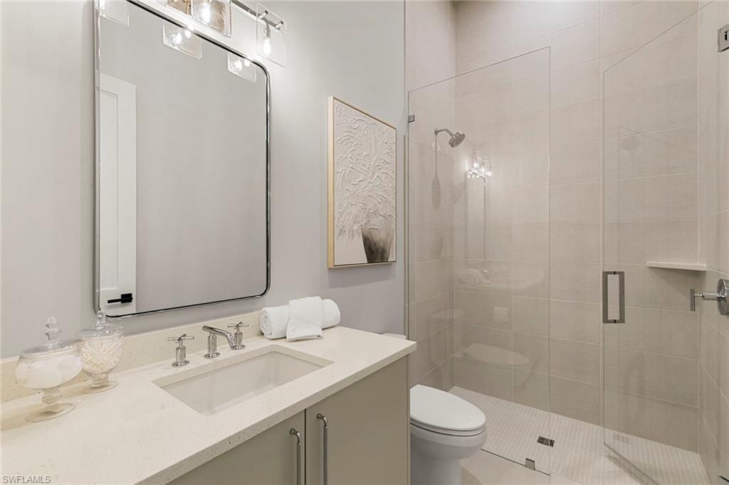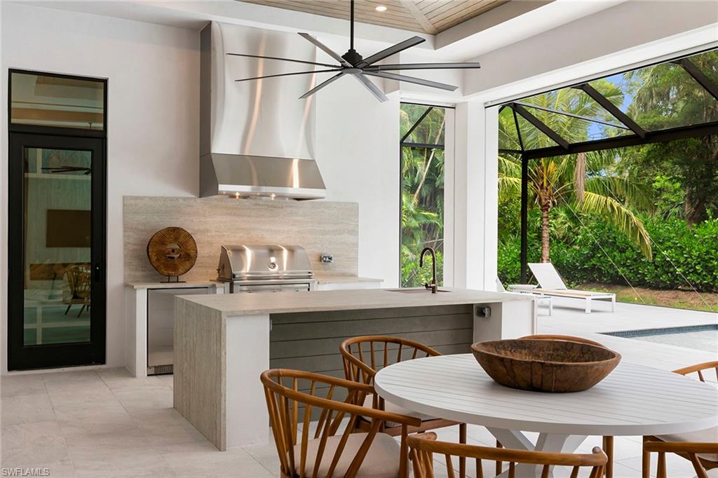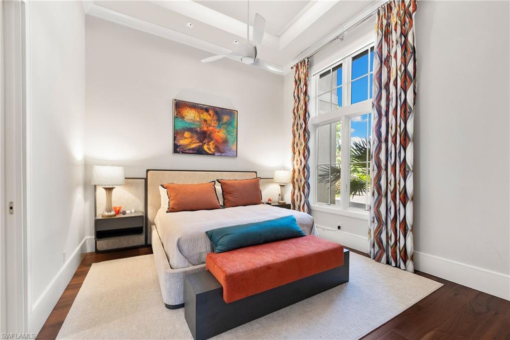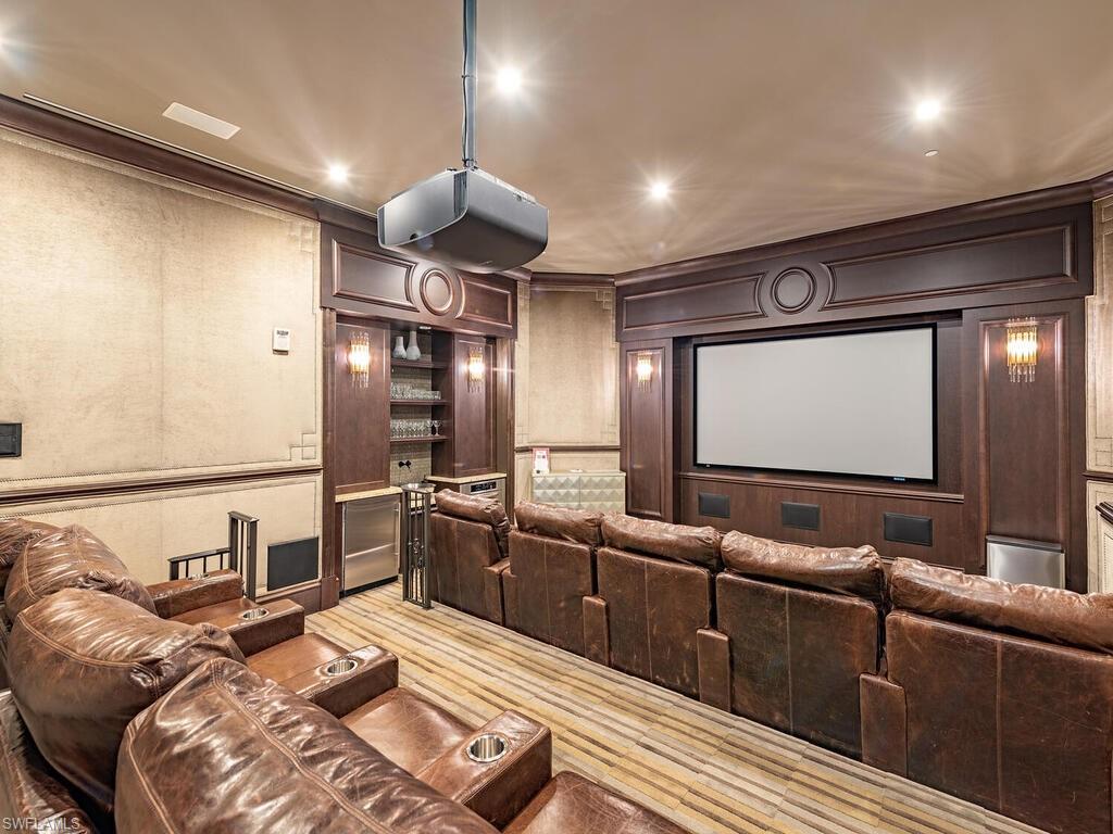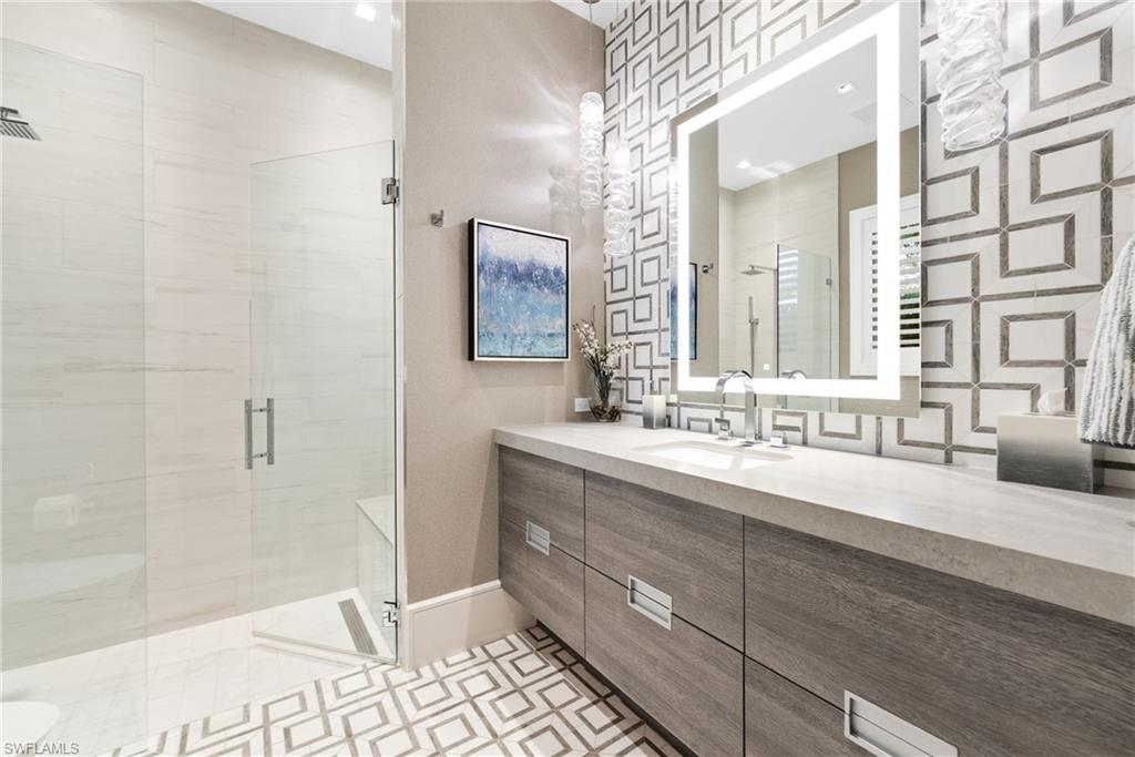 Luxury and sophistication are combined with world-class craftsmanship to deliver this award-winning STOCK custom home in the exclusive Bay Woods at Bonita Bay. Thoughtfully designed by New Architectura in collaboration with Wilfredo Emanuel Designs and Clive Daniel, this Cosmopolitan Chic home was the winner of the prestigious Sand Dollar Award and boasts a nearly $1,000,000 interior design package. Situated on a premium lot with unobstructed lake and golf course views, this home boasts 4 bedrooms, 6 bathrooms, bonus room, and an oversized 4-car garage with room for 5 plus cars. As you enter through the grand contemporary steel doors, you are immediately struck by the dramatic geometric ceiling details, white glass tile flooring, suspended lighting, illuminated quartz wine bar and glass-enclosed wine room. The Cosmopolitan theme is carried into the kitchen, featuring glass-faced cabinetry, quartz and semi-precious stone islands with waterfall, Wolf and SubZero built-in paneled appliances, Miele coffee machine, a walk-in pantry and more. The massive primary suite is nothing short of breathtaking. From its white oak flooring to the oversized seating area, dual walk-in closets, mirrored wall panels, textured wallpaper and built-in headboard with custom lighting. As you enter the primary bathroom, you will find two separate water closets, a free-standing tub, oversized shower with multiple heads, gorgeous tile and textured accent walls. Boasting more than 3,000SF of space, the outdoor area is a true focal point of the home and features countless upgrades such as electric shutters and screens, bug mist system, gas fireplace and separate fire pit area, massive outdoor kitchen with waterfall quartz counters, geometric ceiling details, white marble pavers, and pool bathroom. Enjoy the sunset views over the infinity edge gas-heated pool and spa. Continuing throughout the home, you will find that every guest bedroom is ensuite and features white oak flooring, walk-in custom closets and each has its own unique design cues such as custom draperies, wallpapers, ceiling and wall details. Showcased by a floor-to-ceiling glass entry, the opulent billiards/bonus room is sure to impress with its custom leather-padded wall and illuminated stone accents. The full-home Control4 smart system provides automated electric blinds throughout, smart lighting switches, indoor and outdoor built-in speakers, security system and more. Bonita Bay offers an array of outstanding amenities and optional memberships, from a private beach club to a full-service marina and multiple dining options. Experience premier golfing with five recently renovated Arthur Hills and Tom Fazio championship courses and three expansive practice facilities. Enjoy miles of scenic walking and biking trails, kayaking, canoeing, boat launch, state-of-the-art fitness center, an 18-court tennis and pickleball complex, numerous community parks and more.