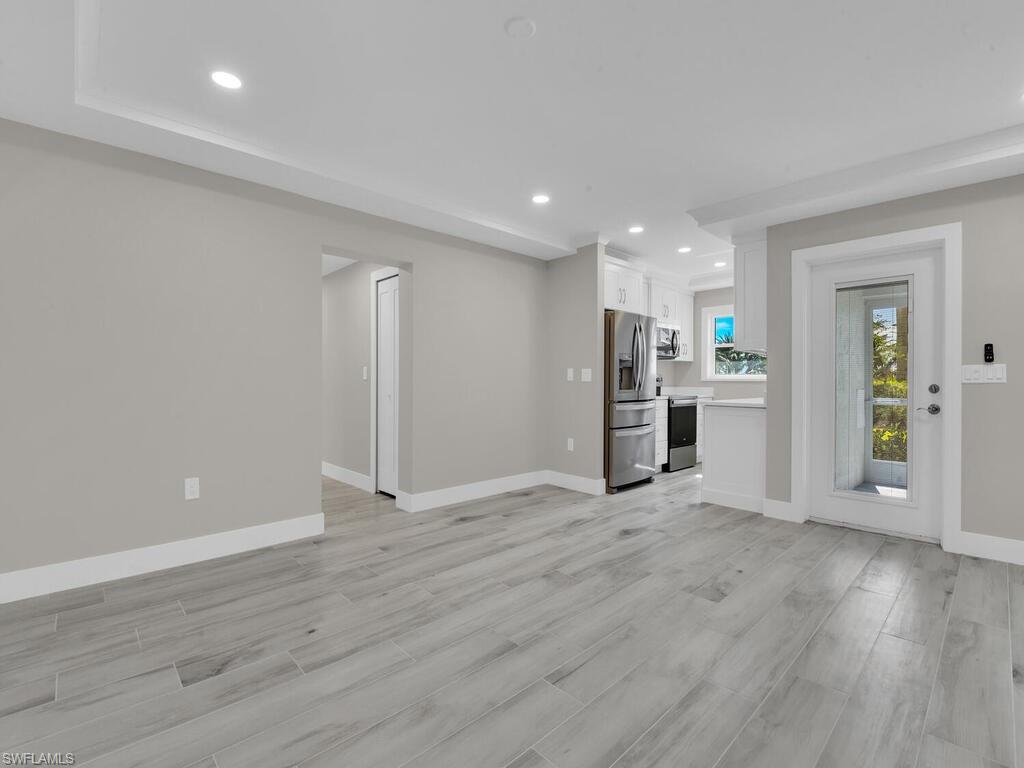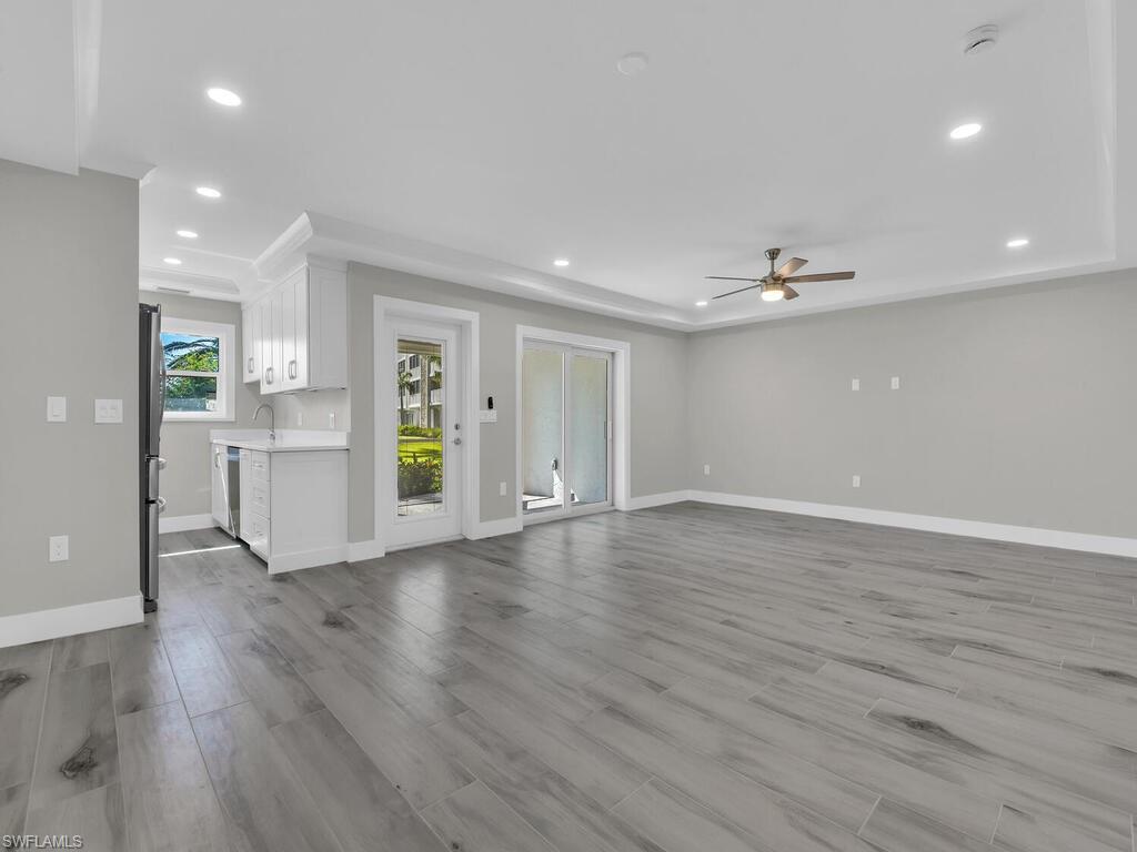 Welcome to Bonita Beach Club! Enjoy breathtaking views of the Gulf of Mexico from this beautifully renovated first-floor unit. Surrounded by both the Gulf and Bay, this home offers a rare southwest-facing front exposure, providing expansive ocean views from the screened lanai. Every evening brings unforgettable, magazine-worthy sunsets that stretch for miles across the horizon. This fully updated 2-bedroom, 1-bath residence features elegant wood-look tile flooring throughout, creating a seamless and modern coastal feel. The open-concept living and dining area is spacious and inviting, enhanced by tray ceilings and an abundance of natural light. The kitchen is a highlight, boasting white wood cabinetry, quartz countertops, and brand-new stainless steel appliances—ideal for both everyday living and entertaining. Both bedrooms are generously sized, and the beautifully renovated bathroom completes the interior space. The Bonita Beach Club community is impeccably maintained and offers a true resort-style living experience. Residents enjoy access to a private beachfront swimming pool, tennis courts, shuffleboard, a fishing pier, Gulf-access boat slips, a fitness center, a billiards room, and on-site management. Ideally located in a quiet, gated enclave at the north end of Little Hickory Island, this community is just minutes from the best of Bonita Springs and North Naples, including the Promenade, Mercato, Coconut Point, and Waterside Shops. A variety of restaurants, entertainment options, and nightlife are all within a short bike ride. Please note that some common areas are still undergoing repairs following recent hurricane damage.