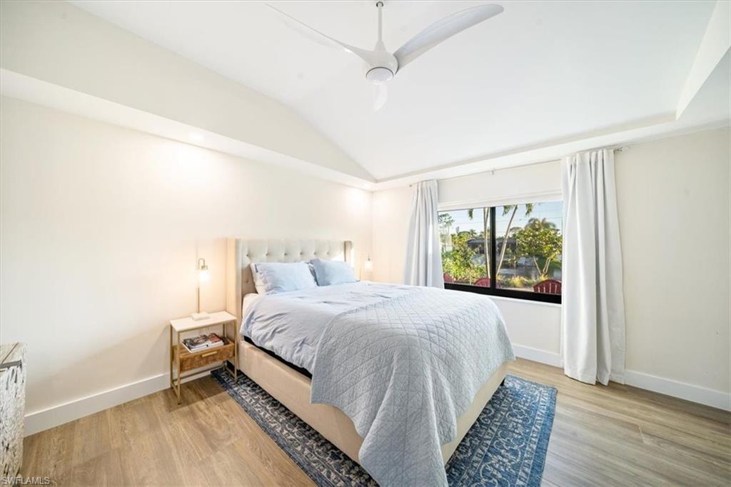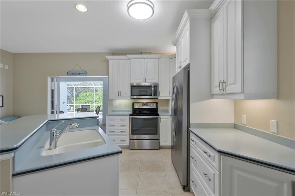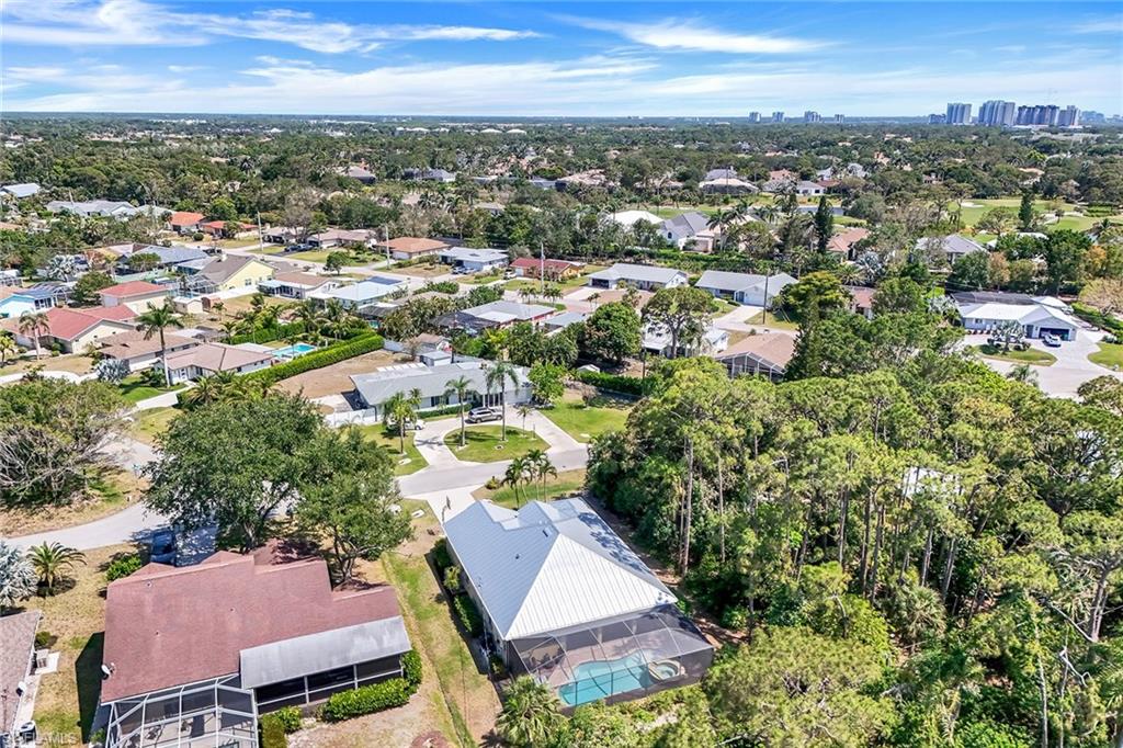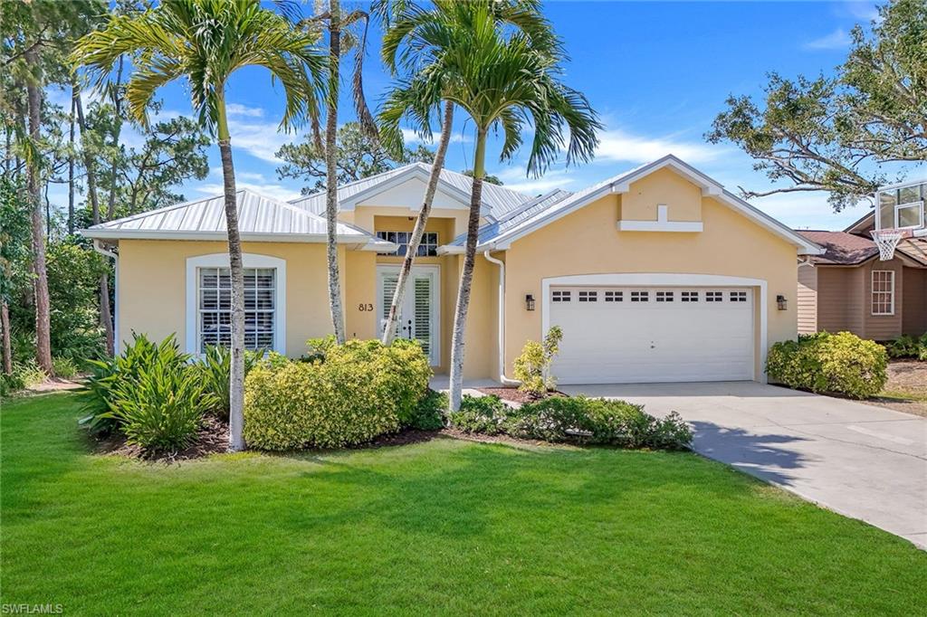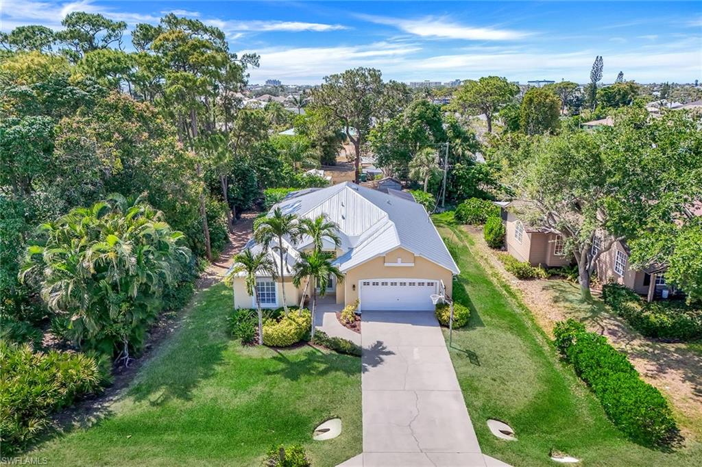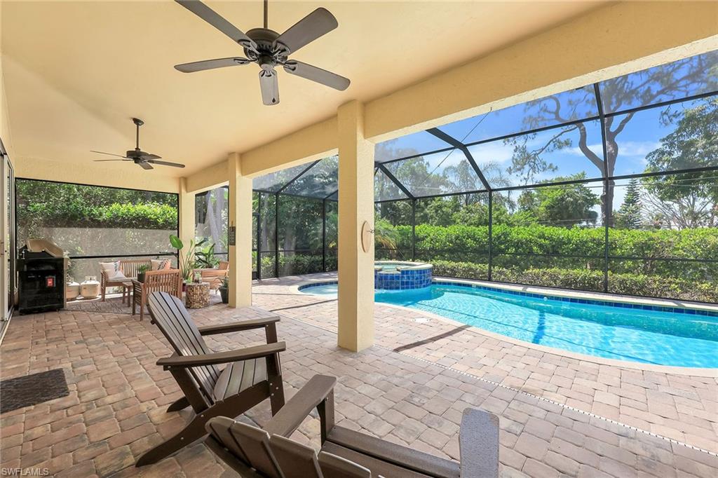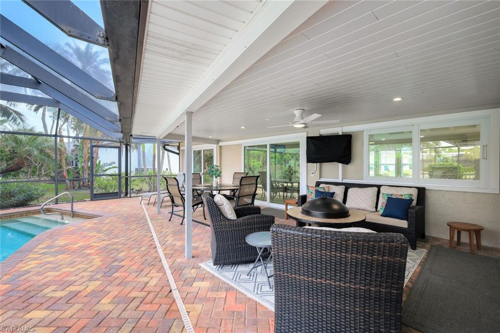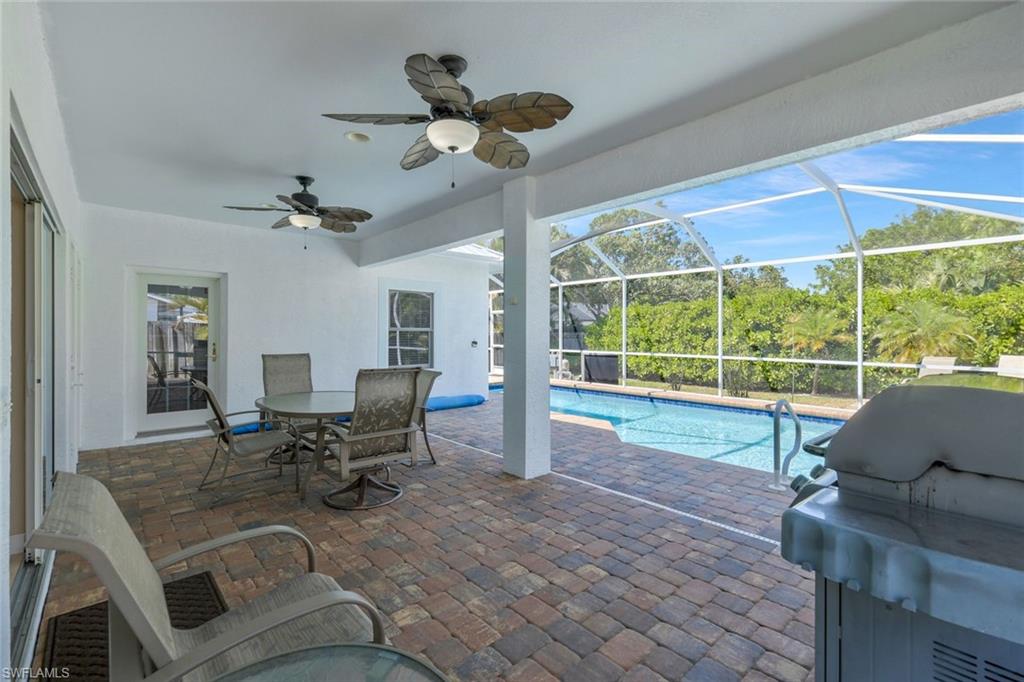 AMAZING RENOVATION & GORGEOUS CURB APPEAL! 1.2 MILES TO THE BEACH!! Noteworthy updates include a new roof in 2023, impact windows and sliders, a tankless water heater installed in 2021, and a 2020 AC unit. 2 fully remodeled baths - main bath is a STEAM SHOWER. The interior showcases a spacious great room with vaulted ceilings and exquisite detailing, complemented by “wood look” tiled flooring. The Shaker-style kitchen, the heart of the home, features an island with quartz countertops and an elegant tiled backsplash. A private guest wing offers its own entrance, a morning kitchen, and a serene patio off the bedroom, ideal for a peaceful retreat. Two additional bedrooms boast vaulted ceilings, ceiling fans, and generous closet space, providing a bright and airy feel. Outdoors, enjoy the Naples lifestyle with a newly renovated pool and spa adorned with mosaic tiles, stone coping, and a paver deck. The screened lanai overlooks the beautifully landscaped yard, creating a serene outdoor haven. A custom-built fire pit invites relaxation while you savor stunning sunsets over the lake from the western-exposure backyard. Additional outdoor features include a shed, LED landscape lighting lushly landscaped. Neighborhood has a community center, boat ramp and perfectly located steps to open waters, boating, kayaking, paddle boarding activities in this northern Collier County community.
