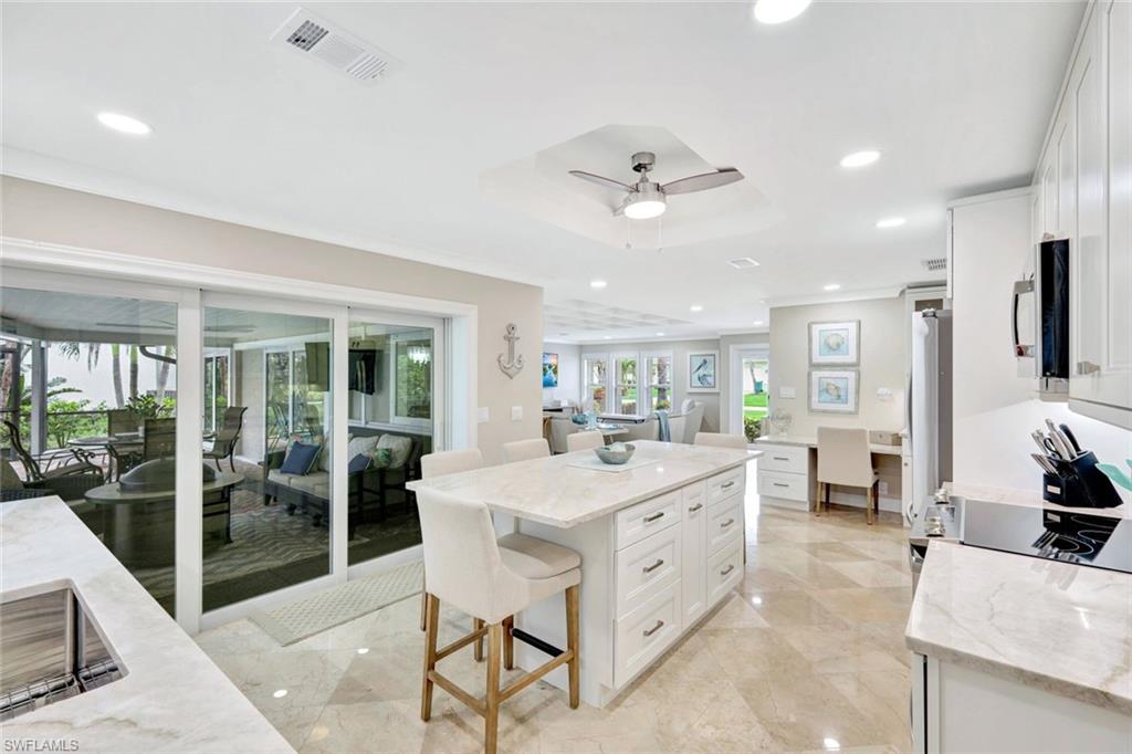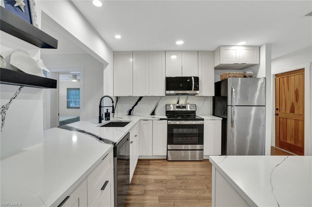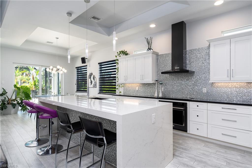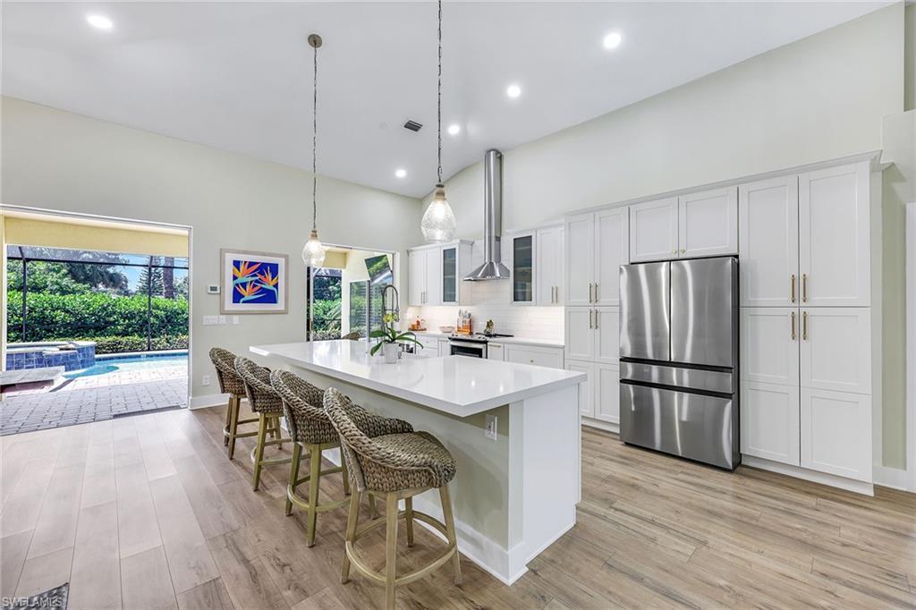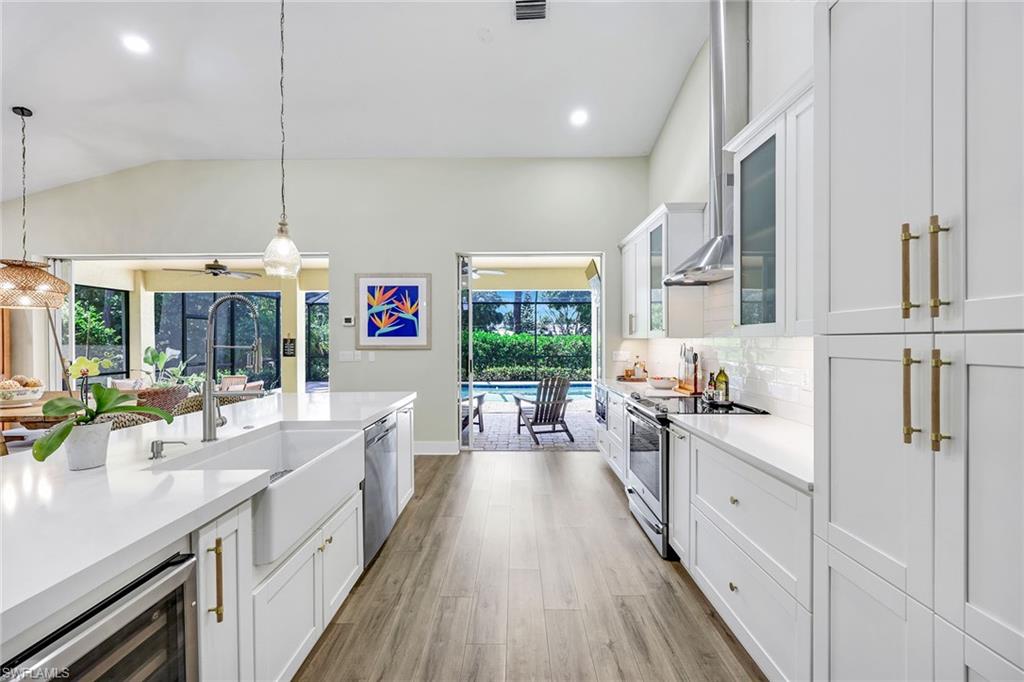 Discover the ideal blend of modern luxury and coastal charm in this beautifully remodeled three-bedroom, 2.5-bath residence, just minutes from the beach. Go inside to an open, airy layout with soaring volume ceilings, warm LED lighting, and premium LVP flooring throughout. The stunning new kitchen features an oversized island with Mystic Pearl Arista quartz countertops and is a spot for family gatherings and entertaining. Other kitchen upgrades include custom shaker-style cabinetry with stylish hardware, a farmhouse sink, a timeless tiled backsplash, built-in wine cooler and top-of-the-line appliances. The well-designed utility room offers a full-size LG stackable washer and dryer, folding station and ample storage. Additional upgrades include all new interior and closet doors, and fully renovated baths. The foyer accommodates a convenient powder room with access to the two-car attached garage. Go outside to your private oasis, complete with a heated pool and spa, paved deck and screen-enclosed lanai, ideal for relaxing or hosting friends year-round. A newer metal roof added in 2024 gives great curb appeal, peace of mind and long-term value. This move-in-ready home delivers comfort, style and an unbeatable location. Bonita Shores offers a member-only private boat launch with Gulf access for easy boating and a Collier County location. Close to Barefoot Beach and local restaurants, this one is an opportunity not to be missed!