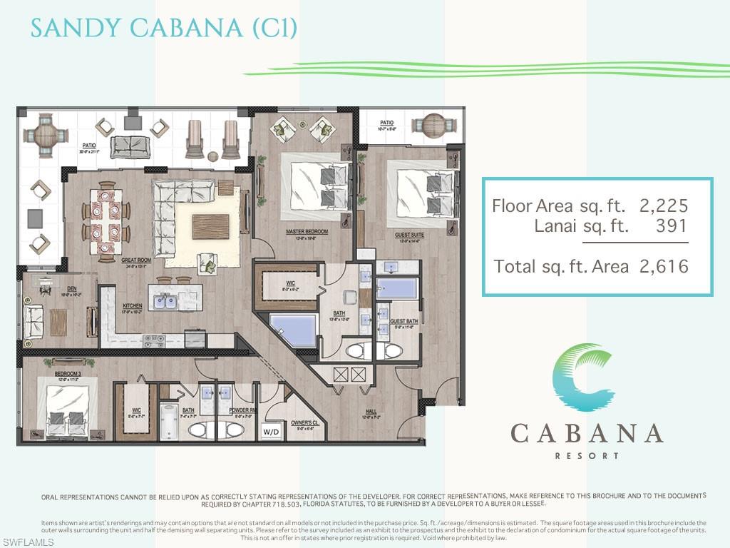 C.17399 - The end unit Sandy Cabana is the largest 3-Bedroom plan in Cabana. It has a gracious Foyer, open floorplan, island Kitchen and spacious Dining area. The wraparound Balcony can be accessed from the main living areas through three sets of slider doors for indoor/outdoor style. The Den is set off by a glass barn door and the Master Suite has a huge walk-in closet The Guest Suite has its own Balcony. All Cabana units have half baths. Cabana is bringing vacation destination amenities and day-through-night family focused attractions to Bonita Springs. Its 7 acres of Resort Pools feature a winding Lazy River, ‘surfable’ triple Flow Rider water feature, a pool with multiple water slides, all within 3 pool areas. 7 stories of energized contemporary architecture introduce a fresh face to Gulf view condo living with teak trimmed, unit-wide glass balconies and spacious floorplans, all bookended by massive ground to rooftop art installations. It’s Grand Food Hall is an airy and open expanse sheathed in glass for 360* views. It’s designed for boardwalk strolling, casual to fine dining, shopping, sampling and socializing in a year round setting.
