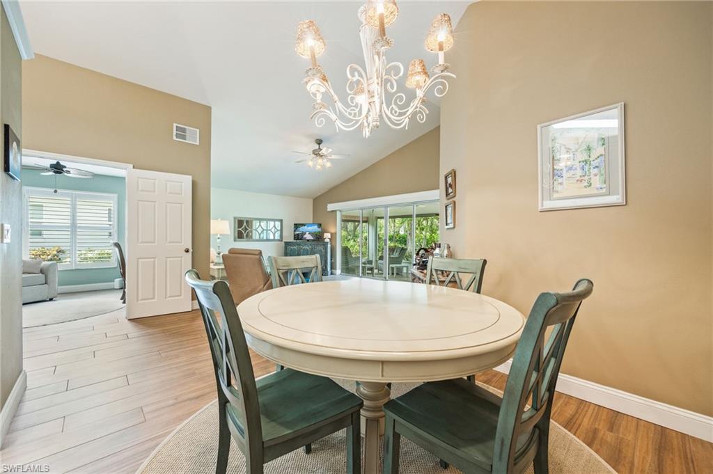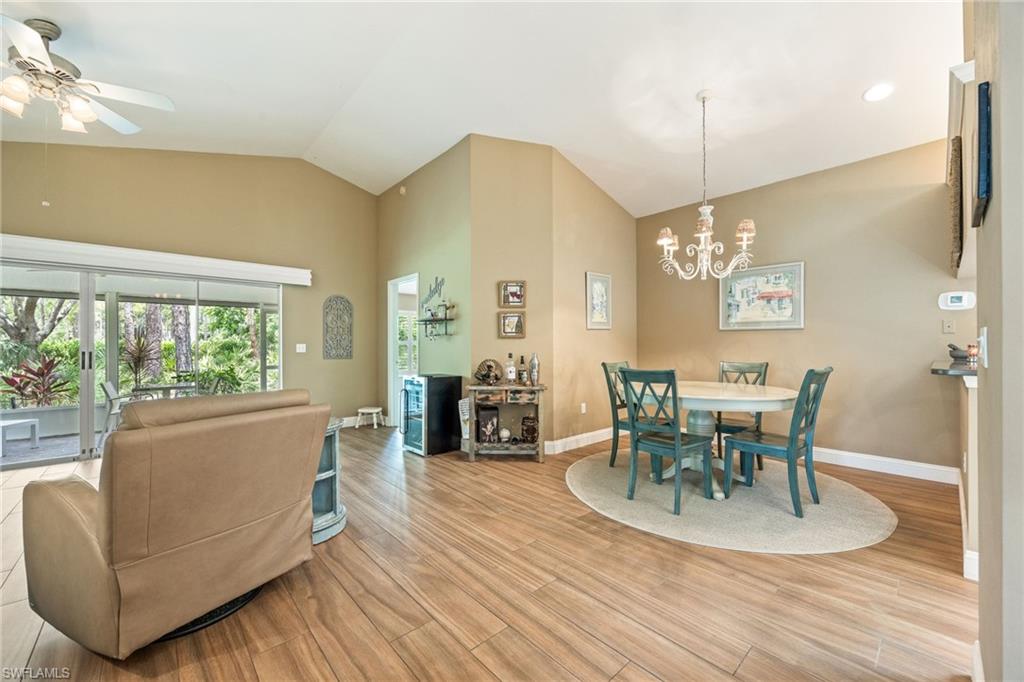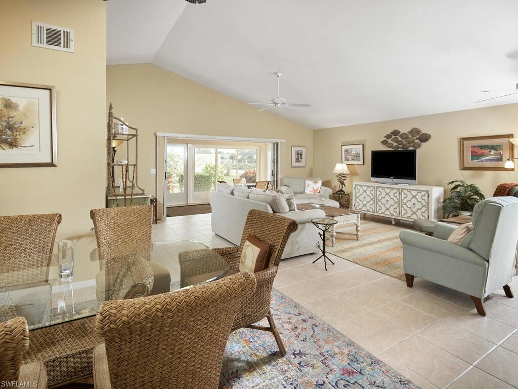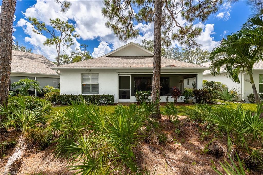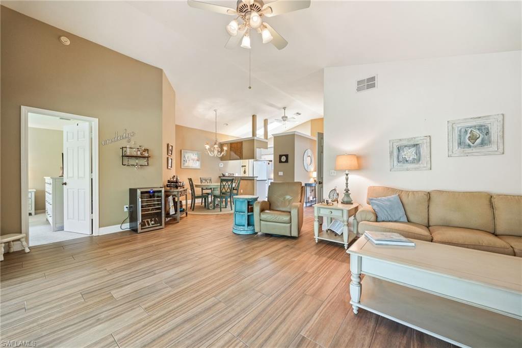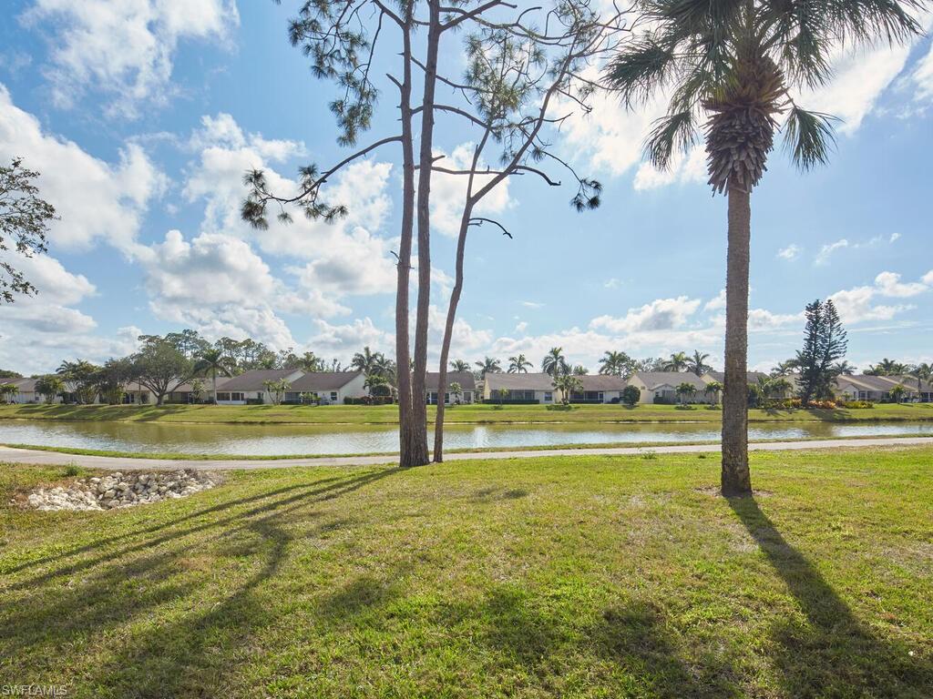 Bonita's best kept secret. A charming and care free single family home with a one car garage in the Fairway Dunes neighborhood with only eighty homes on this private street, lined with a canopy of oak trees.The interior details and finishes inside add a touch of elegance with the updated baths and custom kitchen, tasteful 18x18 tiled floors and LVP bedrooms. The soaring volume ceilings give the home a bright and airy feel. This two bedroom, two bath home is the right size for your move up or down. The generous lanai for entertaining also enjoys a beautiful lake view to take in some bird watching while relaxing. Freshly painted exterior and brand new 2025 AC. It’s ready for you to enjoy the Florida Lifestyle. An active clubhouse and an oversized community pool and tennis included. A must see.