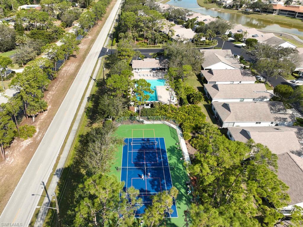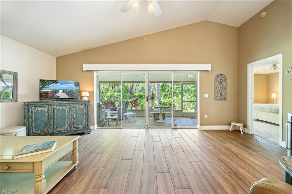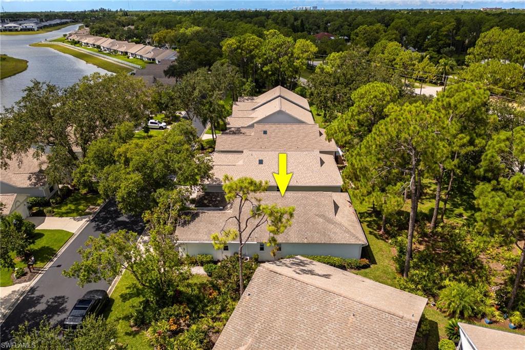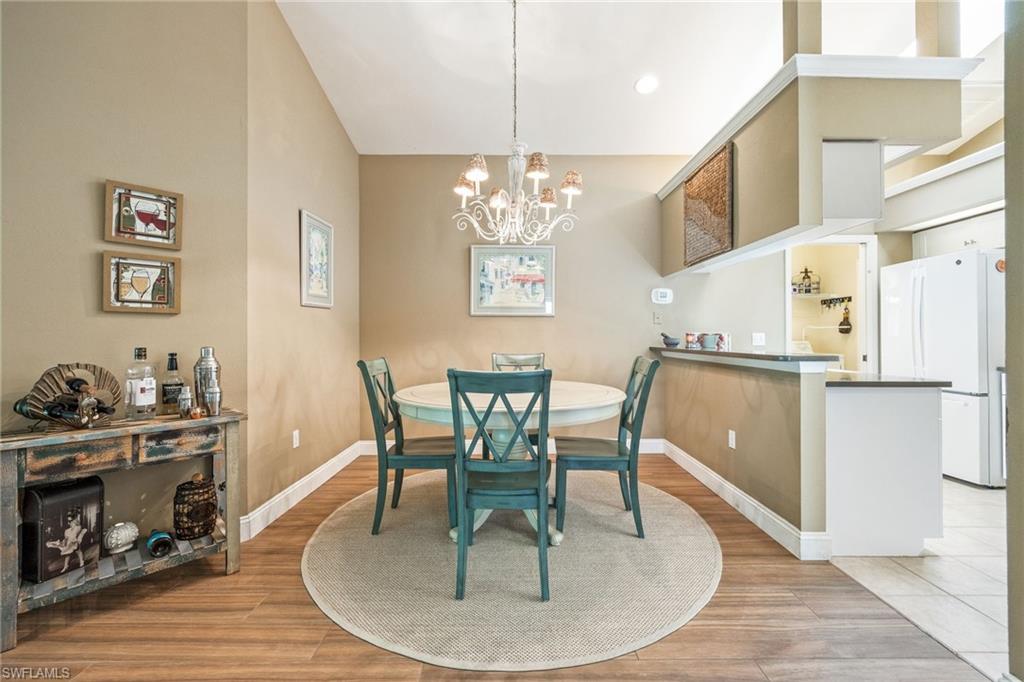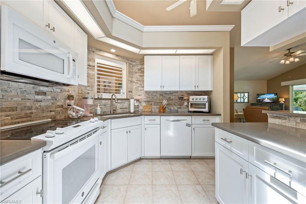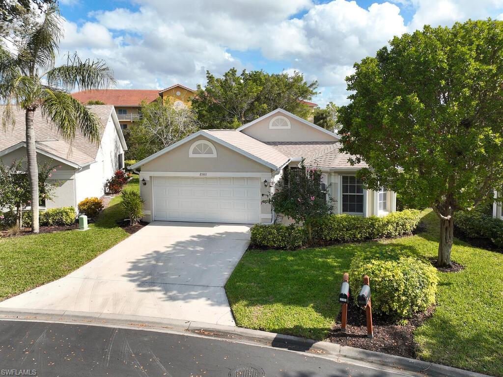 Bonita's best kept secret. A charming and care free single family home with a one car garage in the Fairway Dunes neighborhood with only eighty homes on this private street, lined with a canopy of oak trees.The interior details and finishes inside add a touch of elegance with the updated baths and custom kitchen, tasteful 18x18 tiled floors and LVP bedrooms. The soaring volume ceilings give the home a bright and airy feel. This two bedroom, two bath home is the right size for your move up or down. The generous lanai for entertaining also enjoys a beautiful lake view to take in some bird watching while relaxing. Freshly painted exterior and brand new 2025 AC. It’s ready for you to enjoy the Florida Lifestyle. An active clubhouse and an oversized community pool and tennis included. A must see.