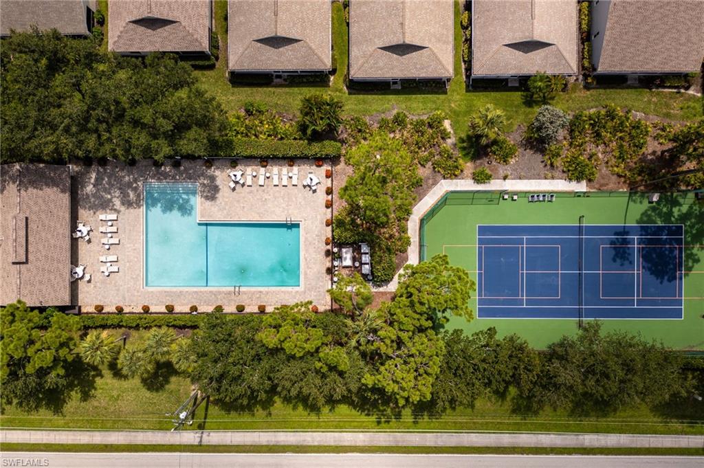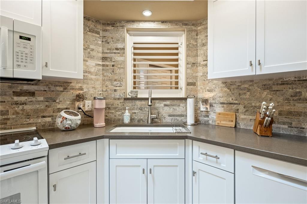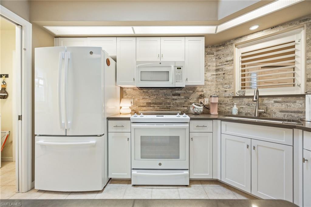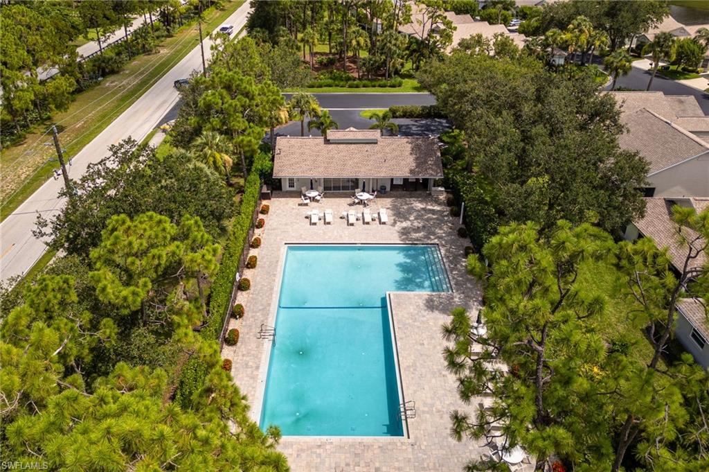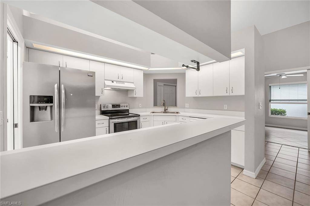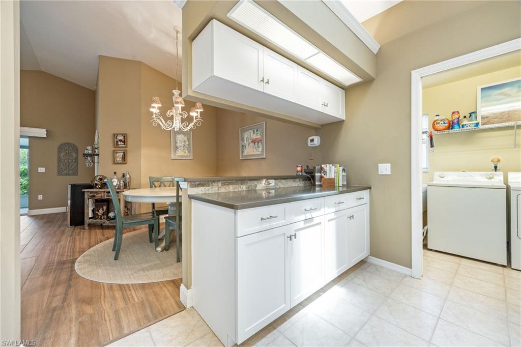 Bonita's best kept secret. A charming and care free single family home with a one car garage in the Fairway Dunes neighborhood with only eighty homes on this private street, lined with a canopy of oak trees.The interior details and finishes inside add a touch of elegance with the updated baths and custom kitchen, tasteful 18x18 tiled floors and LVP bedrooms. The soaring volume ceilings give the home a bright and airy feel. This two bedroom, two bath home is the right size for your move up or down. The generous lanai for entertaining also enjoys a beautiful lake view to take in some bird watching while relaxing. Freshly painted exterior and brand new 2025 AC. It’s ready for you to enjoy the Florida Lifestyle. An active clubhouse and an oversized community pool and tennis included. A must see.