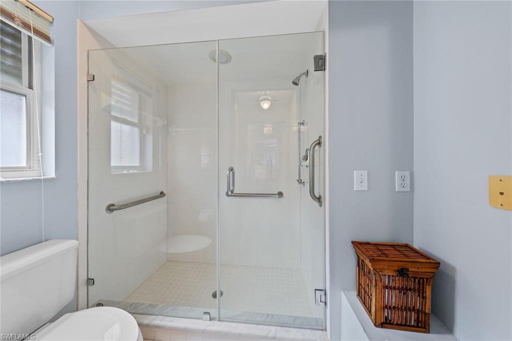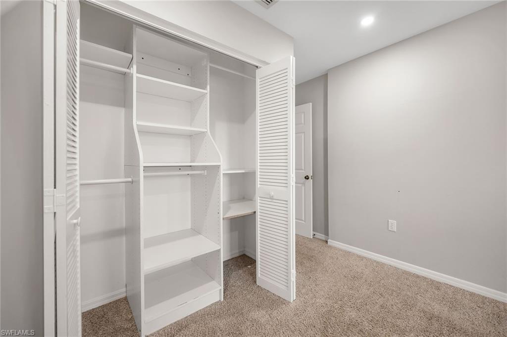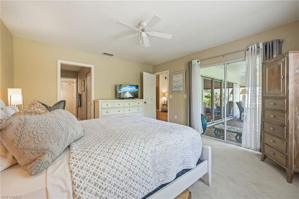 Fairway Dunes is a highly sought-after, special gem of a community in Bonita Springs convenient to shopping, dining, RSW airport and area beaches. Whether you're seeking a home for seasonal or year-round living, this 3 bedroom, 2 bath bungalow in paradise is it! The house was just re-plumbed, the interior of the entire home has been freshly painted with Sherwin Williams paint throughout, and has undergone a thorough deep cleaning including power washing the exterior. The home has tile throughout the main living area, gorgeous engineered wood flooring in the primary bedroom, and plush new carpet in the guest bedrooms. The kitchen features stainless steel appliances and a skylight that adds an abundance of natural light. The great room features a beautiful custom built dry bar with room for a beverage refrigerator, and large wall-mounted TV. The guest bathroom has recently been updated with a glass enclosed walk-in shower with river stone tile floor, new raised vanity with modern mirror., and a new comfort-height toilet. The spacious primary bedroom offers ample storage with two closets, an en-suite bathroom with a raised wooden vanity with a solid-surface counter top and dual sinks, and walk-in glass-enclosed shower. The HVAC was replaced in 2018. Air conditioned garage. The private back lanai offers a peaceful landscaped view and has electric storm shutters. Fairway Dunes is a friendly and socially active community with clubhouse, heated pool and tennis courts.