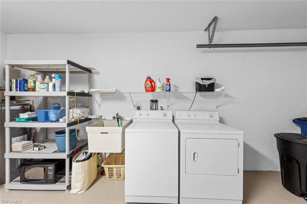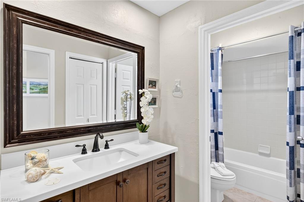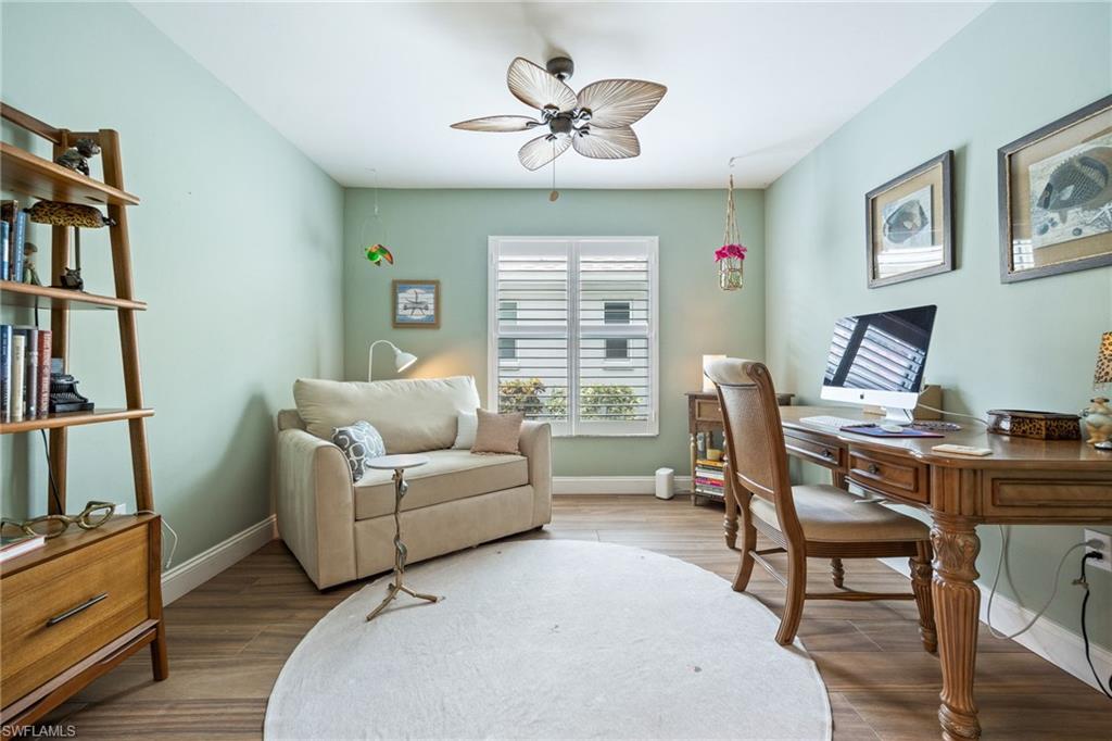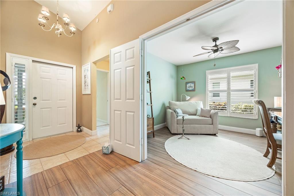Welcome to this beautifully updated 2-bedroom plus den, 2-bath single family home located in the desirable Fairway Dunes community. This charming residence is being sold furnished (with a few exclusions), offering a seamless and stylish move in experience. From the moment you arrive, the home makes a lasting impression with its paver driveway and walkway with a connecting path to the side yard. Inside, you'll find wood look tile flooring, plantation shutters, and elegant crown molding, adding warmth and sophistication throughout. The updated kitchen features modern finishes perfect for both everyday living and entertaining. A versatile den offers the ideal space for a home office, hobby room, or extra guest accommodations. Step out to the screened lanai, where stone tile flooring adds beauty and character to your peaceful outdoor escape. Overlooking lush, professionally landscaped grounds, this space is perfect for morning coffee or unwinding in the evening and watching the beautiful SWFL Sunsets. For added peace of mind, the lanai is equipped with Storm Smart motorized hurricane screens, providing effortless protection year round. This thoughtfully upgraded and meticulously maintained home is a true gem in Fairway Dunes, ready for you to move in and enjoy from day one. Fairway Dunes is Conveniently located to Shopping, grocery and restaurants and is NOT in a Flood Zone. Low monthly HOA, which includes Lawn Care, Community Pool, Pickleball and Tennis Courts.