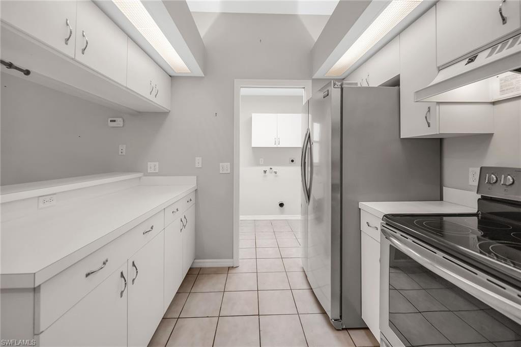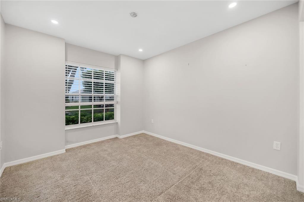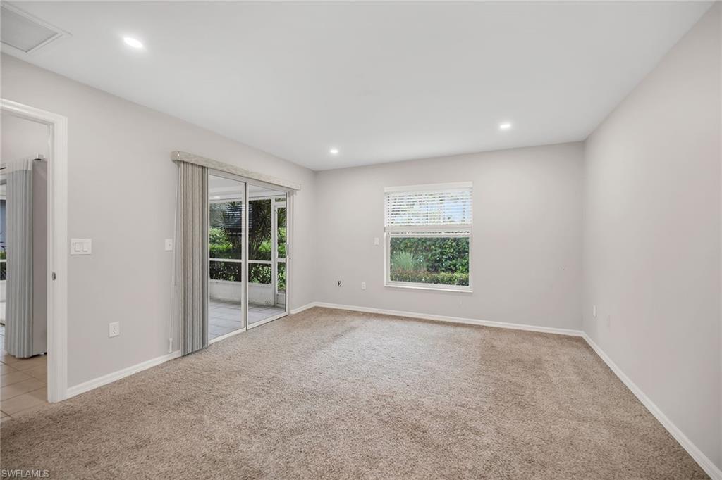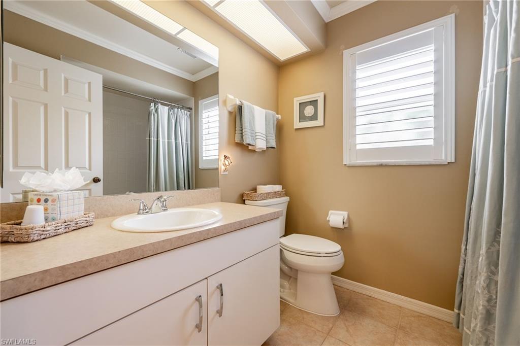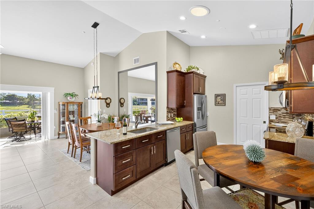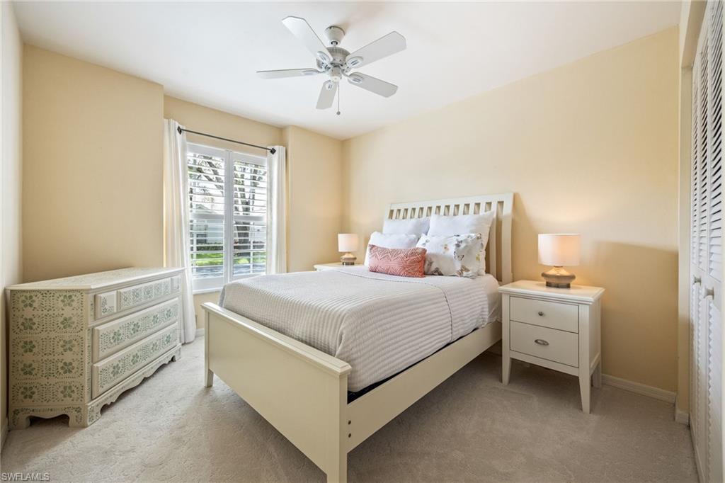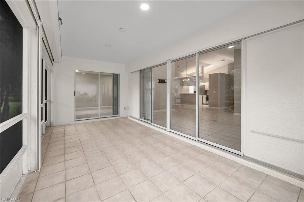 Tucked within the quiet, tropical surroundings of Fairway Dunes, this beautifully maintained single-family home offers two bedrooms plus a den, two baths and a two-car garage—blending privacy, comfort and a convenient Bonita Springs location. Enjoy serene garden views from the screened lanai, complete with tile flooring, recessed lighting and covered outdoor living. Storm protection includes electric and manual shutters, and lush tropical landscaping enhances the private setting. Inside, the open layout features tile flooring throughout the main living areas, crown molding and recessed lighting. A glass slider in the living room opens to the lanai, filling the home with natural light. The kitchen offers white cabinetry, a skylight, a pass-through window over the sink, and a bar-height counter for casual seating. Frigidaire stainless steel appliances include a range and refrigerator with icemaker, while an adjacent dining area completes the space. The spacious owner’s suite overlooks the garden and includes private lanai access, a walk-in closet with built-ins, and an en-suite bath with dual white vanities, a full-width mirror, and a glass-enclosed walk-in shower. The guest bedroom enjoys peaceful lake views and is conveniently next to a full bath with a tub/shower combo. A versatile den with pocket doors and ceiling fan offers space for a home office or study. Additional features include a laundry room with washer/dryer hookups, a utility sink, overhead cabinetry, epoxy garage flooring, and updated high-top lighting. The electrical panel (Square D) was replaced two years ago, and the air conditioner, water heater, and roof were all updated around 2019–2020. The home is in an X flood zone and there are no current assessments. Fairway Dunes is a peaceful, centrally located community featuring a pool with baths, clubhouse, tennis and pickleball courts, a barbecue area, and scenic paths that wind around the lake. Ideally just minutes from Coconut Point, the Promenade, downtown Bonita Springs, RSW Airport, Interstate 75, FGCU, golf courses, parks, boat ramps, and white sand beaches of Southwest Florida, this home offers a balance of relaxed living and everyday convenience.