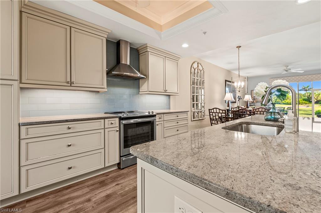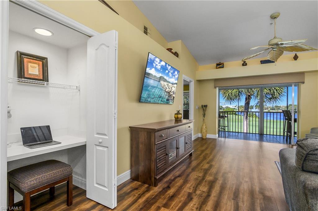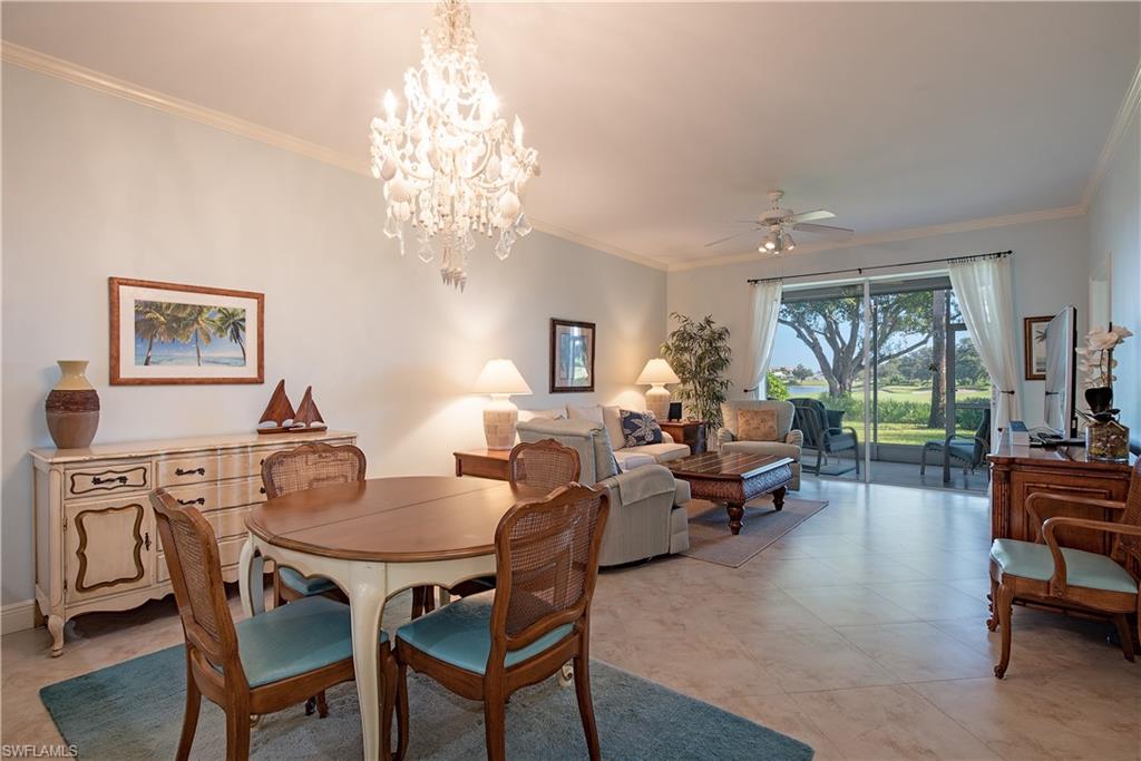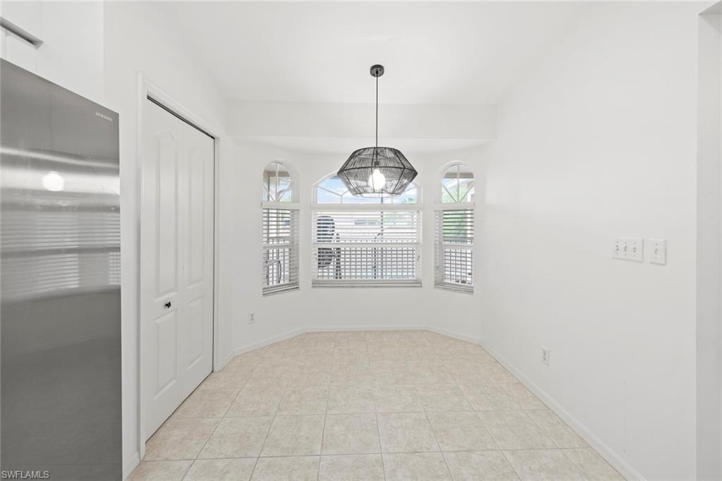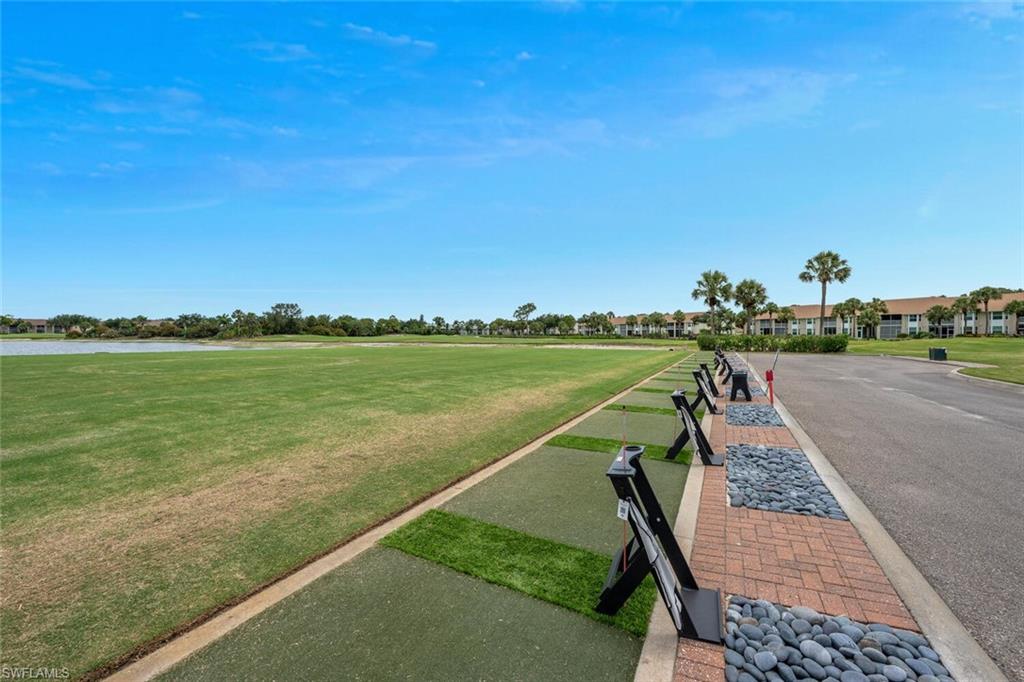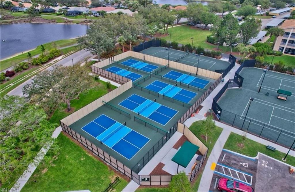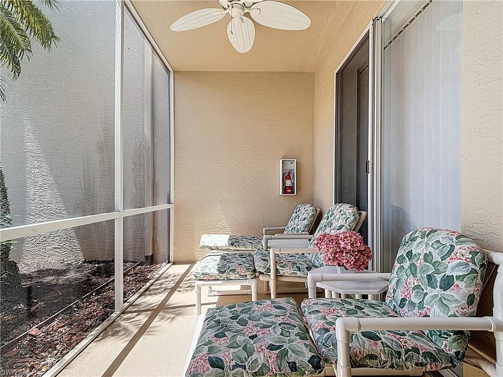 Your paradise awaits when you arrive at this meticulously maintained 2 bedrooms plus den with detached garage in the St Andrews Verandas! Not only is there the most relaxing and incredible view from your private lanai this unit boasts tile and carpet floorings and new kitchen with tray ceilings and farmhouse large sink and subway tile. Soft alluring color palate throughout. The breakfast area touts a remote Hunter Doulas Shade for your easy shading desires. The high-end Lexington and Tommy Bahama furniture stays. Owners have added an electric hurricane shutter to protect the lanai and hurricane rated windows in the primary suite. AC and water heater new 2022-2023. To add to your relaxing experience Highland Woods boasts a resort style pool with cabana, a state-of-the-art fitness center, tennis courts, bocce courts and pickle ball! the Clubhouse has been beautifully redone and has Grille Room and Dining to treat yourself, family and friends! All of this and close to Coconut Point, and Promenade and a short drive to the gulf!