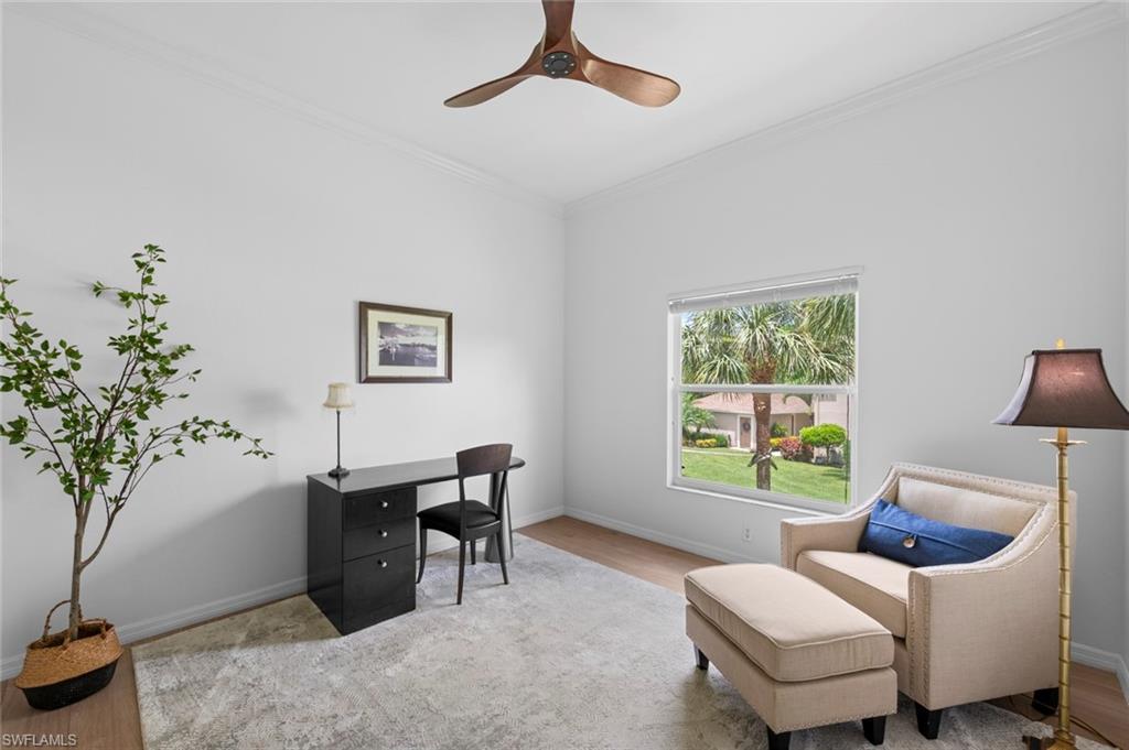 Rare opportunity to own this highly sought-after Barrington Veranda in the exclusive, gated Highland Woods community. Your Bundled Golf Membership starts the moment you close! This meticulously maintained 2-bedroom, 2-bath plus den home offers the perfect Florida retreat with a desirable split bedroom floor plan and a host of modern finishes. KEY FEATURES & UPGRADES: Upscale Finishes: Elegant LVT Luxury Vinyl Flooring, electric storm shades, and sophisticated Crown Moldings. Gourmet Kitchen: Featuring Granite Countertops and elegant Raised Panel Cabinetry. Serene Master: Large master suite with a Bay Window overlooking the beautiful course. RESORT LIFESTYLE & PRIME LOCATION: Highland Woods offers a vibrant, active lifestyle with an 18-hole championship golf course and recently completed, state-of-the-art amenities: new resort-style pool/spa, cabana bar & restaurant, and pickleball courts. Enjoy bocce, tennis, and a modern fitness center. Live in the heart of Bonita Springs with shopping and dining within walking distance, and the pristine Gulf of Mexico beaches just 4 miles away. Move-in ready for your peaceful winter escape!