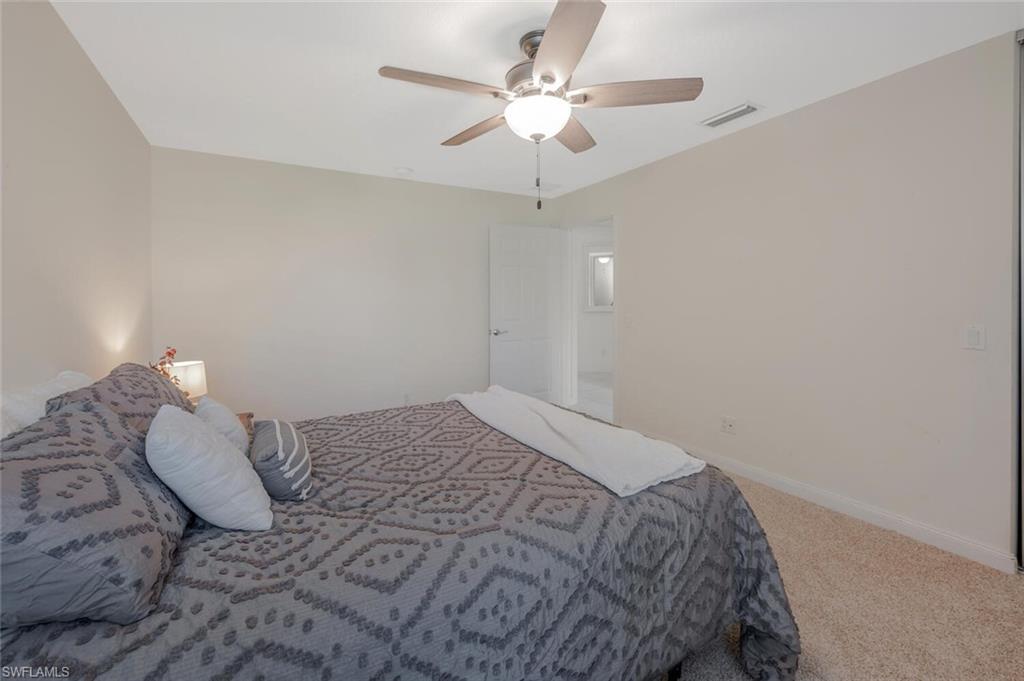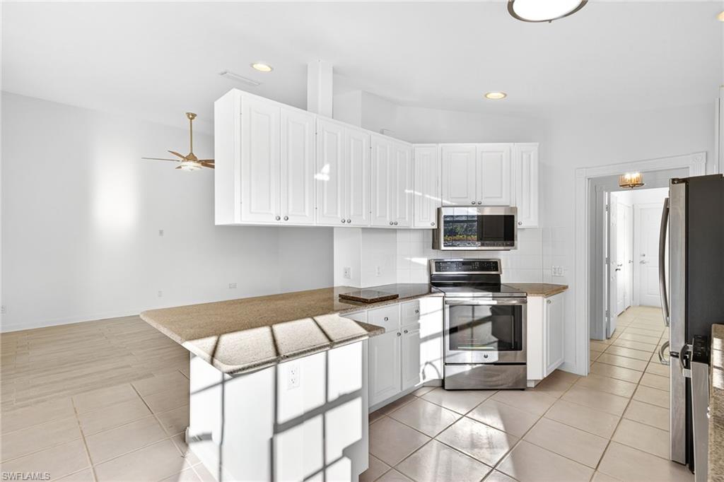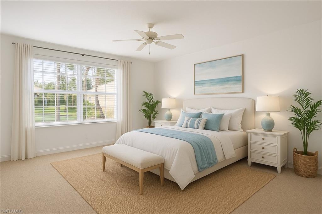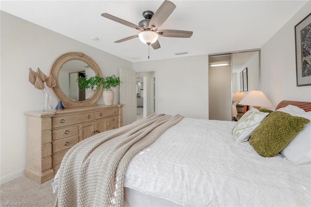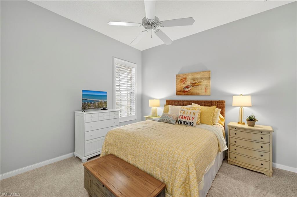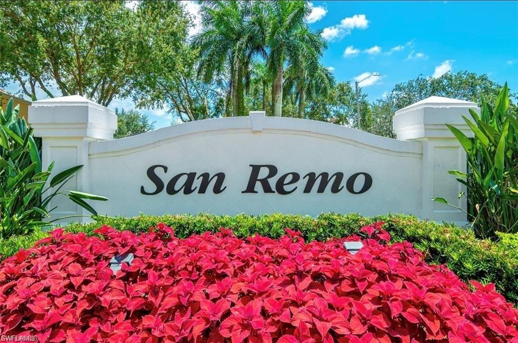 BACK ON THE MARKET due to buyer's personal curcumstances. Inspections, repairs and appraisal all completed! ONE OF THE BEST LAKE VIEWS IN SAN REMO - Welcome to this Capri III model villa, ideally located at the end of a quiet cul-de-sac! Enjoy breathtaking long lake views, perfect for sipping your morning coffee or tea while watching the stunning Florida sunrises from your screened-in lanai. Built by DiVosta, with poured concrete and steel reinforcement, this home is designed to withstand Florida's weather. The property features a NEW water heater and a NEW exterior water main shut off, BRAND NEW carpet (never been lived on) in both bedrooms and the living area, while the rest of the home boasts large neutral tiles. With vaulted ceilings and white cabinetry in both the kitchen and bathrooms, this villa feels spacious and airy. The primary suite includes a walk-in closet with custom cabinetry, as well as a primary bathroom with dual sinks and a large walk-in shower. This resort-style community offers a variety of amenities, including a large community pool, community room, fitness center, and tennis and pickleball courts. Conveniently located off Bonita Beach Road, San Remo is just 12 miles from the pristine sands of Bonita Beach and is close to restaurants, shopping, medical facilities, and more – making it the perfect location for your Florida lifestyle!