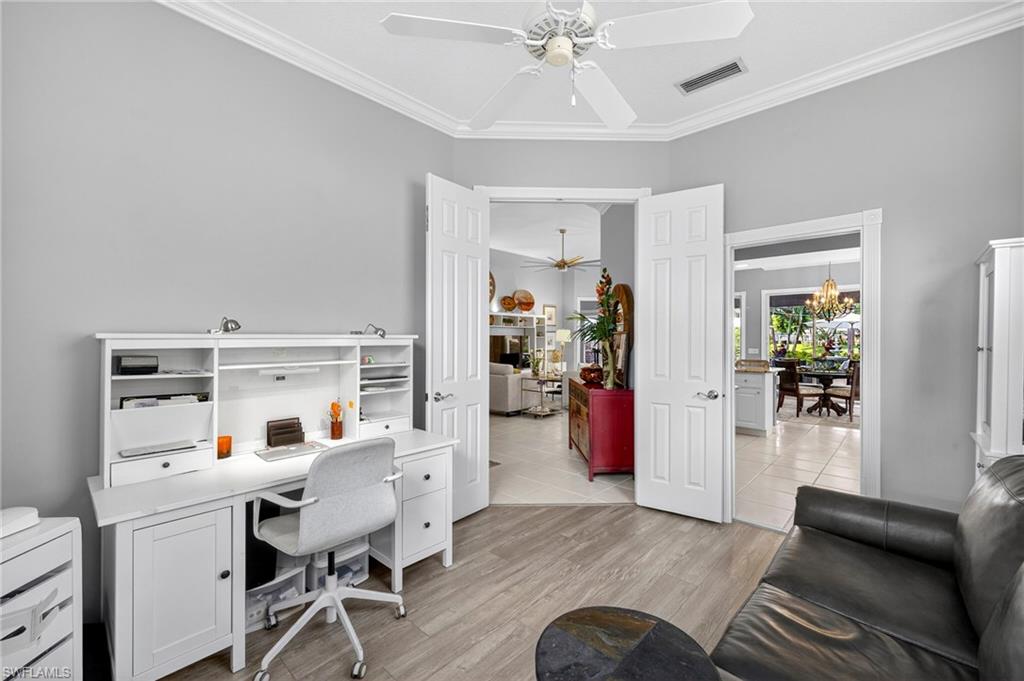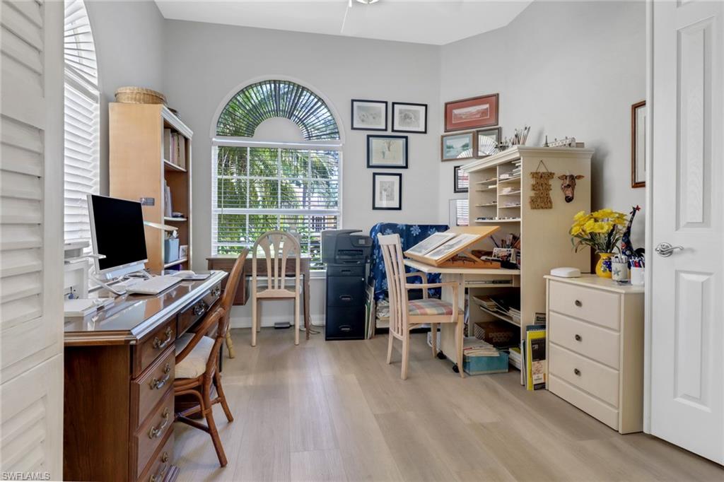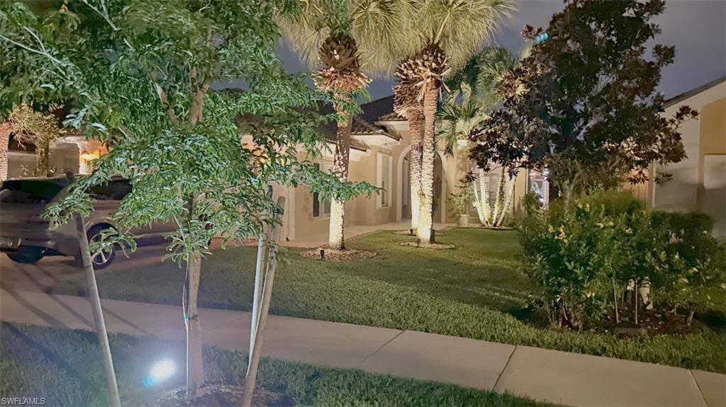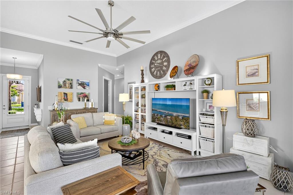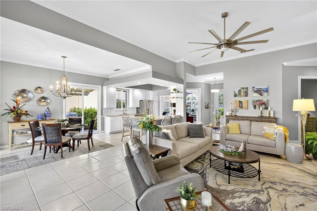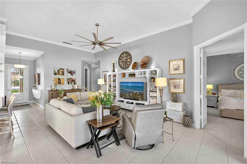Set along a peaceful lake in the gated community of San Remo at Palmira, this 3-bedroom plus den, 2-bath home offers nearly 2,000 square feet of beautifully designed single-level living. A split floor plan enhances privacy, while the spacious great room takes full advantage of its setting with wide-open lake views. The light-filled kitchen, complete with a pantry, flows seamlessly to an inviting dining area, creating a natural hub for gatherings. The primary suite is a private retreat, featuring a dual-entry His & Her bath with separate vanities, soaking tub, and walk-in shower. Step outside to an extended panoramic screen-caged lanai designed for both relaxation and entertaining. Here, a heated spa, tranquil nighttime landscape lighting, and a propane fire pit set the stage for evenings overlooking the shimmering lake and water feature. Notable features include impact-resistant doors in the primary suite, a combination of electric and manual shutters, built-in cabinetry, a laundry room with utility sink, and an attached two-car garage. San Remo at Palmira is a welcoming community ideal for all ages—whether it’s young families, retirees, working couples, or anyone seeking a vibrant yet peaceful Florida lifestyle. Residents enjoy resort-style amenities including a clubhouse, pool, pickleball and tennis courts, fitness center, and scenic walking paths—all with convenient access to Bonita Springs’ pristine beaches, boutique shopping, and dining.