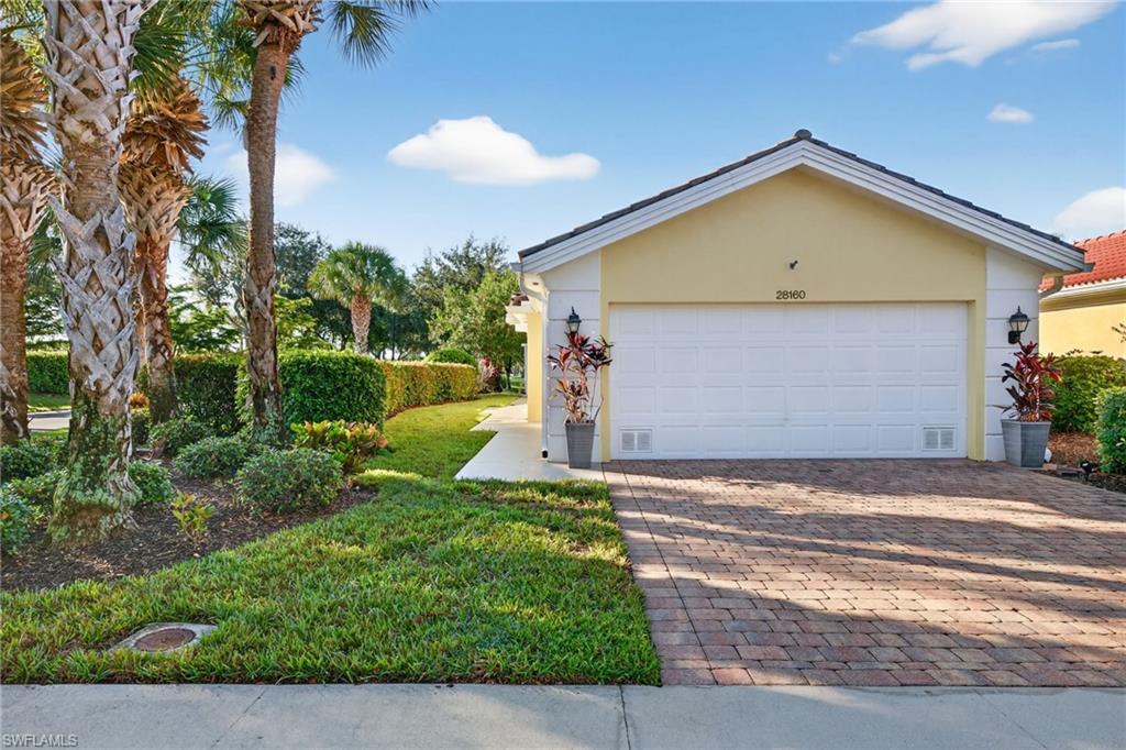 Welcome to 28160 Grossetto Way! Discover this beautifully maintained 2-bedroom, 2-bathroom villa, with a 2-car garage, and 2 living areas, perfectly situated on a prime end-of-street lot in the desirable gated community of San Remo in Bonita Springs. Enjoy extra privacy, added space, and stunning lake views from your own backyard oasis — complete with a beautiful pool and spacious screened lanai. Best of all, this home sits in a non-flood zone, offering peace of mind and lasting value. From the moment you arrive, the paver driveway and walkway set a welcoming tone and hint at the detail found throughout. Inside, you’ll find a bright, functional layout with tile flooring through the kitchen, dining, and living areas, and newly replaced plush carpet in the bedrooms for added comfort. Both bedrooms include walk-in closets, while the primary suite offers a well-appointed bath with dual sinks and a walk-in shower. San Remo is known for its low HOA fees, no CDD, and friendly, resort-style atmosphere. Enjoy access to a clubhouse with fitness center, resort-style pool, children’s playground, and lighted tennis and pickleball courts — all just steps from your front door. Ideally located in Bonita Springs, you’ll be close to everything Southwest Florida has to offer. Miromar Outlets and Coconut Point Mall provide nearby shopping and dining, while Florida Gulf Coast University and SWFL International Airport are just a short drive away. For beach lovers, the world-famous Barefoot Beach awaits only minutes from home, offering pristine sand, Gulf waters, and endless sunsets.