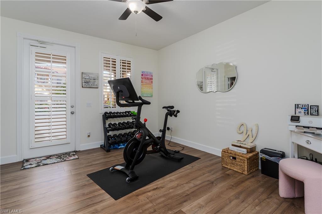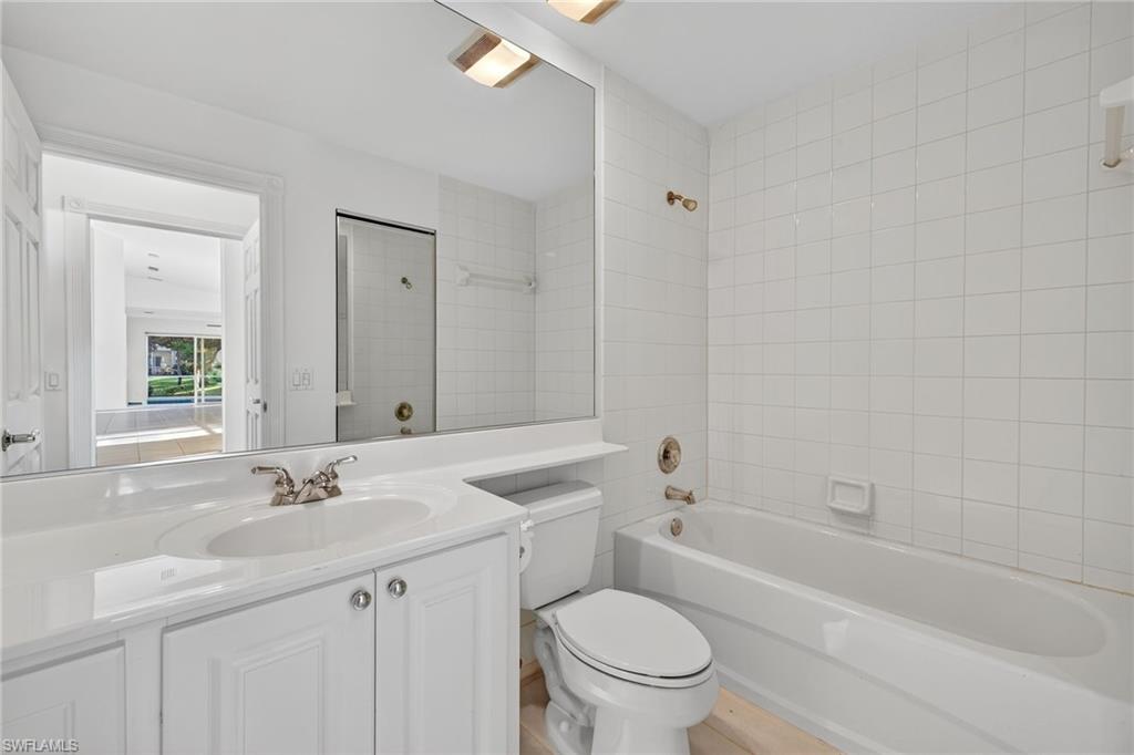 This impressive 3-bedroom plus den pool home is located in the prestigious gated community of San Remo at Palmira in Bonita Springs. A builder-extended Oakmont model, the home features an open Florida floor plan with a desirable split-bedroom layout, offering both space and privacy. Constructed with solid-poured concrete—a signature of DiVosta Homes—it includes a unique his-and-her primary bathroom setup with a Roman tub, separate shower, and dual walk-in closets. Enjoy peaceful southern exposure and tranquil lakefront views from the private screened lanai, which also features a gazebo and privacy hedge, perfect for outdoor relaxation or entertaining. Recent upgrades include a new A/C system, new appliances, fresh interior and exterior paint, and stylish new vinyl flooring throughout. The home is fully equipped with storm protection on all windows and doors, a whole-house generator, and does not require flood insurance. Located in a well-maintained, amenity-rich community with low HOA fees and no CDD, San Remo offers residents access to a resort-style pool, tennis and pickleball courts, and a welcoming community center. Meticulously maintained and move-in ready, this home delivers the best of secure, stylish, and relaxed Florida living.