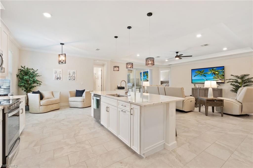 Shows like a model home! This stunning 3 bedroom plus den single family home is a testament to meticulous craftsmanship and thoughtful design with a perfect blend of luxury & functionality. Step into the inviting foyer and be greeted by the warmth of custom millwork with custom mirror accents and wood look tile flooring which flow throughout. The attention to detail is immediately apparent as you move through the open-concept living area into the private lanai with heated pool and raised spa. The spacious kitchen offers quartz countertops, quartz backsplash, over and under cabinet lighting, and stainess steel appliances which opens up to the large eat-in kitchen area and great room complete with floating built in cabinets. The master suite is complete with a luxurious bath with dual sinks, soaking tub, walk in shower, and a large walk in closet with quick access to the laundry to room. Step outside into your private paradise with an extended lanai that leads to a sparkling pool and spa which is surrounded by lush landscaping. The extra-deep garage (33’x20’) provides ample space for both parking and storage. A long list of special features include: plantation shutters on all windows; wood look tile floors throughout (no carpet anywhere); custom millwork and moldings throughout; upgraded lights & fans; screened front porch; and more! Enjoy peace of mind in a non-flood zone and take advantage of low HOA dues of just $1,081/quarter (includes home landscaping & irrigation) while still gaining access to all of Seasons at Bonita’s resort-style amenities which include a stunning clubhouse, resort pool with beach entry and lap lanes, hot tub, fitness center, three tennis courts, eight pickleball courts, dog park, and walking trails!