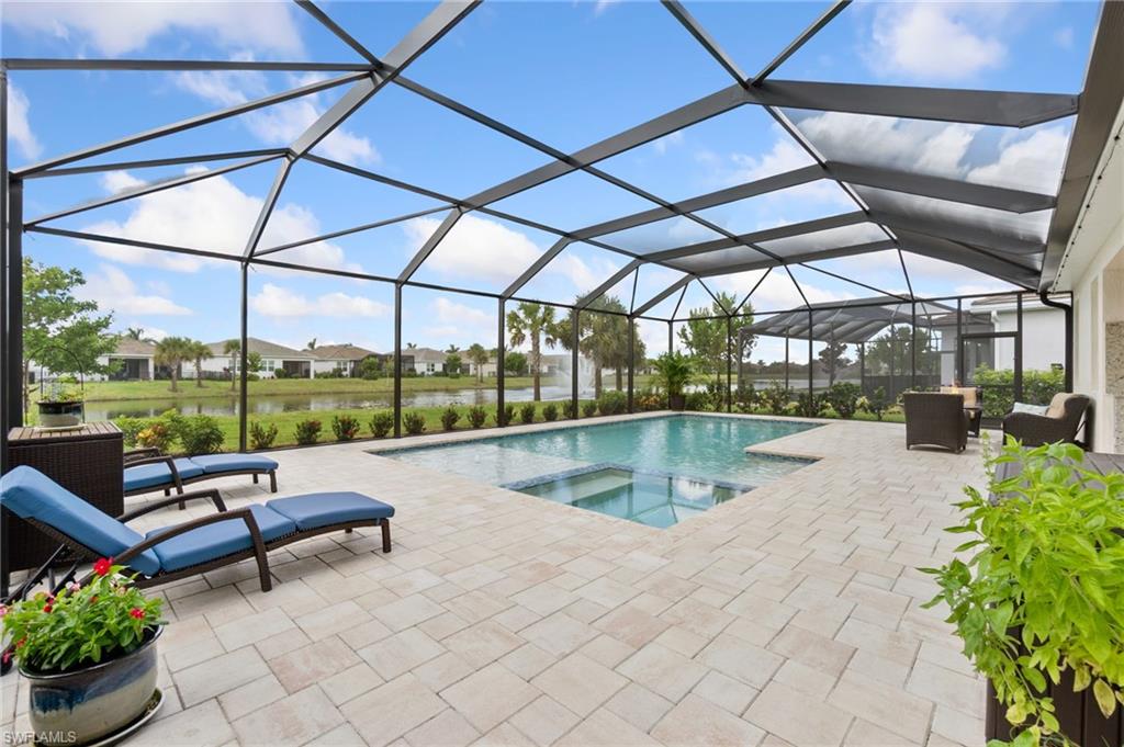 Welcome to 28140 Captiva Shell Loop—an exquisite lakefront home in the highly desirable Seasons at Bonita Springs community. This upgraded 3-bedroom, 3-bathroom residence with a spacious den offers the perfect balance of refined elegance, modern functionality, and resort-style outdoor living. From the moment you arrive, the curb appeal is undeniable with a paver driveway, meticulously manicured landscaping, and a charming stone-accented façade that sets the tone for what’s to come inside. Step through the front door into an expansive open-concept layout that feels both grand and inviting. Thoughtfully designed with wide-plank wood-style vinyl flooring, crown molding, and upgraded lighting throughout, the living area seamlessly flows into the dining space and chef’s kitchen. The gourmet kitchen is truly the heart of the home, boasting white shaker cabinetry, gleaming quartz countertops, a large island with seating, stainless steel appliances, a subway tile backsplash, built-in wine rack, and a separate beverage fridge—perfect for both casual meals and entertaining. The primary suite is a peaceful retreat, complete with two walk-in closets and a spa-like en-suite bathroom featuring dual vanities, a glass walk-in shower, and a luxurious soaking tub. Two additional guest bedrooms and bathrooms are tucked away in their own wings for optimal privacy, while the den offers flexible space for a home office, creative studio, or even a fourth bedroom. Open the triple sliders and step into your private outdoor paradise. The screened-in lanai features an expansive saltwater pool with a sun shelf, water features, a raised spa, and unobstructed lake views. There’s ample space to dine, lounge, or entertain beneath the covered patio or poolside under the Florida sun. Whether hosting weekend BBQs or enjoying quiet sunset evenings, this outdoor space is the ultimate escape. Living in Seasons at Bonita Springs means enjoying a vibrant, amenity-rich lifestyle. The gated community includes a resort-style pool, clubhouse, fitness center, tennis and pickleball courts, a dog park, walking trails, and more—all with low HOA fees. Located just minutes from Coconut Point, Miromar Outlets, and Mercato for shopping and dining, and close to top-rated hospitals and the white-sand beaches of Bonita Beach and Barefoot Beach. This move-in-ready gem is ideal as a full-time residence, vacation home, or investment property. With a versatile floor plan, stunning lake views, and unmatched community features, 28140 Captiva Shell Loop delivers everything you’ve been searching for in Southwest Florida living.