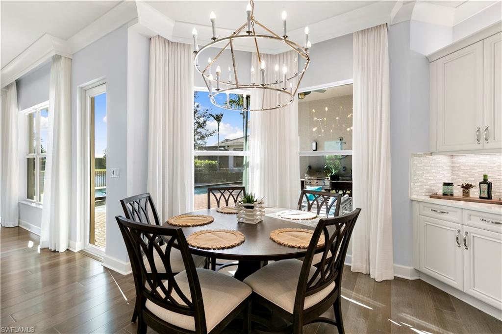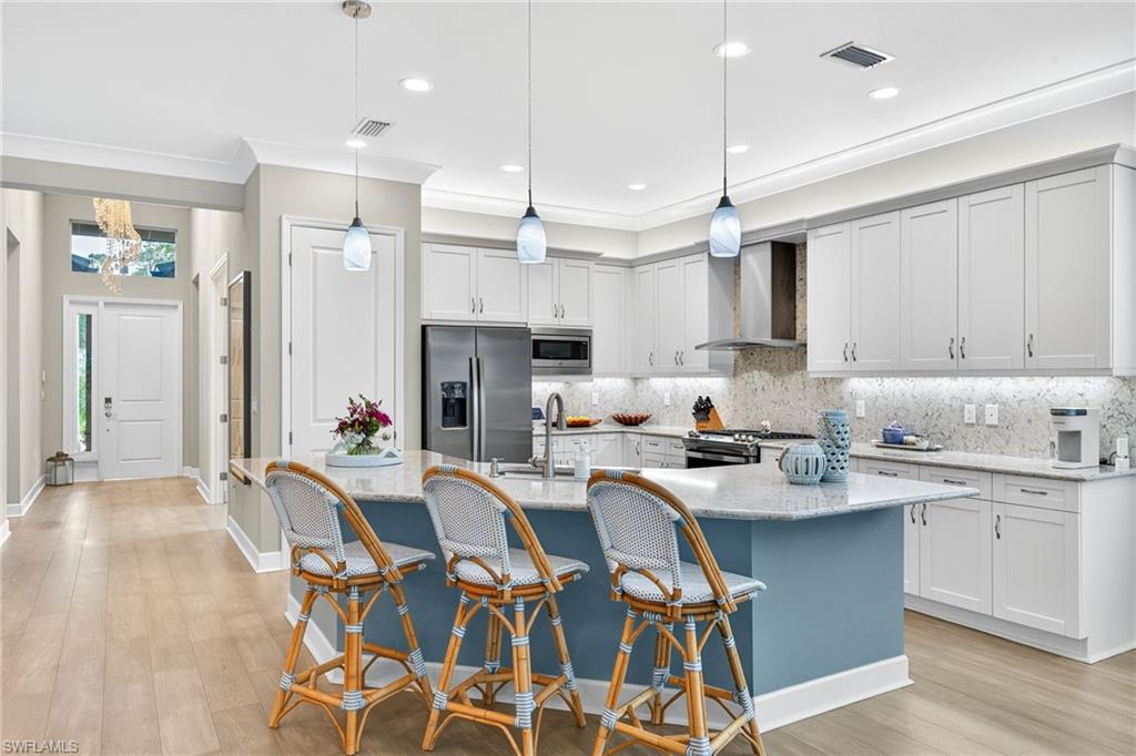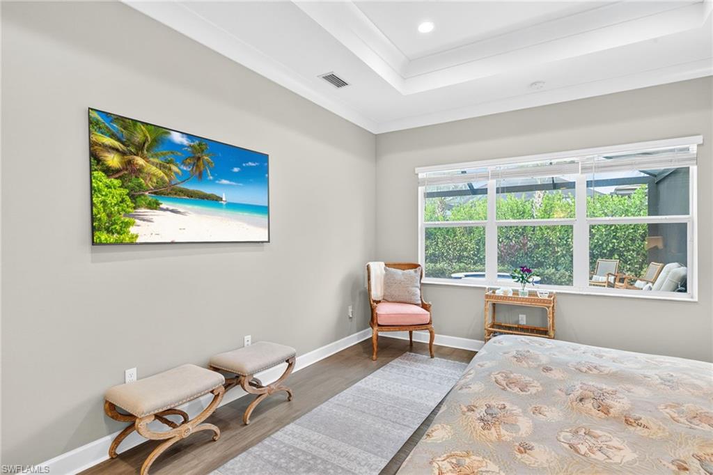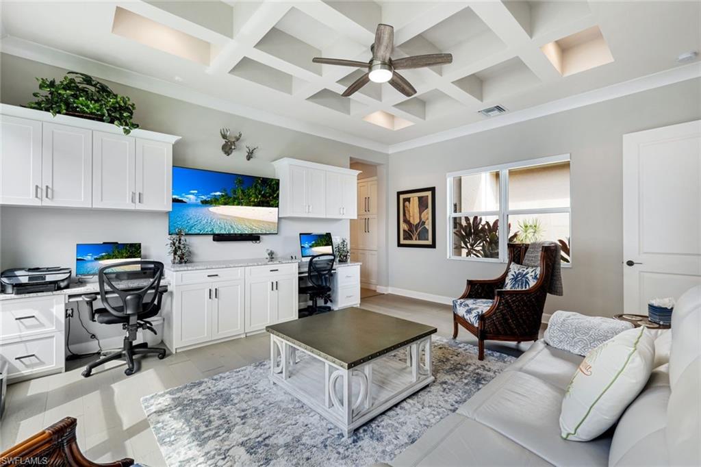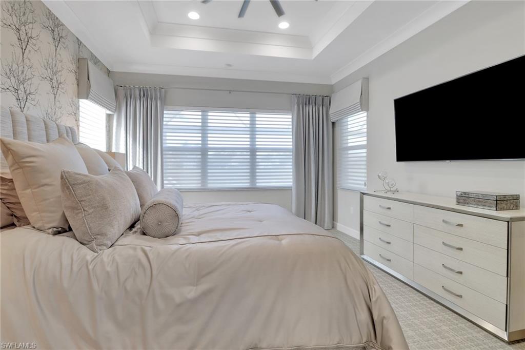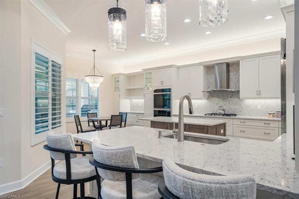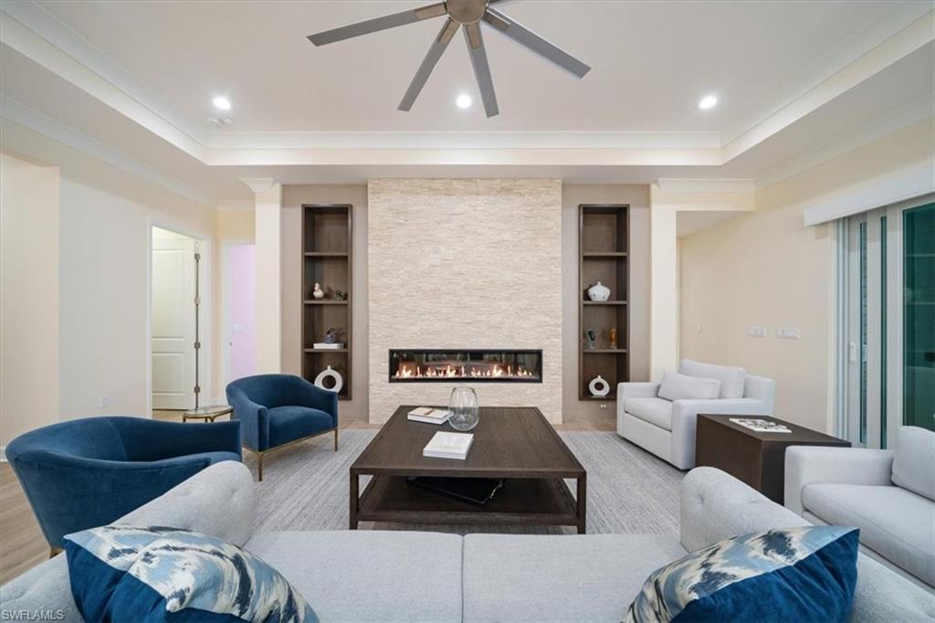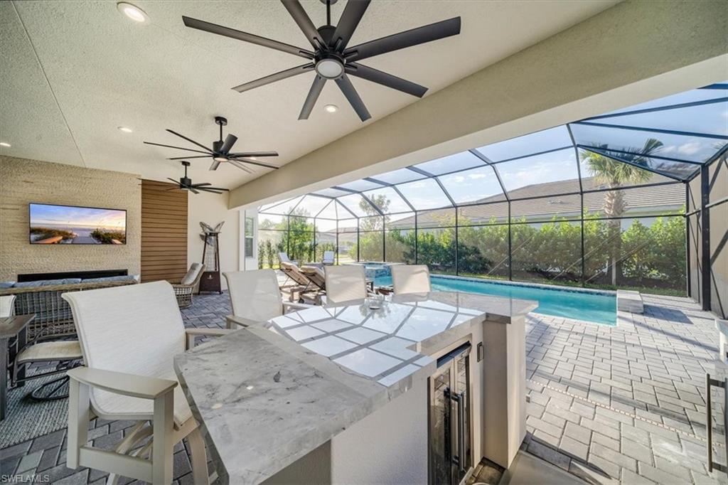 Experience luxury living in this exquisitely upgraded 4-bedroom, 3.5-bathroom Carlyle in Bonita Springs most luxurious 55+ community, Valencia Bonita. Offering 3,102 square feet of elegant interior space, this residence is filled with thoughtful, high-end enhancements throughout. The impressive exterior features upgraded front and lanai lighting, with a custom fixtures, Storm Smart hurricane protection, and a Generac whole-home generator for peace of mind. The extended lanai is an entertainer’s dream with a full outdoor kitchen, 65” TV, pool and spa, fenced yard, and picture window screen enclosure overlooking a lush Eastern facing Preserve view. Inside, sophistication meets function with crown molding, fresh designer paint, rich dark gray doors, and daylight LED lighting. The gourmet kitchen includes GE appliances, a designer backsplash, and upgraded lighting, while the great room showcases a detailed custom ceiling, upscale fixtures, built-in entertainment wall, electric fireplace, and 75” TV. A stylish wet bar with a wine fridge and custom finishes complements the coffered-ceiling dining room and wine cabinet. The primary suite is a private retreat with blackout power shades, coffered ceilings, dual triple-decked closets, upgraded carpet, and a spa-like bath featuring a sliding barn door, upgraded fixtures, and roll-out shelving. The office/4th bedroom is fully outfitted with a closet, TV, accent wall, motorized shades, and ceiling fan. Each guest room showcases custom ceiling details, TVs, power-shaded windows, and elegant finishes. Both guest baths are equally refined with upgraded faucets, wallpaper accents, and pull-out cabinetry. Additional highlights include an epoxy-coated garage with built-in storage and an extra fridge, a well-appointed laundry room with custom built-ins, Samsung appliances, and countless designer upgrades inside and out.