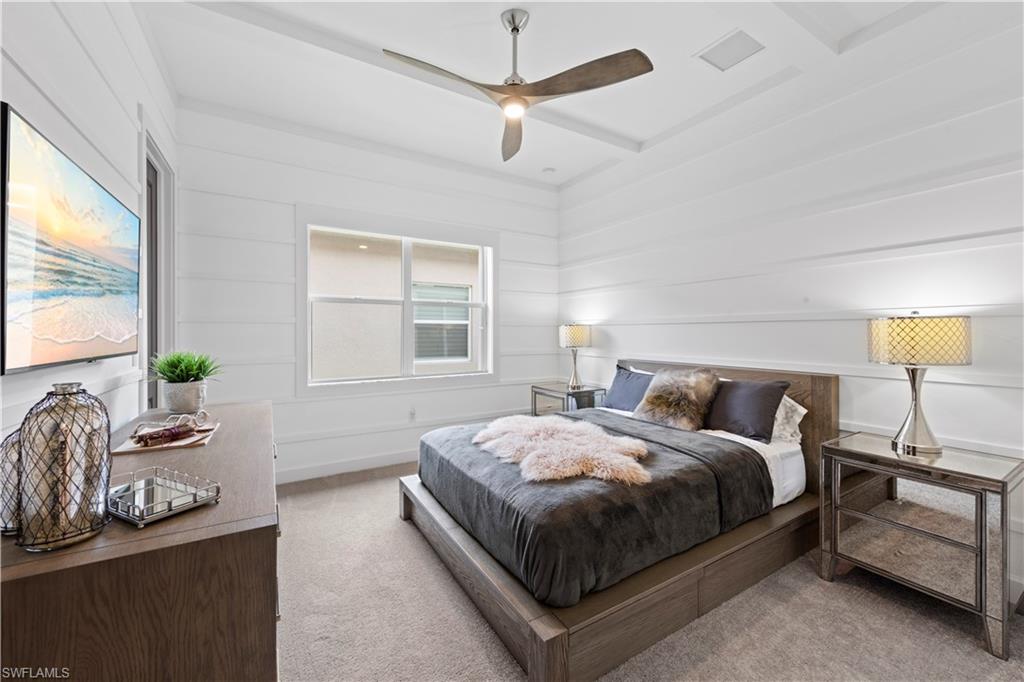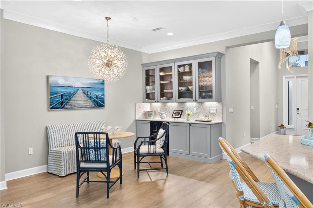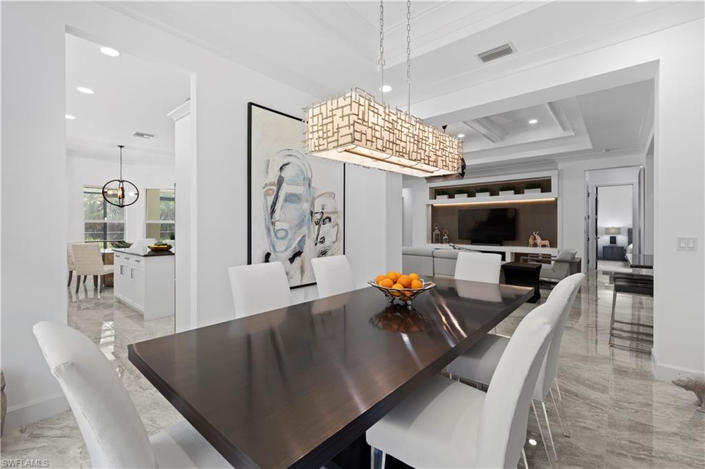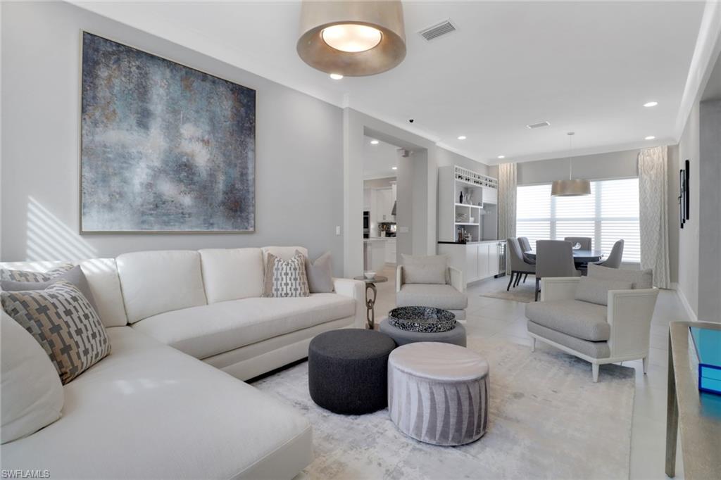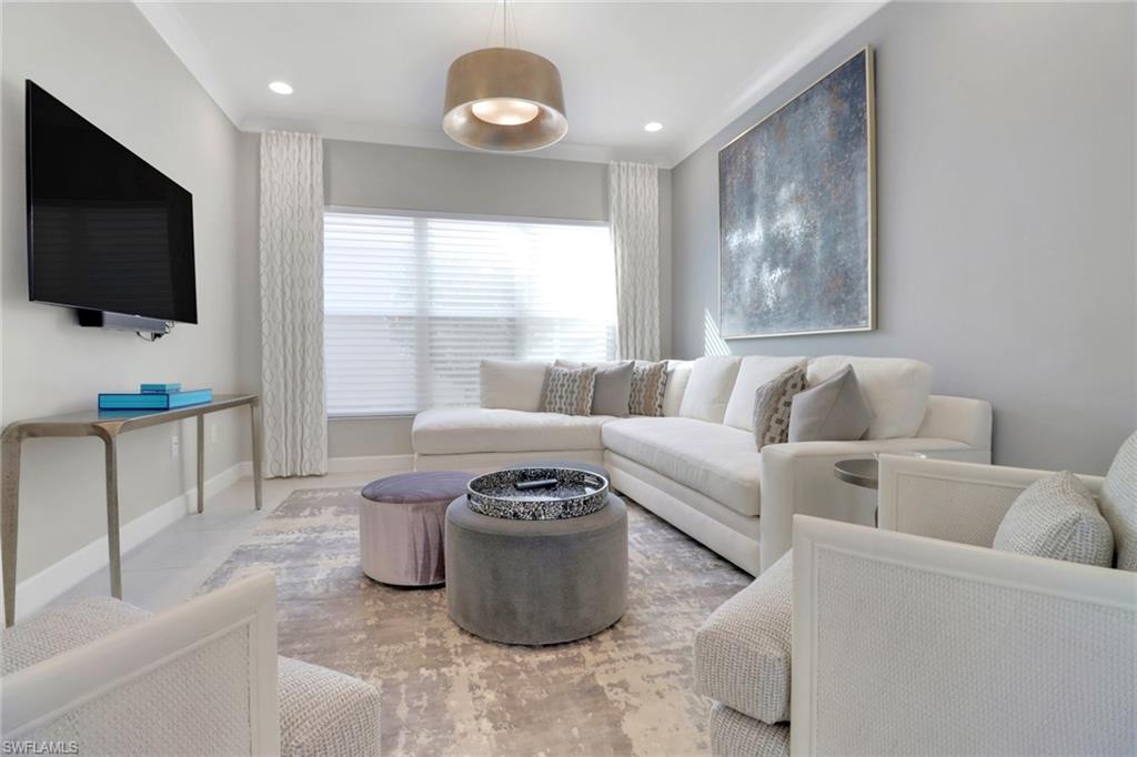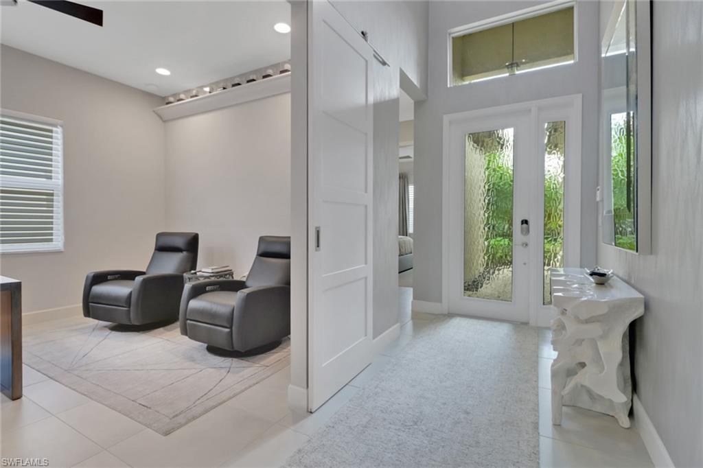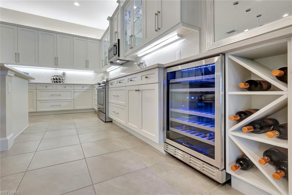 Experience luxury living in this exquisitely upgraded 4-bedroom, 3.5-bathroom Carlyle in Bonita Springs most luxurious 55+ community, Valencia Bonita. Offering 3,102 square feet of elegant interior space, this residence is filled with thoughtful, high-end enhancements throughout. The impressive exterior features upgraded front and lanai lighting, with a custom fixtures, Storm Smart hurricane protection, and a Generac whole-home generator for peace of mind. The extended lanai is an entertainer’s dream with a full outdoor kitchen, 65” TV, pool and spa, fenced yard, and picture window screen enclosure overlooking a lush Eastern facing Preserve view. Inside, sophistication meets function with crown molding, fresh designer paint, rich dark gray doors, and daylight LED lighting. The gourmet kitchen includes GE appliances, a designer backsplash, and upgraded lighting, while the great room showcases a detailed custom ceiling, upscale fixtures, built-in entertainment wall, electric fireplace, and 75” TV. A stylish wet bar with a wine fridge and custom finishes complements the coffered-ceiling dining room and wine cabinet. The primary suite is a private retreat with blackout power shades, coffered ceilings, dual triple-decked closets, upgraded carpet, and a spa-like bath featuring a sliding barn door, upgraded fixtures, and roll-out shelving. The office/4th bedroom is fully outfitted with a closet, TV, accent wall, motorized shades, and ceiling fan. Each guest room showcases custom ceiling details, TVs, power-shaded windows, and elegant finishes. Both guest baths are equally refined with upgraded faucets, wallpaper accents, and pull-out cabinetry. Additional highlights include an epoxy-coated garage with built-in storage and an extra fridge, a well-appointed laundry room with custom built-ins, Samsung appliances, and countless designer upgrades inside and out.