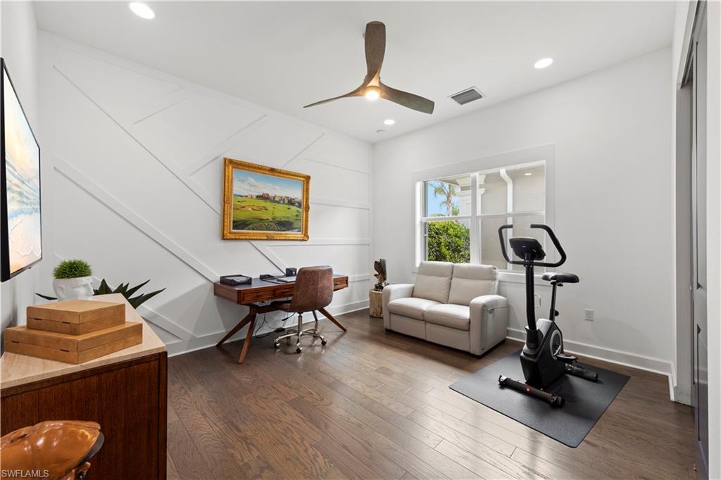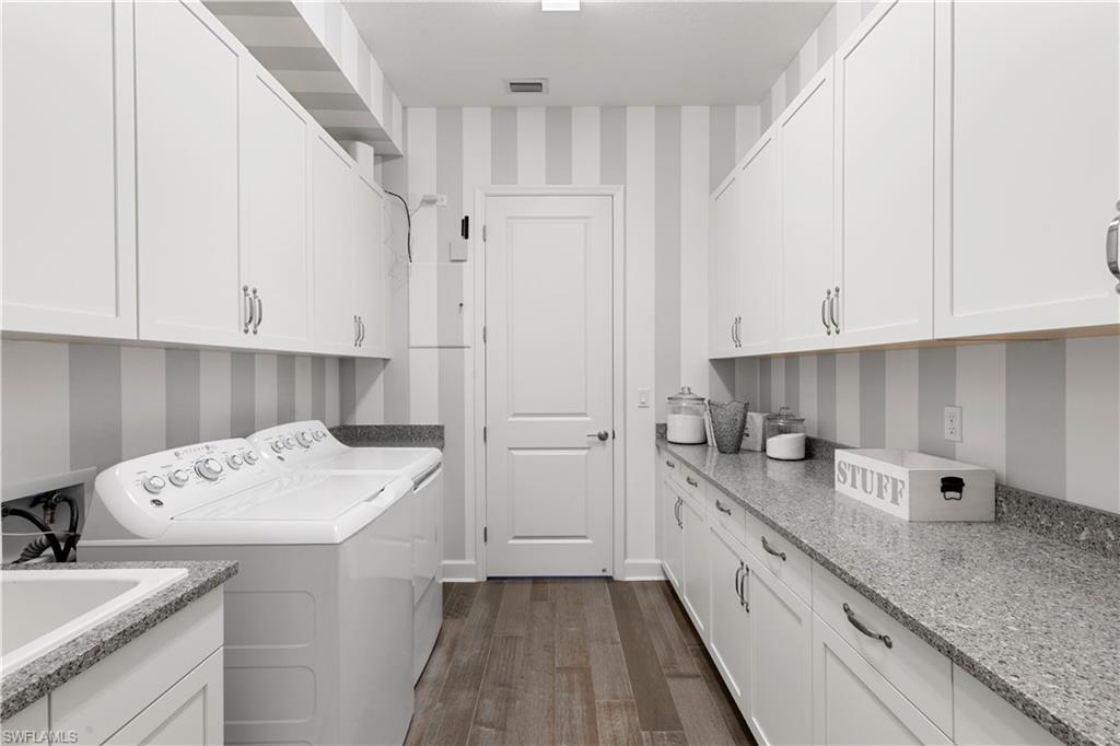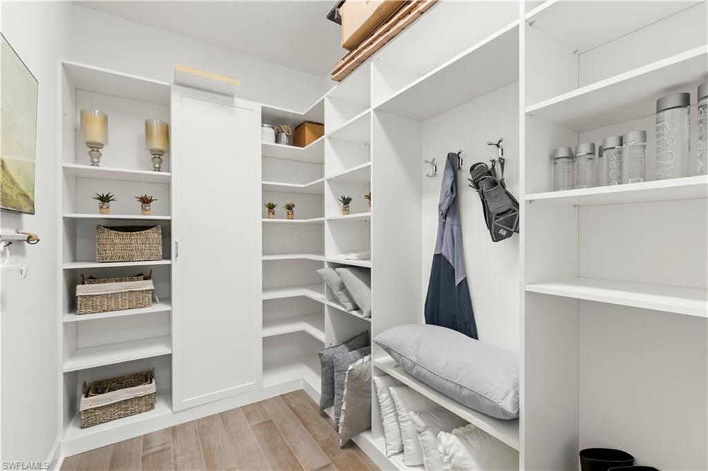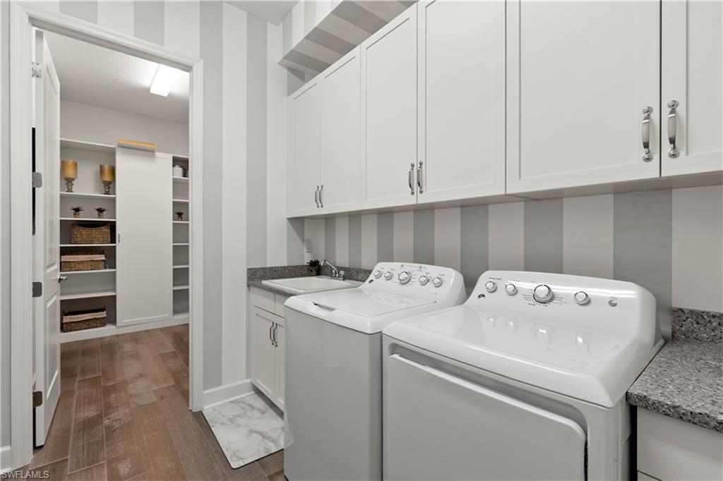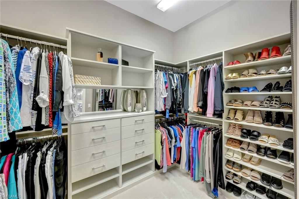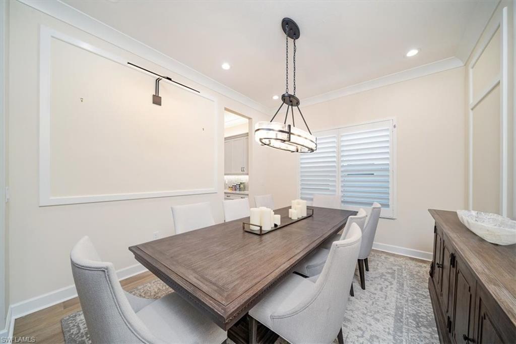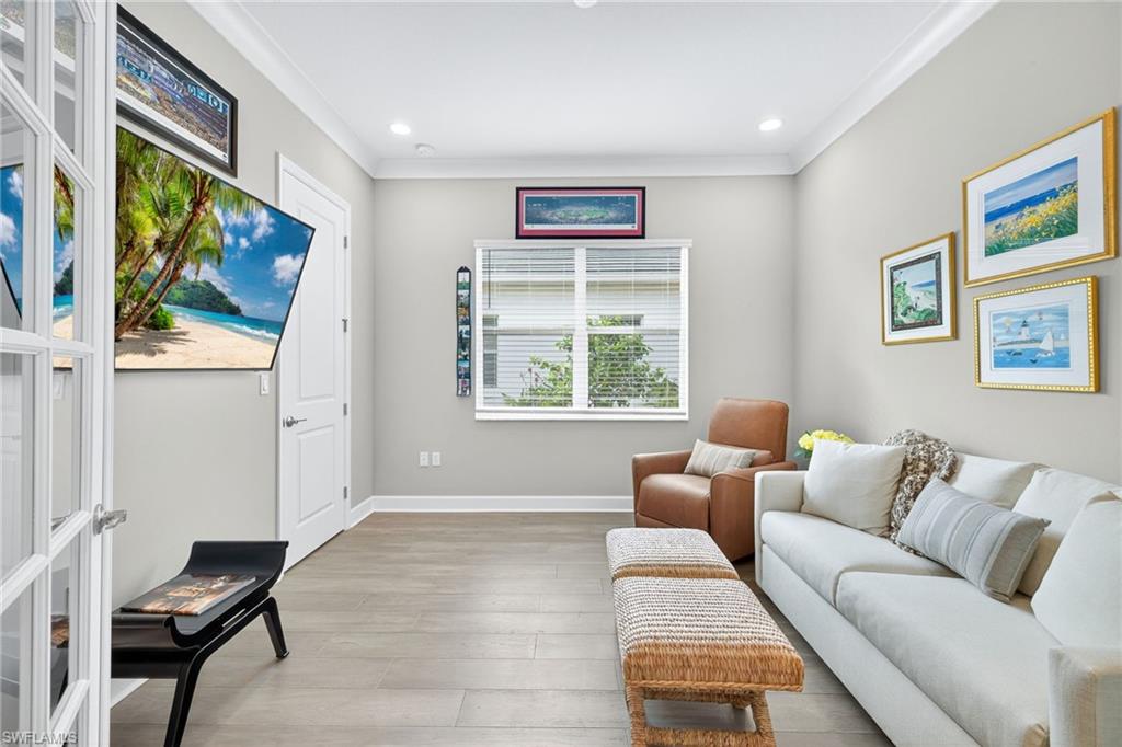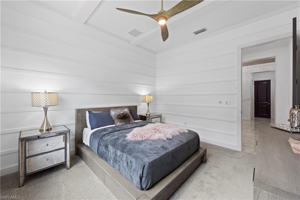 Experience luxury living in this exquisitely upgraded 4-bedroom, 3.5-bathroom Carlyle in Bonita Springs most luxurious 55+ community, Valencia Bonita. Offering 3,102 square feet of elegant interior space, this residence is filled with thoughtful, high-end enhancements throughout. The impressive exterior features upgraded front and lanai lighting, with a custom fixtures, Storm Smart hurricane protection, and a Generac whole-home generator for peace of mind. The extended lanai is an entertainer’s dream with a full outdoor kitchen, 65” TV, pool and spa, fenced yard, and picture window screen enclosure overlooking a lush Eastern facing Preserve view. Inside, sophistication meets function with crown molding, fresh designer paint, rich dark gray doors, and daylight LED lighting. The gourmet kitchen includes GE appliances, a designer backsplash, and upgraded lighting, while the great room showcases a detailed custom ceiling, upscale fixtures, built-in entertainment wall, electric fireplace, and 75” TV. A stylish wet bar with a wine fridge and custom finishes complements the coffered-ceiling dining room and wine cabinet. The primary suite is a private retreat with blackout power shades, coffered ceilings, dual triple-decked closets, upgraded carpet, and a spa-like bath featuring a sliding barn door, upgraded fixtures, and roll-out shelving. The office/4th bedroom is fully outfitted with a closet, TV, accent wall, motorized shades, and ceiling fan. Each guest room showcases custom ceiling details, TVs, power-shaded windows, and elegant finishes. Both guest baths are equally refined with upgraded faucets, wallpaper accents, and pull-out cabinetry. Additional highlights include an epoxy-coated garage with built-in storage and an extra fridge, a well-appointed laundry room with custom built-ins, Samsung appliances, and countless designer upgrades inside and out.