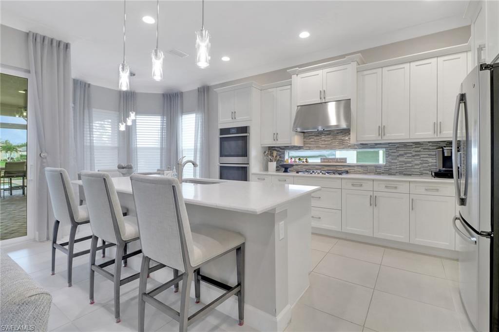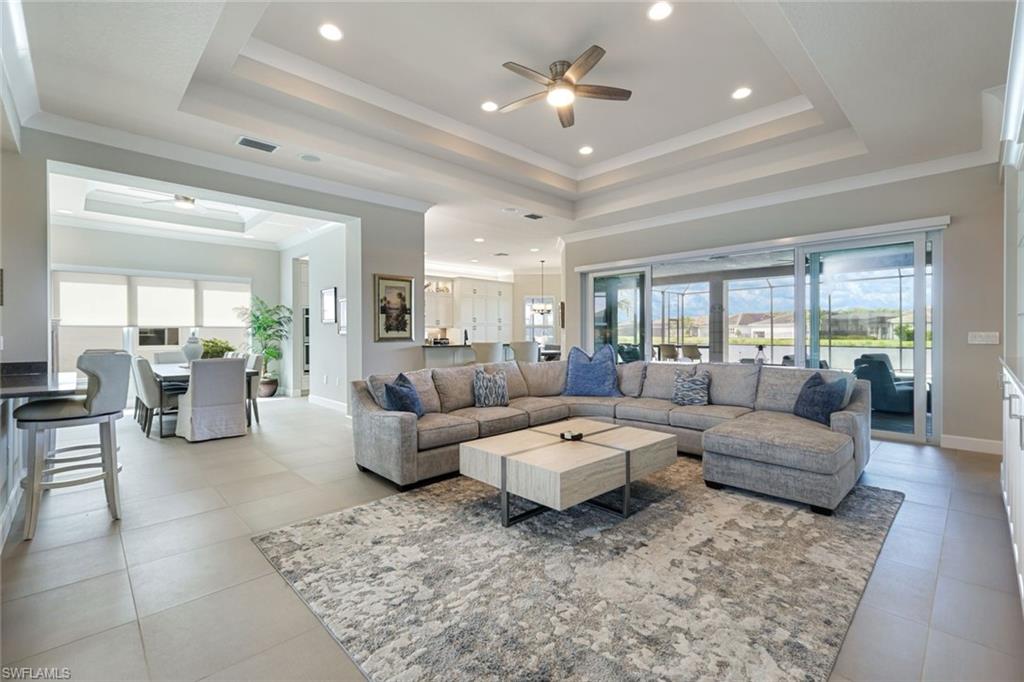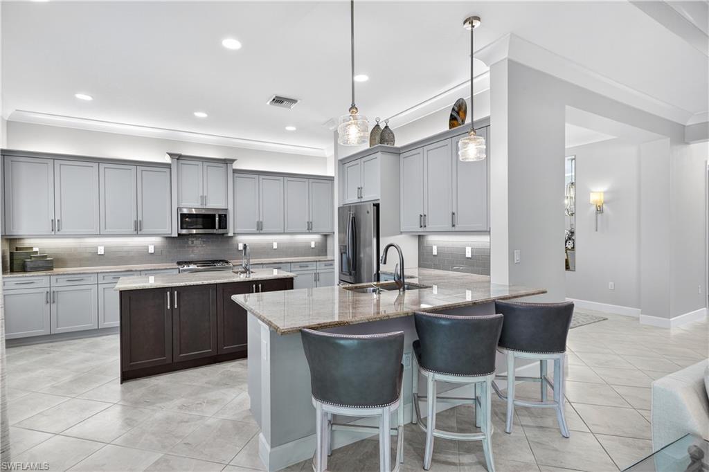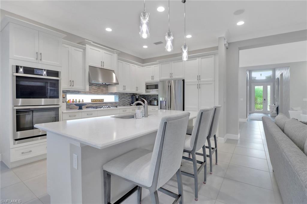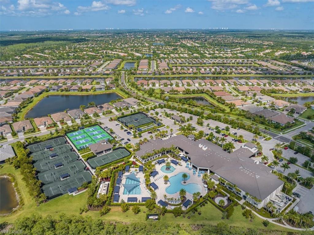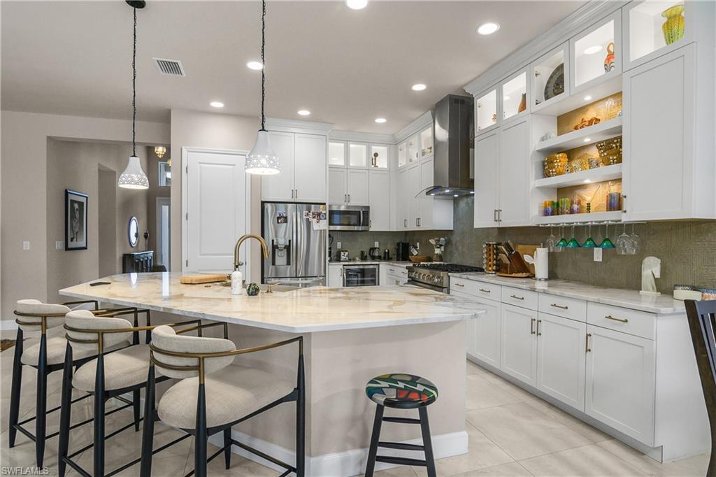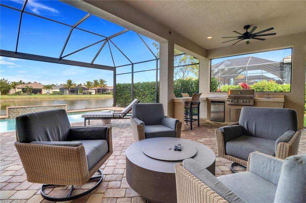 TURNKEY FURNISHED AND JUST REDUCED $50,000! Robb & Stucky designer furniture & accessories throughout home. This top selling NAPA floor plan for GL Homes is located in Valencia Bonita, a 55+ Active Adult manned gated community which provides resort living at its best. As you enter the home through the upgraded glass front doors, the first thing you notice is one of the best lake views in the community. This view on the largest lake, is really appreciated when relaxing or entertaining on the oversized covered back patio watching the beautiful sunset. At the clubhouse, you have access to all the resort amenities, including the 45,000 sq. ft. clubhouse with indoor and outdoor restaurants, bars, many pools & more. This desired floor plan was designed to offer a bright open great room concept with 4 bedrooms each with their own private bathrooms plus a versatile den along with a half bath and a spacious 3-car epoxied floored garage. This well appointed home with many upgrades and striking designer chandeliers provides the ultimate Florida lifestyle. Highlights include a custom outdoor kitchen with a four season outdoor refrigerator, impact glass, custom built-ins in the den & dining area, providing pull out lower drawers, quartz countertop with wine chiller, upgraded 17” tile flooring in main living area and den, large walk-in customize closets in the primary bedroom along with new carpeting and motorized shades on all windows. The gourmet kitchen boasts upgraded appliances with a BOSCH natural gas range, upgraded sparkling quartz countertops, 42” upper white wood cabinetry with above & undercabinet lighting, along with molding and valence on cabinets, pull out base drawers along with upper glass cabinet fronts with lighting & a large cabinet pantry. Also provided is a large single bowl stainless steel undermount sink with a modernized chrome faucet and expanded overhead LED lighting. The primary suite bathroom offers dual vanities, white wood raised panel cabinets, quartz countertops, large walk-in shower, soaking tub, a custom cabinet linen closet & builder upgraded tile package for flooring and shower walls. All other bathrooms come appointed with quartz countertops, white wood raised panel cabinets, banjo feature on senior height toilets and builder upgraded tile packages. Valencia Bonita is a top selling Active Adult 55+ community in Bonita Springs with a spectacular clubhouse and amenities! The clubhouse is located on a 10-acre complex offering a resort style swimming pool, 60 ft. lap swimming pool, resistance exercise pool, grandchildren wading pool, racket center pro shop, tennis courts, pickelball courts, bocce courts, dog park & fire pit. Residents also enjoy performances and social events in the grand ballroom, fully equipped fitness center, spa with treatment rooms & nail salon, restaurant with indoor and outdoor bars, card rooms, sports lounge, arts and crafts room, yoga/exercise, studio, ping-pong, massage rooms & so much more!