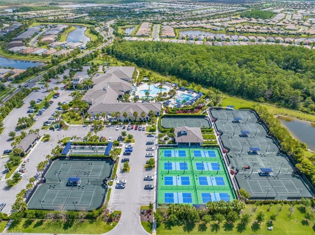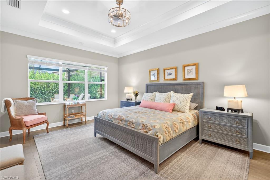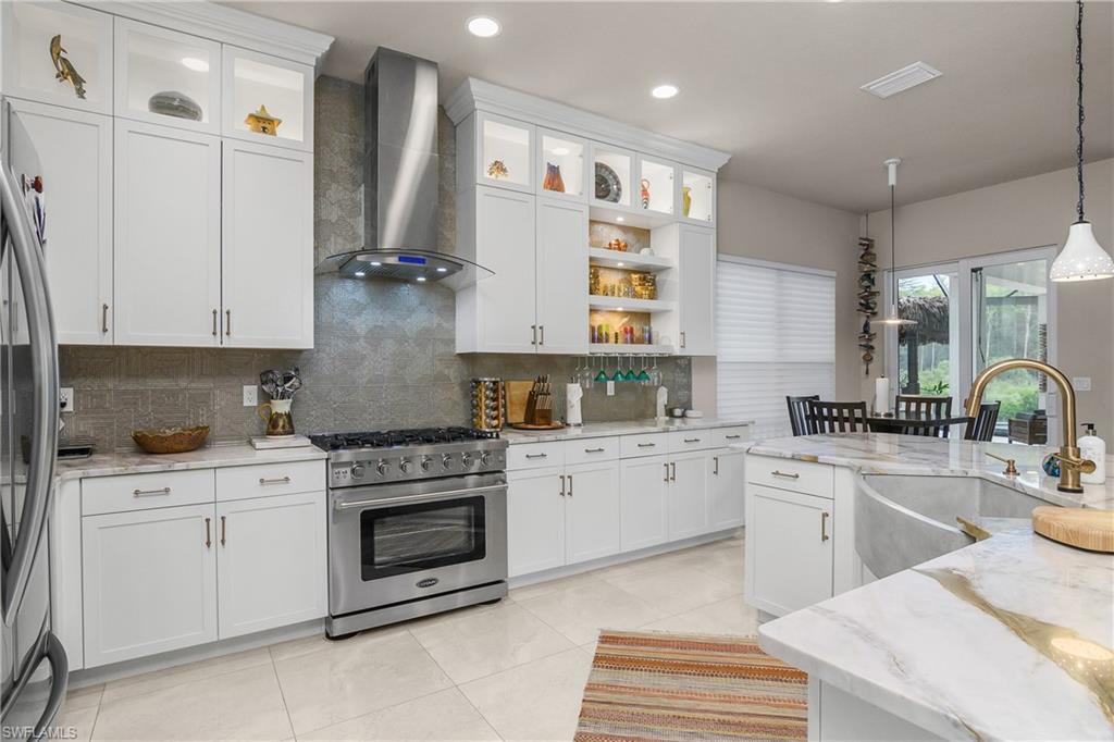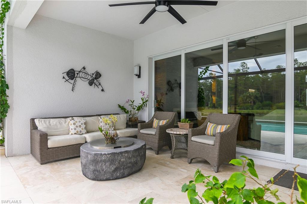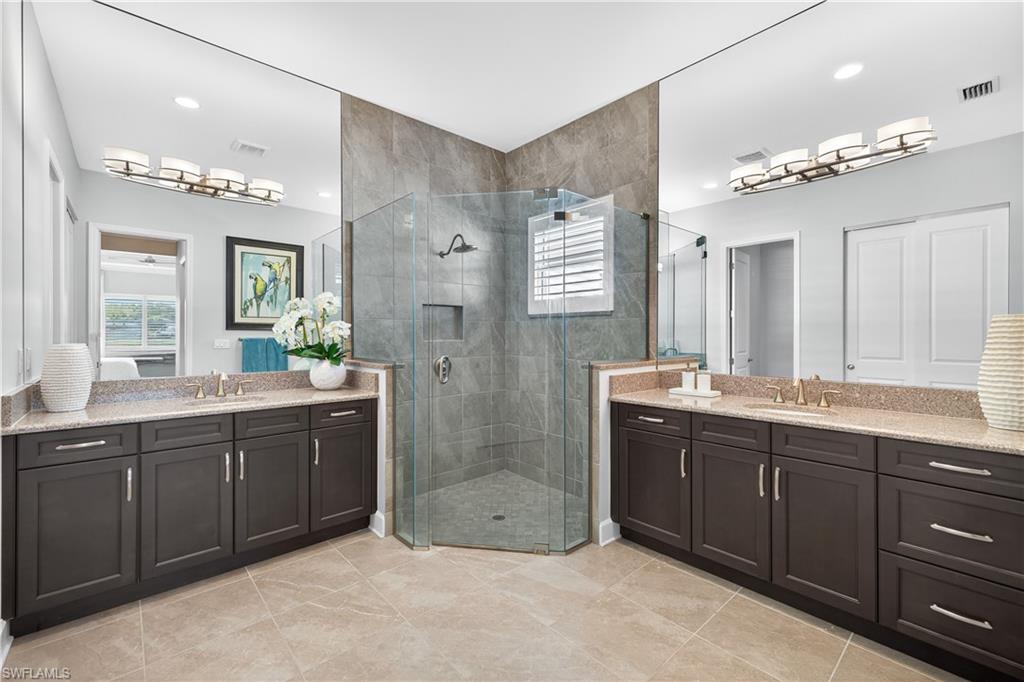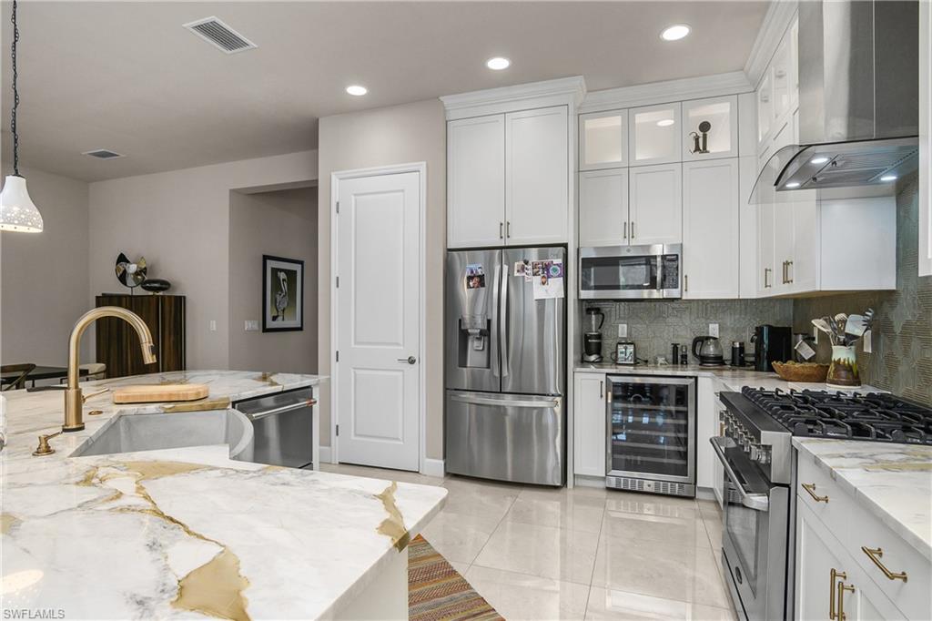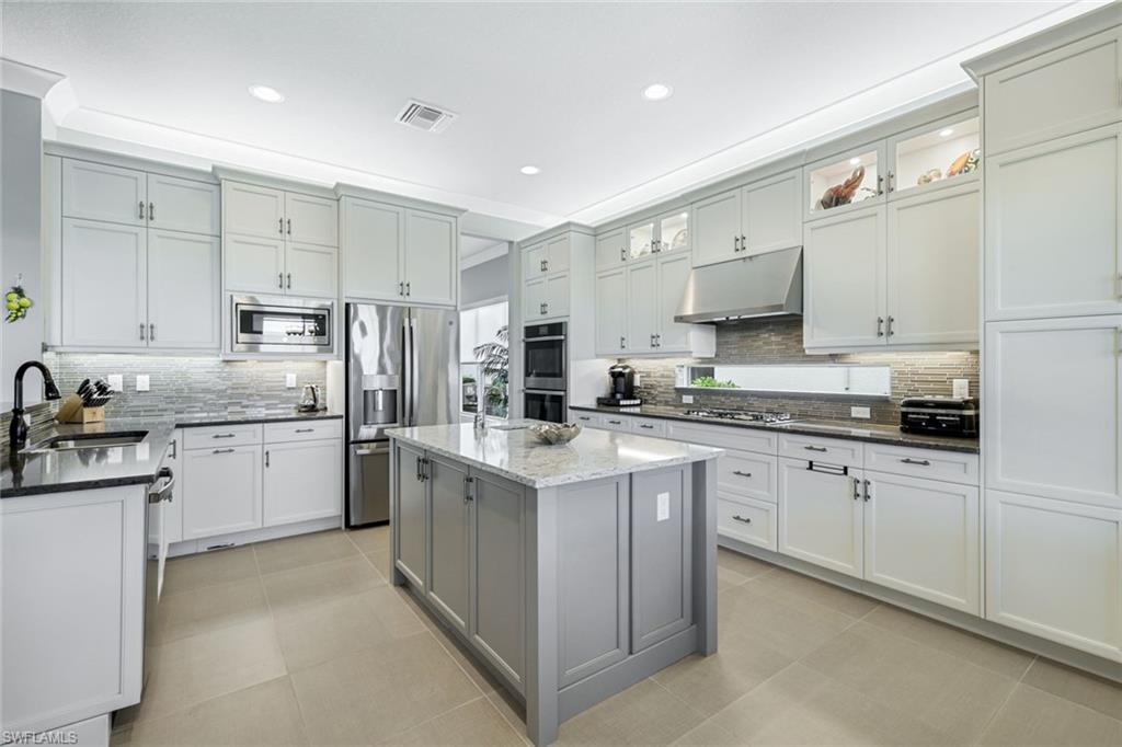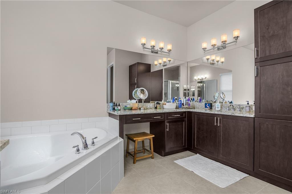 TURNKEY FURNISHED AND JUST REDUCED $50,000! Robb & Stucky designer furniture & accessories throughout home. This top selling NAPA floor plan for GL Homes is located in Valencia Bonita, a 55+ Active Adult manned gated community which provides resort living at its best. As you enter the home through the upgraded glass front doors, the first thing you notice is one of the best lake views in the community. This view on the largest lake, is really appreciated when relaxing or entertaining on the oversized covered back patio watching the beautiful sunset. At the clubhouse, you have access to all the resort amenities, including the 45,000 sq. ft. clubhouse with indoor and outdoor restaurants, bars, many pools & more. This desired floor plan was designed to offer a bright open great room concept with 4 bedrooms each with their own private bathrooms plus a versatile den along with a half bath and a spacious 3-car epoxied floored garage. This well appointed home with many upgrades and striking designer chandeliers provides the ultimate Florida lifestyle. Highlights include a custom outdoor kitchen with a four season outdoor refrigerator, impact glass, custom built-ins in the den & dining area, providing pull out lower drawers, quartz countertop with wine chiller, upgraded 17” tile flooring in main living area and den, large walk-in customize closets in the primary bedroom along with new carpeting and motorized shades on all windows. The gourmet kitchen boasts upgraded appliances with a BOSCH natural gas range, upgraded sparkling quartz countertops, 42” upper white wood cabinetry with above & undercabinet lighting, along with molding and valence on cabinets, pull out base drawers along with upper glass cabinet fronts with lighting & a large cabinet pantry. Also provided is a large single bowl stainless steel undermount sink with a modernized chrome faucet and expanded overhead LED lighting. The primary suite bathroom offers dual vanities, white wood raised panel cabinets, quartz countertops, large walk-in shower, soaking tub, a custom cabinet linen closet & builder upgraded tile package for flooring and shower walls. All other bathrooms come appointed with quartz countertops, white wood raised panel cabinets, banjo feature on senior height toilets and builder upgraded tile packages. Valencia Bonita is a top selling Active Adult 55+ community in Bonita Springs with a spectacular clubhouse and amenities! The clubhouse is located on a 10-acre complex offering a resort style swimming pool, 60 ft. lap swimming pool, resistance exercise pool, grandchildren wading pool, racket center pro shop, tennis courts, pickelball courts, bocce courts, dog park & fire pit. Residents also enjoy performances and social events in the grand ballroom, fully equipped fitness center, spa with treatment rooms & nail salon, restaurant with indoor and outdoor bars, card rooms, sports lounge, arts and crafts room, yoga/exercise, studio, ping-pong, massage rooms & so much more!
