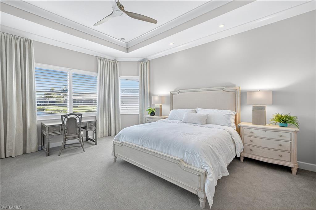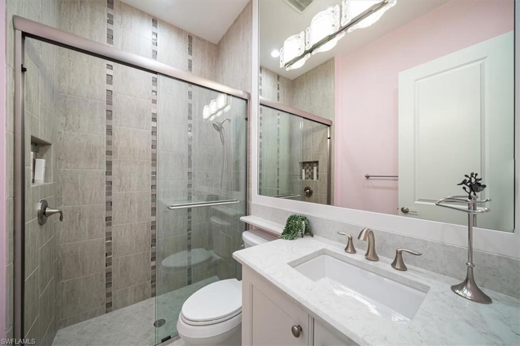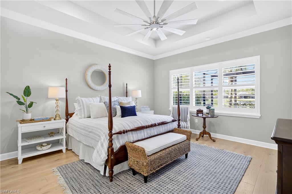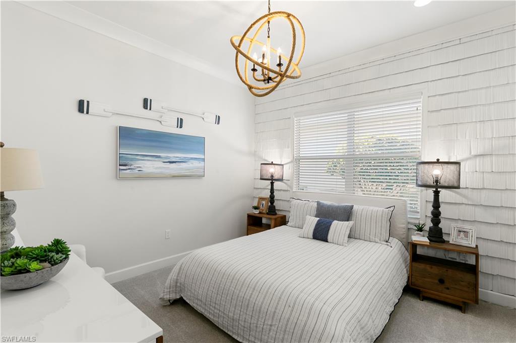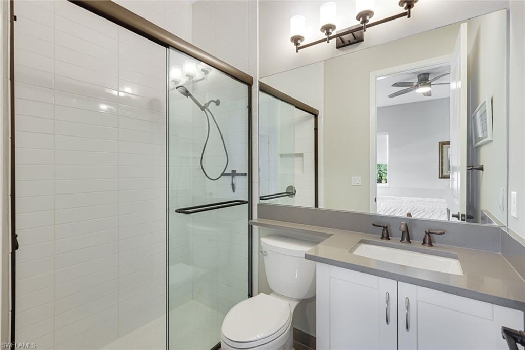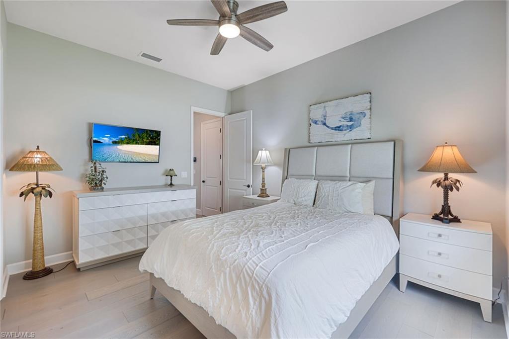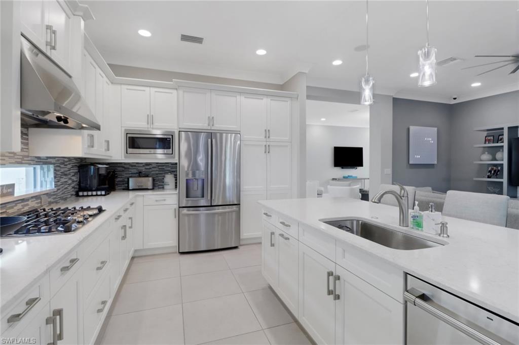 TURNKEY FURNISHED AND JUST REDUCED $50,000! Robb & Stucky designer furniture & accessories throughout home. This top selling NAPA floor plan for GL Homes is located in Valencia Bonita, a 55+ Active Adult manned gated community which provides resort living at its best. As you enter the home through the upgraded glass front doors, the first thing you notice is one of the best lake views in the community. This view on the largest lake, is really appreciated when relaxing or entertaining on the oversized covered back patio watching the beautiful sunset. At the clubhouse, you have access to all the resort amenities, including the 45,000 sq. ft. clubhouse with indoor and outdoor restaurants, bars, many pools & more. This desired floor plan was designed to offer a bright open great room concept with 4 bedrooms each with their own private bathrooms plus a versatile den along with a half bath and a spacious 3-car epoxied floored garage. This well appointed home with many upgrades and striking designer chandeliers provides the ultimate Florida lifestyle. Highlights include a custom outdoor kitchen with a four season outdoor refrigerator, impact glass, custom built-ins in the den & dining area, providing pull out lower drawers, quartz countertop with wine chiller, upgraded 17” tile flooring in main living area and den, large walk-in customize closets in the primary bedroom along with new carpeting and motorized shades on all windows. The gourmet kitchen boasts upgraded appliances with a BOSCH natural gas range, upgraded sparkling quartz countertops, 42” upper white wood cabinetry with above & undercabinet lighting, along with molding and valence on cabinets, pull out base drawers along with upper glass cabinet fronts with lighting & a large cabinet pantry. Also provided is a large single bowl stainless steel undermount sink with a modernized chrome faucet and expanded overhead LED lighting. The primary suite bathroom offers dual vanities, white wood raised panel cabinets, quartz countertops, large walk-in shower, soaking tub, a custom cabinet linen closet & builder upgraded tile package for flooring and shower walls. All other bathrooms come appointed with quartz countertops, white wood raised panel cabinets, banjo feature on senior height toilets and builder upgraded tile packages. Valencia Bonita is a top selling Active Adult 55+ community in Bonita Springs with a spectacular clubhouse and amenities! The clubhouse is located on a 10-acre complex offering a resort style swimming pool, 60 ft. lap swimming pool, resistance exercise pool, grandchildren wading pool, racket center pro shop, tennis courts, pickelball courts, bocce courts, dog park & fire pit. Residents also enjoy performances and social events in the grand ballroom, fully equipped fitness center, spa with treatment rooms & nail salon, restaurant with indoor and outdoor bars, card rooms, sports lounge, arts and crafts room, yoga/exercise, studio, ping-pong, massage rooms & so much more!