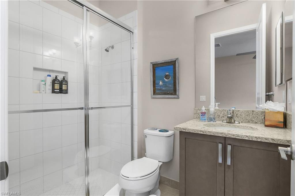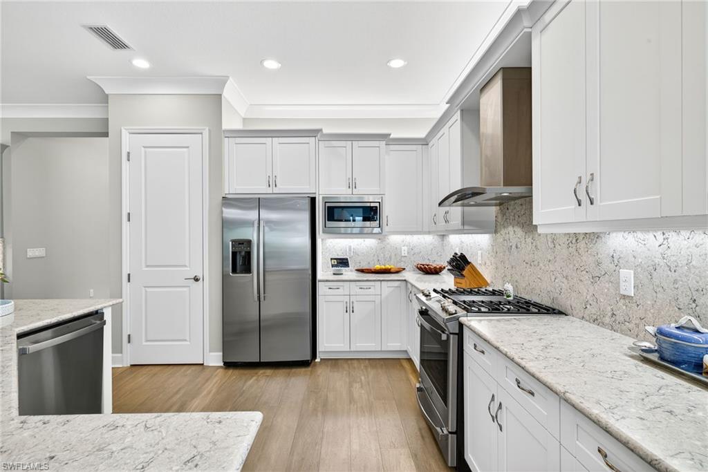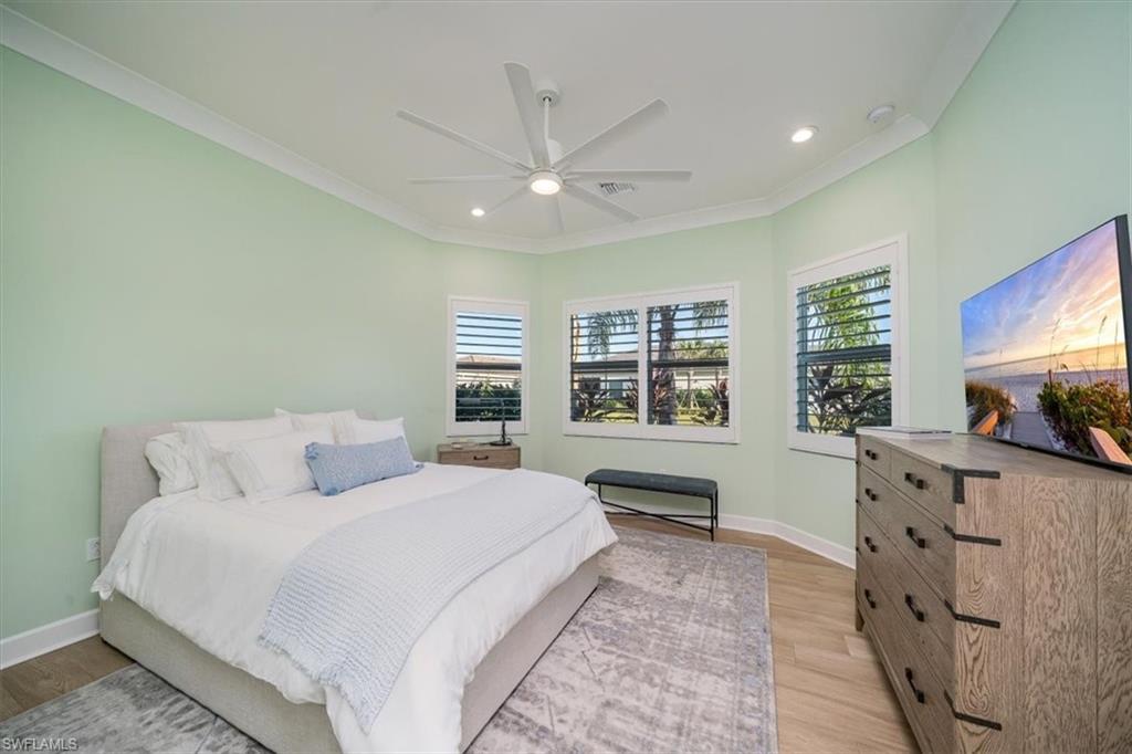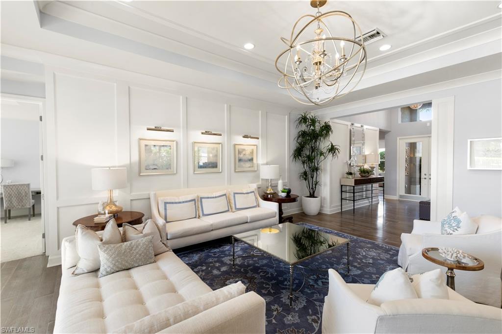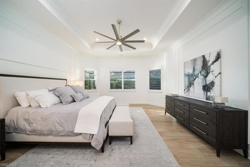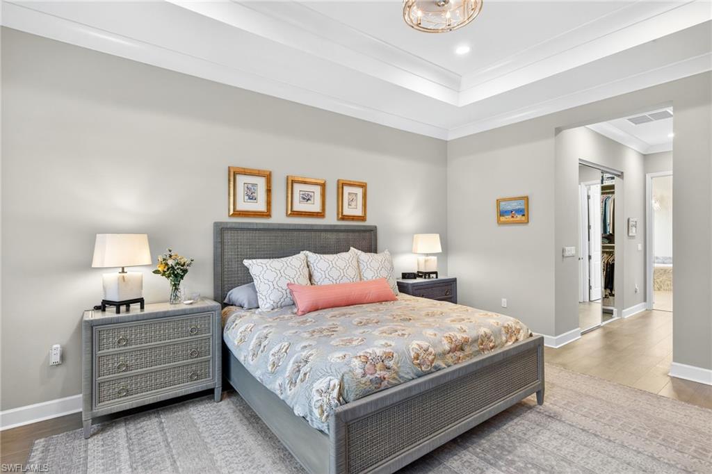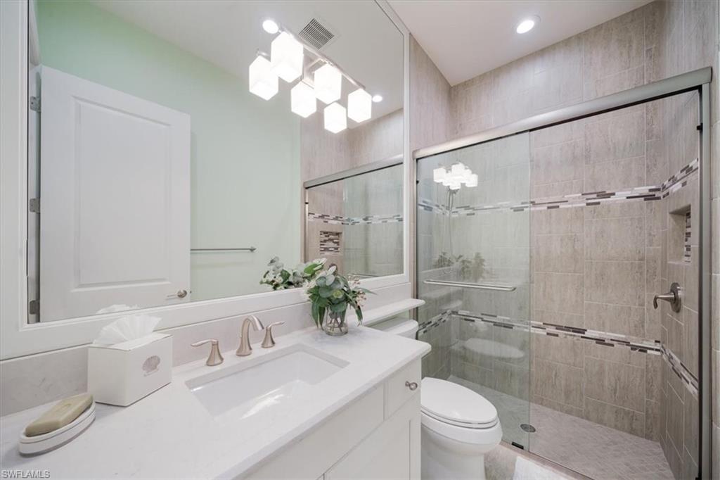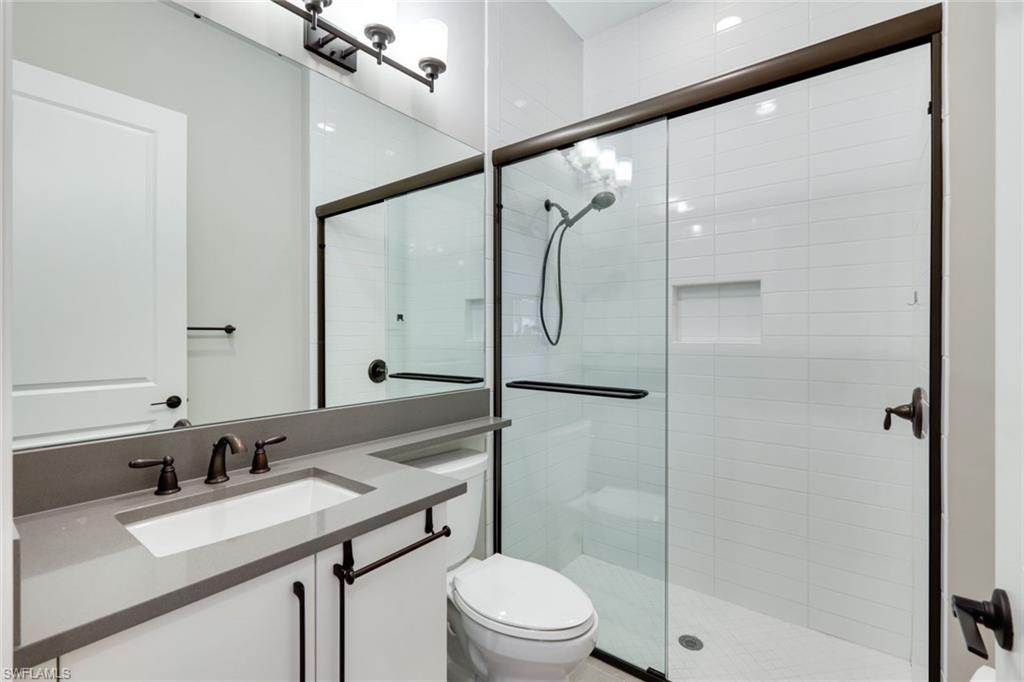 TURNKEY FURNISHED AND JUST REDUCED $50,000! Robb & Stucky designer furniture & accessories throughout home. This top selling NAPA floor plan for GL Homes is located in Valencia Bonita, a 55+ Active Adult manned gated community which provides resort living at its best. As you enter the home through the upgraded glass front doors, the first thing you notice is one of the best lake views in the community. This view on the largest lake, is really appreciated when relaxing or entertaining on the oversized covered back patio watching the beautiful sunset. At the clubhouse, you have access to all the resort amenities, including the 45,000 sq. ft. clubhouse with indoor and outdoor restaurants, bars, many pools & more. This desired floor plan was designed to offer a bright open great room concept with 4 bedrooms each with their own private bathrooms plus a versatile den along with a half bath and a spacious 3-car epoxied floored garage. This well appointed home with many upgrades and striking designer chandeliers provides the ultimate Florida lifestyle. Highlights include a custom outdoor kitchen with a four season outdoor refrigerator, impact glass, custom built-ins in the den & dining area, providing pull out lower drawers, quartz countertop with wine chiller, upgraded 17” tile flooring in main living area and den, large walk-in customize closets in the primary bedroom along with new carpeting and motorized shades on all windows. The gourmet kitchen boasts upgraded appliances with a BOSCH natural gas range, upgraded sparkling quartz countertops, 42” upper white wood cabinetry with above & undercabinet lighting, along with molding and valence on cabinets, pull out base drawers along with upper glass cabinet fronts with lighting & a large cabinet pantry. Also provided is a large single bowl stainless steel undermount sink with a modernized chrome faucet and expanded overhead LED lighting. The primary suite bathroom offers dual vanities, white wood raised panel cabinets, quartz countertops, large walk-in shower, soaking tub, a custom cabinet linen closet & builder upgraded tile package for flooring and shower walls. All other bathrooms come appointed with quartz countertops, white wood raised panel cabinets, banjo feature on senior height toilets and builder upgraded tile packages. Valencia Bonita is a top selling Active Adult 55+ community in Bonita Springs with a spectacular clubhouse and amenities! The clubhouse is located on a 10-acre complex offering a resort style swimming pool, 60 ft. lap swimming pool, resistance exercise pool, grandchildren wading pool, racket center pro shop, tennis courts, pickelball courts, bocce courts, dog park & fire pit. Residents also enjoy performances and social events in the grand ballroom, fully equipped fitness center, spa with treatment rooms & nail salon, restaurant with indoor and outdoor bars, card rooms, sports lounge, arts and crafts room, yoga/exercise, studio, ping-pong, massage rooms & so much more!