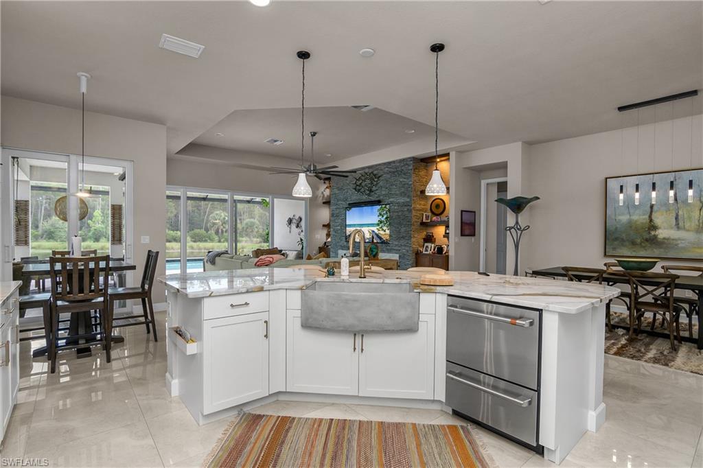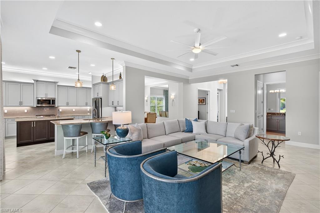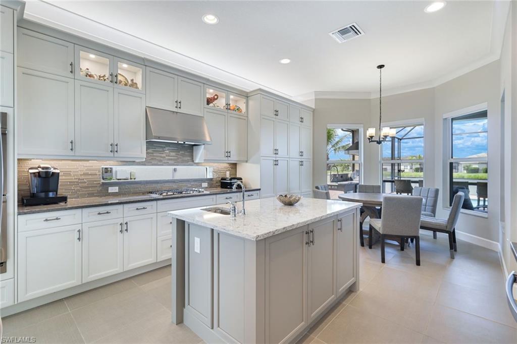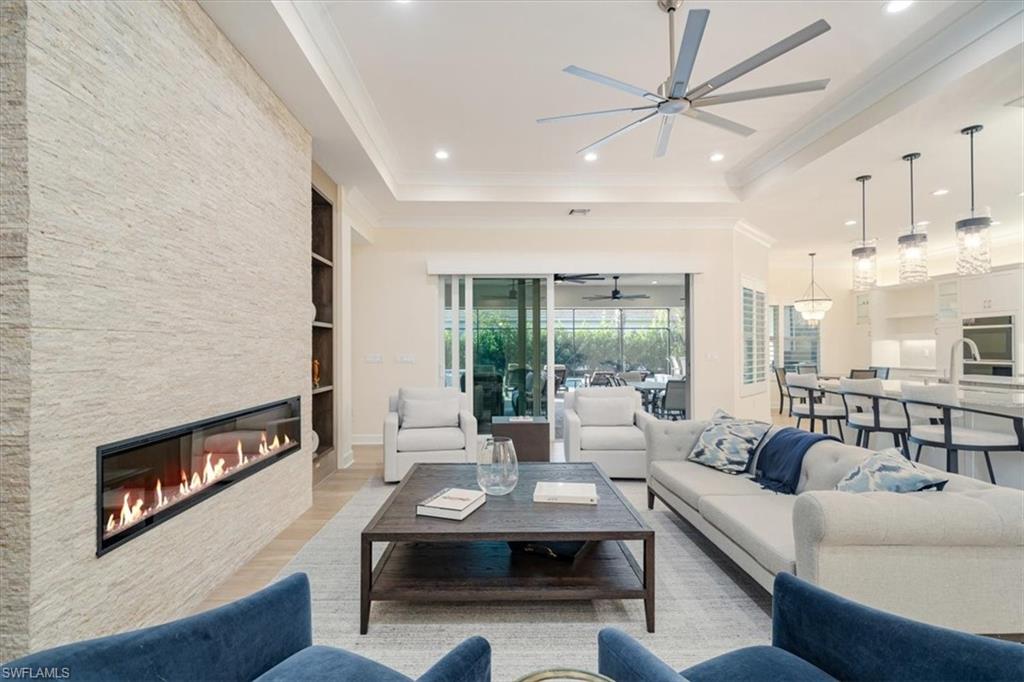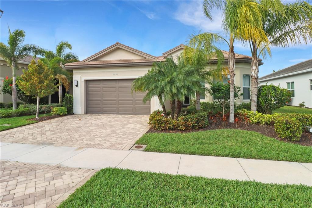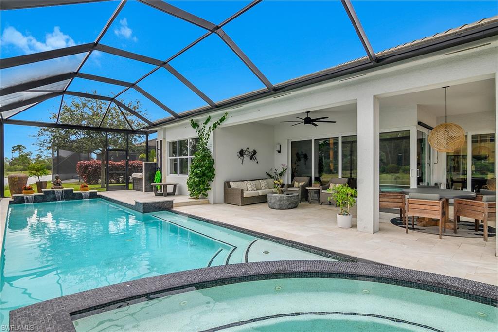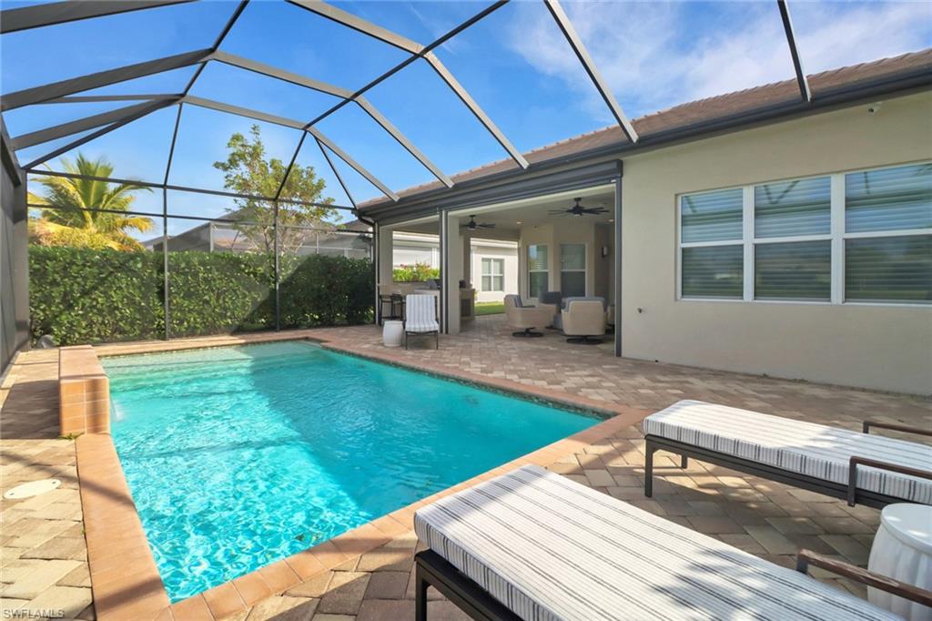 Gorgeous Julia floorplan home with extensive upgrades throughout. This absolutely stunning home welcomes you with high end finishes throughout and over $300k in upgrades with Diamond builders/Edge. Electric fireplace graces the Great Room for perfect ambiance and leads you to the lanai oasis with a loaded summer kitchen including wine fridge, utility sink, refrigerator and gas grill, salt water, heated pool and integrated spa for total relaxation after a day of tennis and social SWFL lifestyle. The masterfully designed kitchen is anchored with a large island and has a pert breakfast bar and morning room for easy meals and family game night. The formal dining room is generous in size and ideal for those more formal dining experiences. You are going to love the primary suite, double walk-in closets and seating area that leads to the primary spa inspired bath complete with a generous shower and dual vanities/sinks. With the split bedroom design, the 2 guest rooms each have their own full bath access and the den is a perfect flex space to use as desired. A spacious garage is able to accommodate 3 vehicles or 2 cars and your golf cart, which is a super method of experiencing Valencia Bonita. Additional details include a home generator, high end kitchen appliances, plantation shutters throughout, upgraded light fixtures, LED lights w dimmers, Air purification system, water filtration system, oversized lot and California closets. Garage has epoxy floors and split AC for comfort. Enjoy amenity rich Valencia Bonita, this 55+ community offers tennis, pickleball, bocce, a resort style pool, community spa, separate lap pool, theater/stage, full fitness center, full service spa and so much more, all in a superior location with easy access to sandy golf beaches, I-75, Naples, RSW and Fort Myers!