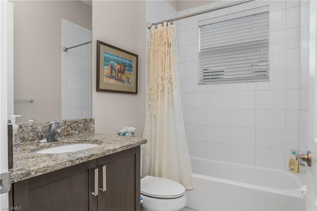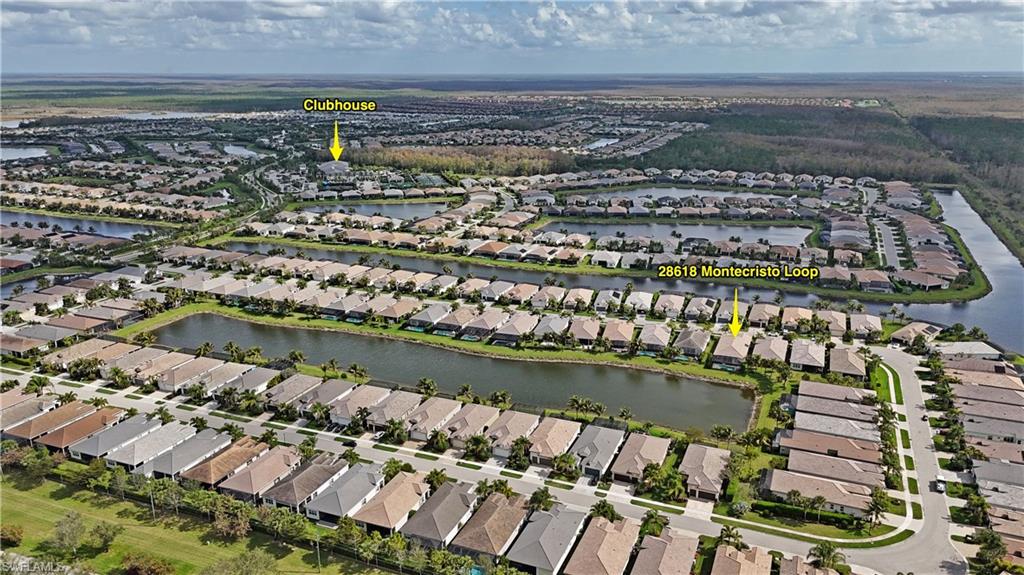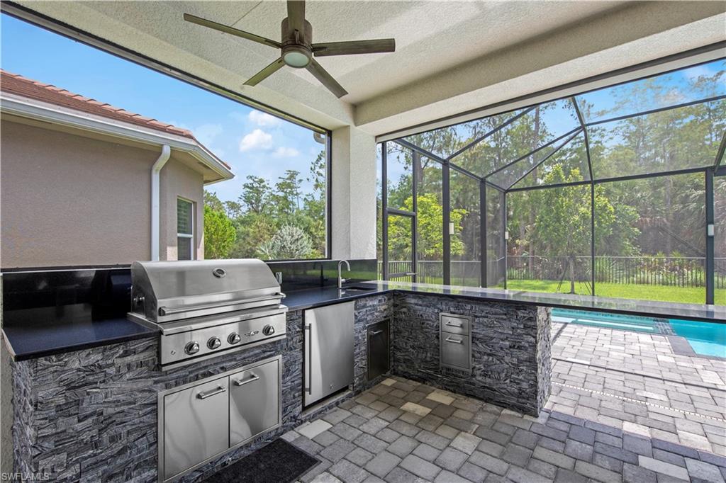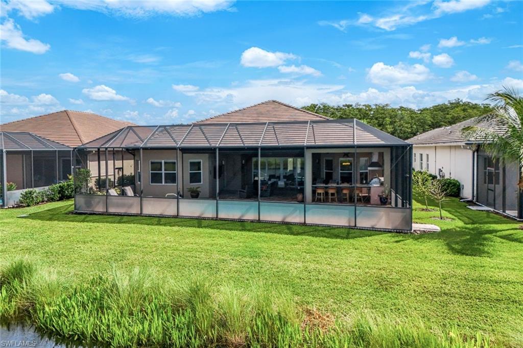 Welcome to the pinnacle of resort-style living. This home is nestled within the prestigious Valencia Bonita 55+ Active Adult community. This exquisite CARLYLE floor plan residence offers 4 bedrooms plus a versatile club room / den along with 4 full bathrooms and 1 half bath and a spacious 2-car epoxied floored garage. Designed for effortless elegance, the bright open-concept layout flows seamlessly blending sophistication with unparalleled comfort. Highlights include a saltwater heated pool, extended covered patio, custom outdoor kitchen, impact glass, full home Generac generator, tankless water heater, central vacuum system, custom built-ins in great room and den, crown molding, 24" tile flooring in the main living area, wood flooring in all bedrooms and den, motorized custom shades at all windows and solid core 8' doors throughout the home. The gourmet kitchen boasts GE Profile stainless steel appliances with double ovens and a natural gas cooktop, sparkling quartz countertops, ample white wood cabinetry with pull out drawers along with a large cabinet pantry with pull out drawers. The primary suite bathroom offers dual sinks, white wood raised panel cabinets, quartz countertops, large walk-in shower, soaking tub, custom walk-in closets and builder upgraded tile package for flooring and shower walls. All other bathrooms come appointed with quartz countertops, white wood raised panel cabinets and builder upgraded tile package. This home offers the ultimate Florida lifestyle with its large covered outdoor living space where you can entertain or just spend time relaxing taking in the lake and sunset views. Valencia Bonita is a top selling ACTIVE ADULT 55+ community in Bonita Springs with a spectacular 45,000 sq. ft. clubhouse and amenities second to none! The clubhouse is located on a 10-acre site with recreation complex offering a resort-style swimming pool, 60 ft. lap pool, resistance exercise pool, grandchildren wading pool, whirlpool spa, racket center pro shop, tennis courts, pickleball courts, bocce courts, dog park and fire pit. Residents also enjoy performances and parties in the grand ballroom, fully equipped fitness center, spa with treatment rooms and nail salon, restaurant with indoor and outdoor bars, card rooms, sports lounge, arts and crafts room, yoga/exercise studio with ping-pong, massage rooms and so much more!
