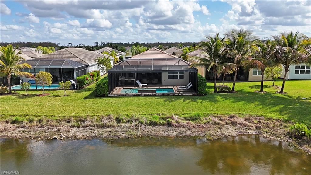 Welcome to this stunning Chandon model, the most sought-after floor plan in Valencia Bonita—renowned for its vibrant lifestyle, resort-style amenities, and maintenance-free living. Perfectly positioned on a premium lakefront lot with a rare expansive side yard adjacent to open green space, this home offers privacy, luxury, and incredible sunset views. Step inside to a beautifully furnished interior in a coastal chic / Serena & Lily style. The home features upgraded flooring, crown molding, designer light fixtures, and custom-built closets throughout. Enjoy Florida living with full hurricane protection, including impact-resistant windows and doors, Storm Smart lanai screens, and a whole-house generator for peace of mind. The pool and spa boast a sun shelf, color-changing lights, and soothing water features, all surrounded by white travertine decking and panoramic screen enclosures that frame picture-perfect water views. The extended lanai is a true outdoor oasis, complete with a fully equipped outdoor kitchen, wall-mounted TV, and ample space to entertain. Inside, the built-in bar area features a new beverage refrigerator, while the screened front entry allows gentle breezes to flow through the home and provides a secure spot for package deliveries. The climate-controlled garage includes epoxy flooring, mini-split A/C, a custom storage system, insulated door and ceiling. Community Features (Valencia Bonita): • 24/7 manned gate & security • Massive clubhouse with social hall • Resort-style pool with beach entry, lap lanes & hot tub • Poolside bar and restaurant • Full-service fitness center with aerobics & yoga studio • Multiple sports courts: pickleball, tennis, bocce • Grand social calendar: shows, concerts, clubs, and events • Dog park, walking trails, and more This is Florida living at its finest—luxurious, low-maintenance, and lifestyle-rich. Don’t miss the opportunity to own this move-in-ready, lakefront beauty in one of Bonita Springs’ most desirable 55+ communities.