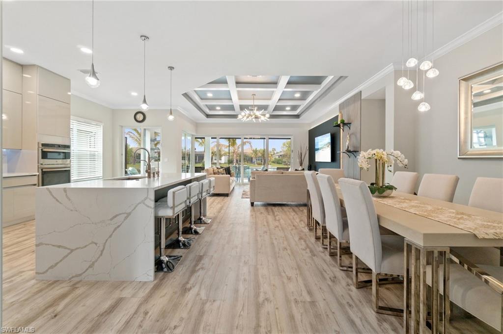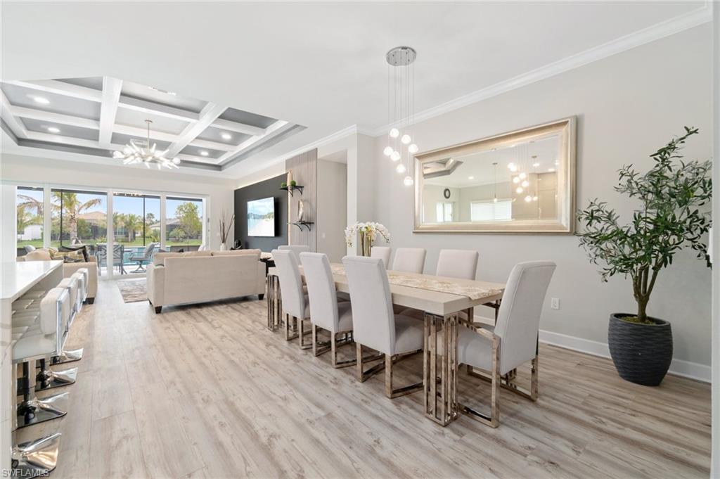 Built in 2020, this Carolina model is being offered turnkey furnished and showcases extensive upgrades throughout. Situated on a corner lot with a spacious side yard, this home is ideally located — close enough to walk to the clubhouse, yet far enough away to avoid the sound of the pickleball courts. Located in Flood Zone X, No Flood Insurance required. Features include Impact Doors and Windows, a 3-car garage with epoxy flooring, and a heated pool and spa. The outdoor kitchen is equipped with a grill, vented hood, wine cooler, and refrigerator, creating the perfect space for entertaining. Inside, the gourmet kitchen offers a gas cooktop, built-in microwave, quartz countertops, large pantry, and under/over cabinet lighting. Additional highlights include an upgraded washer and dryer, oversized laundry room with abundant storage, and custom closets throughout. Elegant finishes include a neutral color palette, crown molding, upgraded front doors, designer chandeliers, window treatments, blinds on every window, and shiplap/woodwork in the living, dining, and master bedroom. The formal dining room and separate breakfast area with coffee bar provide versatile dining options . The primary suite features a large soaking tub, separate custom glass shower, upgraded flooring, and custom closet systems. A custom living room wall unit, two smart TVs, and Bose sound bar are included. Exterior landscaping is enhanced with up-lighting under palms and trees, front and back. Valencia Bonita is a 55+ community with resort-style amenities, including a 45,000 sq. ft. clubhouse, pools, pickleball, tennis, fitness center, spa, dining, and more.