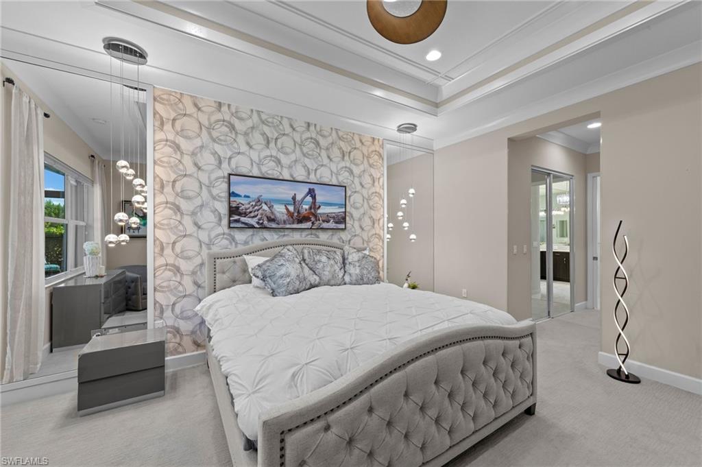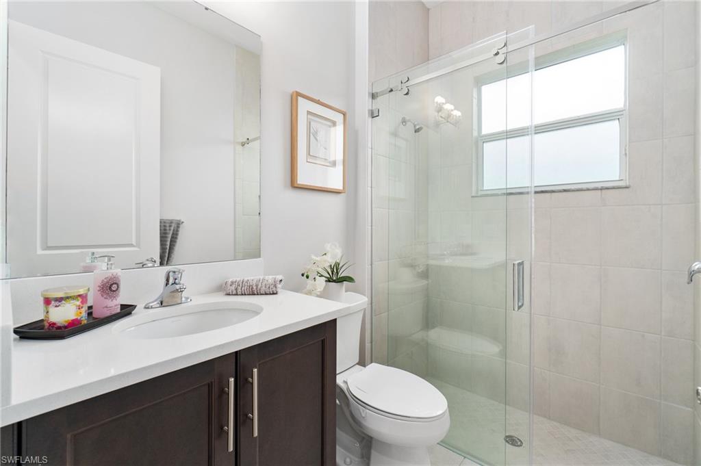 This impeccably maintained Portofino model offers the perfect blend of luxury and comfort, set on a serene lakefront lot with desirable southern exposure. Inside, you’ll find elegant crown molding, rich wood flooring, plantation shutters, decorative light fixtures, and ceiling fans throughout. The upgraded laundry area includes a premium washer and dryer, plus a utility sink for added convenience. Enjoy thoughtful touches like custom closets, built-in storage solutions, and a luxurious jetted tub in the primary suite. The home is equipped with impact-resistant windows and a stunning pool and spa framed by picture window screening for unobstructed views. The garage is finished with a sleek epoxy floor and custom storage cabinetry. Located in Valencia Bonita—Southwest Florida’s premier active adult community—residents have access to a 45,000-square-foot clubhouse, the acclaimed Oasis restaurant, a full-service spa and salon, multiple resort-style pools, tennis and pickleball courts, bocce, a state-of-the-art fitness center with classes, over 40 social clubs, card rooms, and a vibrant social hall hosting live entertainment and events. Tucked just off Bonita Beach Road, Valencia Bonita offers the perfect mix of peace, luxury, and an active lifestyle.