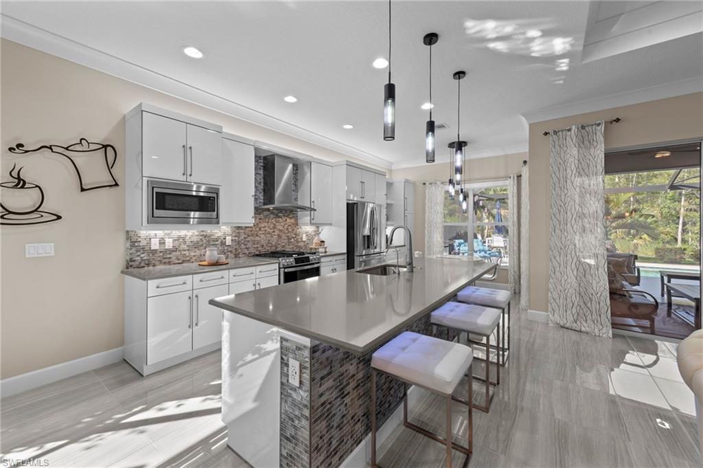 Discover Southwest Florida living at its finest in this stunning FURNISHED 4-bedroom, 3-bathroom home in the prestigious 55+ community of Valencia Bonita. Thoughtfully updated and truly move-in ready, this home is designed with elegance and comfort in mind. It features an open floor plan with extra-tall ceilings, rich tray ceiling detail in the living room, and stylish light fixtures throughout. The versatile den offers endless possibilities, whether you need a home office, media room, or creative space. The expansive kitchen is a chef’s dream, fully remodeled in 2024 with modern cabinetry, a large central island with a waterfall countertop, and sleek stainless steel appliances. A tankless water heater ensures energy-efficient, on-demand hot water throughout the home. Outside, lush tropical landscaping enhances the home’s curb appeal, while the screened-in lanai creates the perfect space for entertaining. The outdoor kitchen, added in 2024, is fully equipped for hosting, while the newly updated saltwater, heated pool (2024) features a resistance section for swimming against the current. The screen enclosure was replaced in 2023 with a high-end "superscreen" designed to keep even the tiniest bugs out, ensuring comfort year-round. Valencia Bonita offers an unparalleled lifestyle with a vibrant waterfront clubhouse and lifestyle complex. Residents enjoy access to a state-of-the-art fitness center, hobby rooms, grand ballroom, cooking and art studios, a full-service spa, and a café. Outdoor amenities include a resort-style pool, outdoor bar, pickleball and tennis courts, and two dog parks. A dedicated lifestyle director curates a full calendar of events and activities, providing endless opportunities to stay active and connected. Ideally located near world-class dining, shopping, entertainment, and pristine white-sand beaches, this exceptional home offers the perfect blend of luxury and convenience!