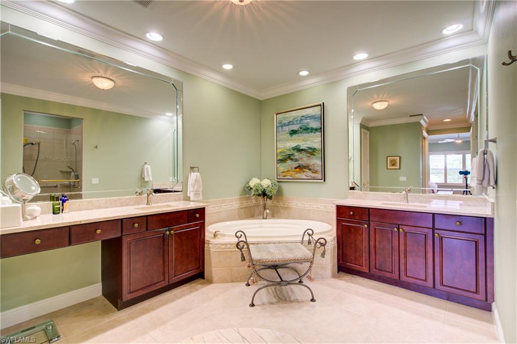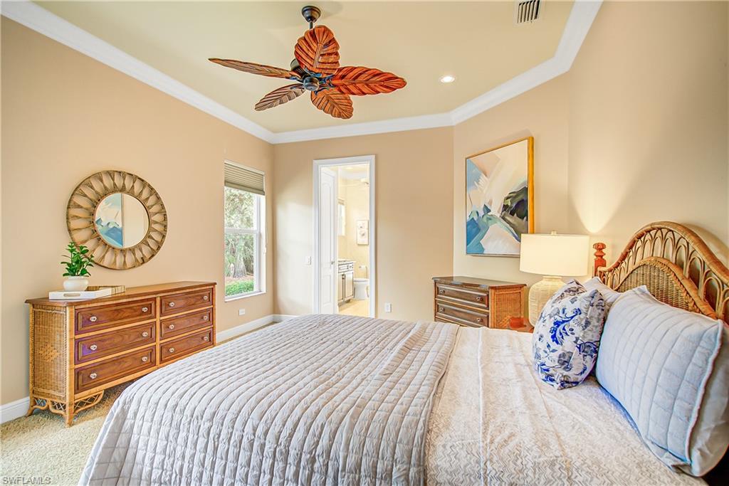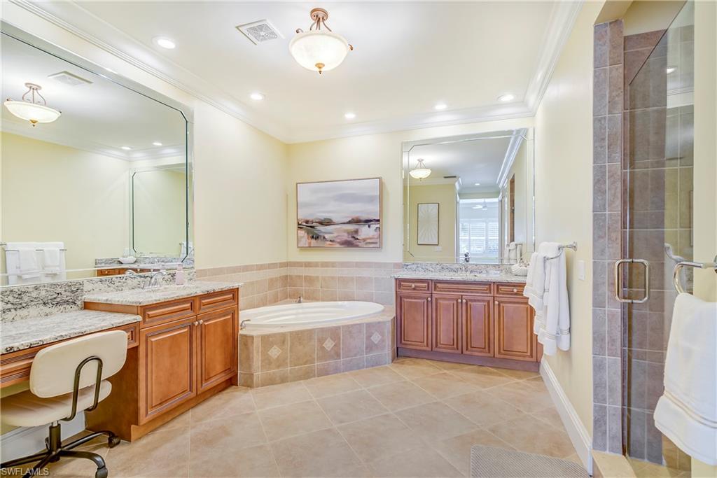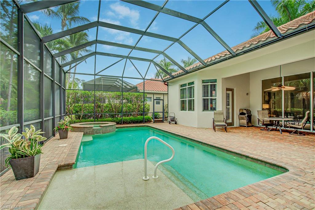 Exquisite Former Model Home in Premier Vasari Country Club. Welcome to your dream home in Vasari Country Club, Southwest Florida’s premier bundled golf community, where luxury meets lifestyle. This former Porta Rossa model home offers over 2,500 sq. ft. of elegant living space with 3 bedrooms, 2 bathrooms, and stunning upgrades throughout—perfectly tailored for the active lifestyle. Ideally located within walking distance to the championship 18-hole golf course, 6 Har-Tru tennis courts, clubhouse, fitness center, and more. Residents also enjoy 3 bocce courts with 700+ league participants, resort-style pool, and two exceptional dining venues. Choose elegant dining upstairs in the clubhouse with outdoor seating or enjoy a more relaxed atmosphere at the Taverna near the 18th green. Crown molding and tray ceilings in the master bedroom, dining, and living areas. Decorative large diagonal tile flooring in the main living spaces. Gourmet kitchen with stainless steel appliances. Built-in whole-home sound system, including lanai coverage. Spacious layout ideal for entertaining and everyday comfort. Unwind on the covered lanai with panoramic golf course views of the 12th and 13th holes. Enjoy your private pool and hot tub in a serene setting, with motorized hurricane shutters for year-round peace of mind. The garage features a custom built-in storage system with adjustable shelving and durable hardware—perfect for organization and extra space. Vasari Country Club offers a vibrant, active community lifestyle just minutes from SWFL’s breathtaking beaches, fine dining, upscale shopping, and cultural attractions. With quick access to I-75 and RSW Airport, travel and commuting are effortless. This is more than a home—it’s a lifestyle. Don’t miss this rare opportunity to own in one of Bonita Springs’ most sought-after communities.
