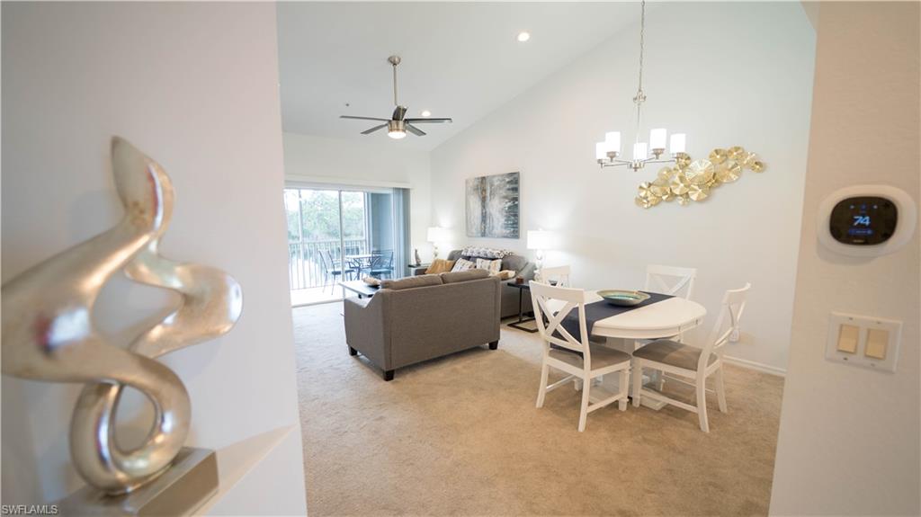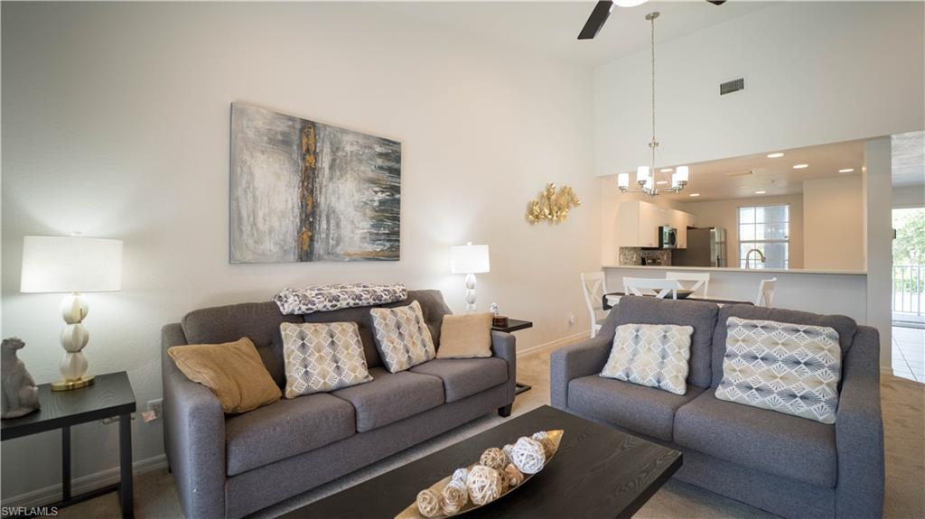 ALL SMILES AT THE CARLYSLE!! WITH IT'S PRIME LOCATION, LAKE AND TREETOP "SUNSET" VIEW, 3 GRACIOUS BEDROOMS + DEN, AND WIDE-OPEN "SUPER SPACIOUS" FLOORPLAN, THIS "VALUE PRICED" CONDO WILL HAVE YOU ALL SMILES!! Features of this beautiful condo include, all tile throughout (no carpet), tall ceilings, open concept kitchen with stainless steel appliances and pantry, 4-person kitchen breakfast bar; lots of crown moulding, plantation shutters, IMPACT WINDOWS AND DOORS, spacious primary bedroom with 2 walk-in-closets and direct lanai access; large primary ensuite bath with two sinks, huge vanities and walk-in-shower; 2 beautiful guest bedrooms, large and fully upgraded guest bath, large BONUS ROOM/DEN, upgraded fans and light fixtures throughout and more!! Additional features include large covered and screened lanai overlooking the treetops and lake, SUNSET WESTERN REAR EXPOSURE, covered "under building" parking, bike storage, community pool, BBQ area, peaceful tree-lined walking path and more! The Carlysle at Woods Edge is a perfectly located, SOLID BUILT, low-fee condo community located super close to the area's best beaches, restaurants, shopping, dining and all that SW Florida has to offer! Call for your private showing today!!