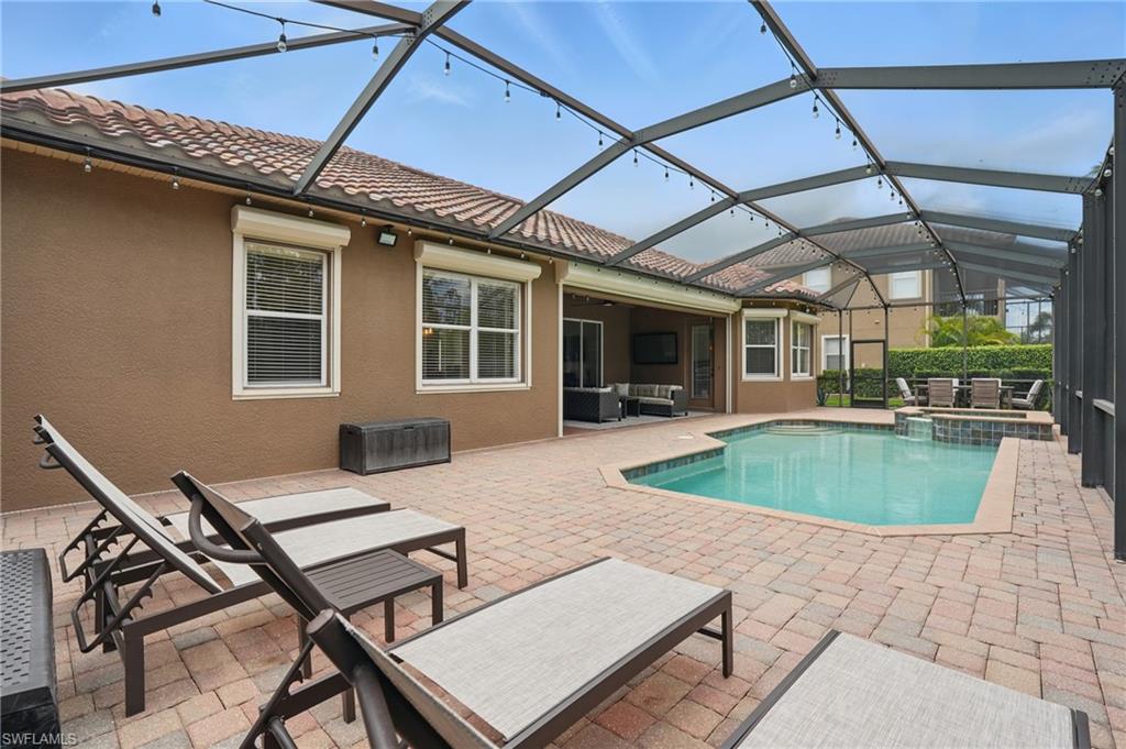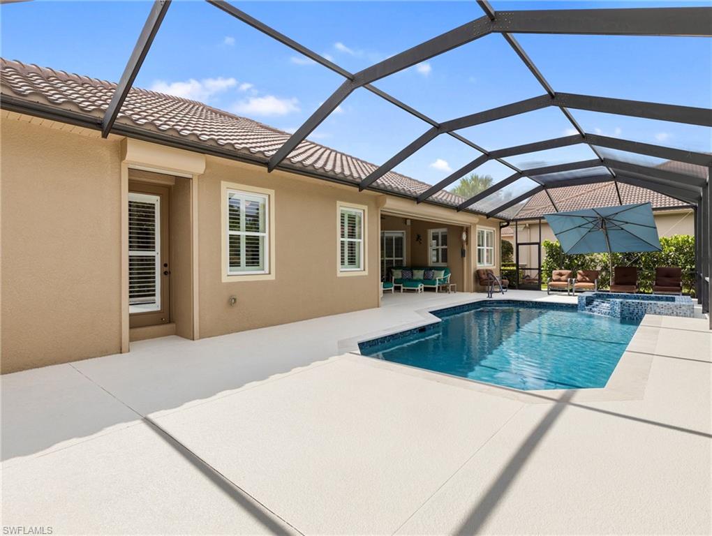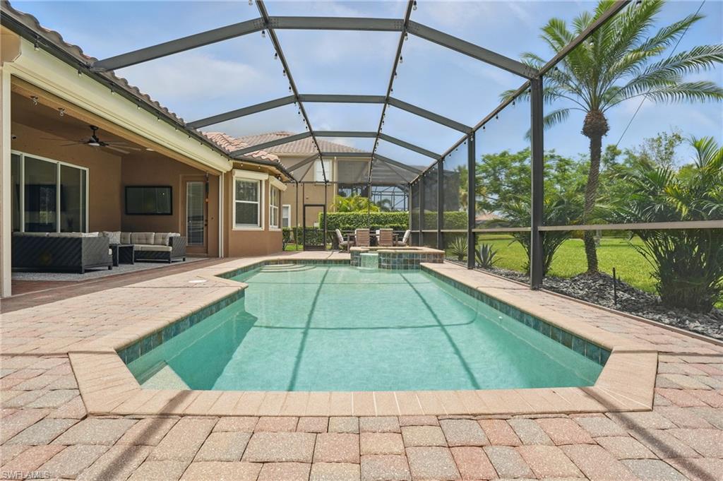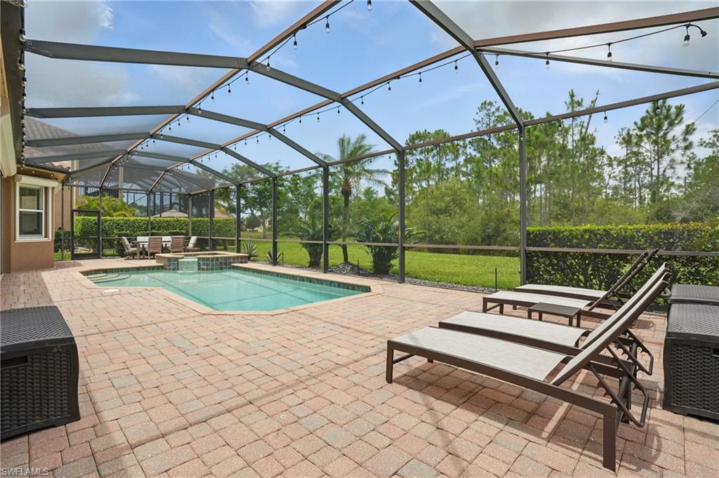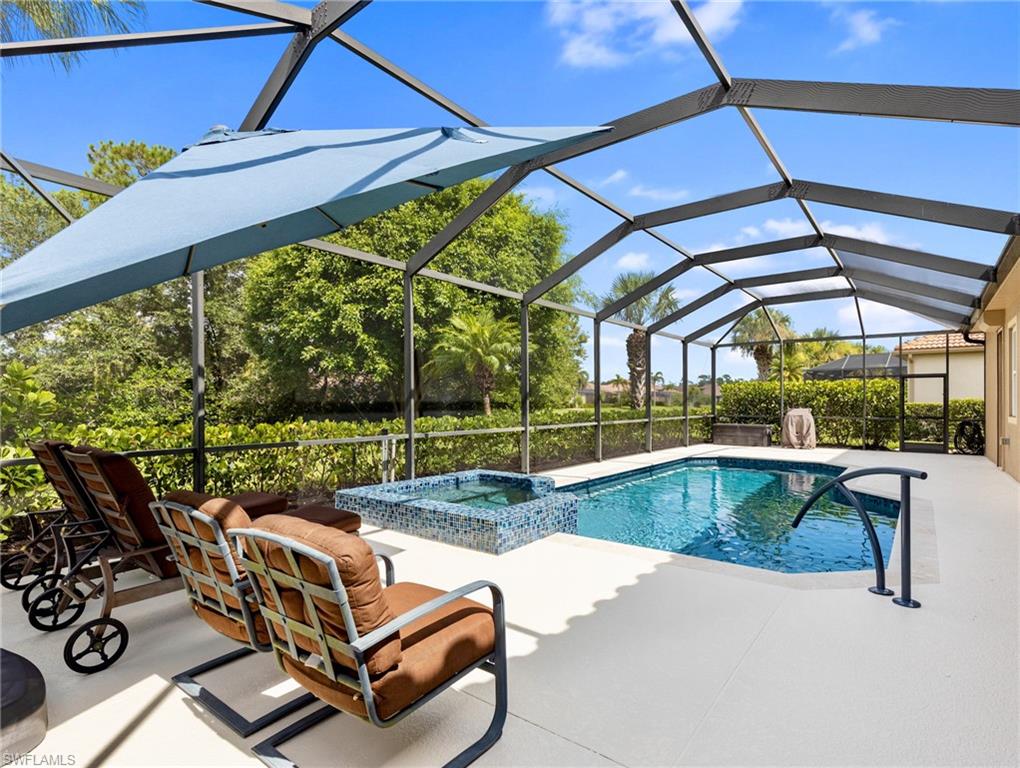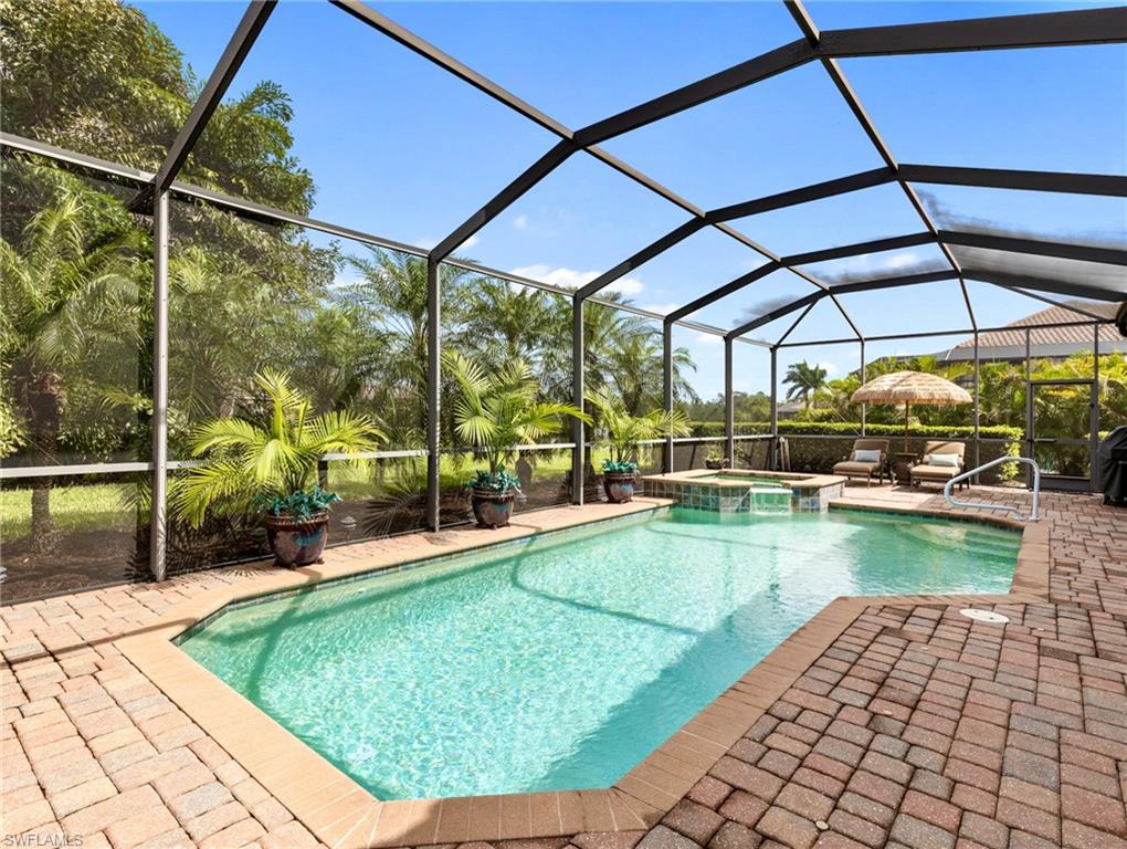 Imagine waking up to sunshine, palm trees, and your own private pool retreat. Tucked into one of Estero's most beloved, tree-lined neighborhoods, this spacious home feels like a hidden retreat. Discover this fantastic opportunity to own a spacious 4-bedroom, 3-bathroom home in Bella Terra's highly desirable Raphael floor plan, offering a generous 2,433 sq. ft. and a convenient split 3-car garage. Step out to your expansive screened lanai and enjoy the luxury of a heated pool and spa overlooking a private preserve. The extended lanai provides full coverage for the pool, perfect for year-round enjoyment, rain or shine! This well-maintained home boasts valuable peace-of-mind upgrades including full hurricane protection and a newer roof (replaced in 2019). Situated outside of a flood zone with desirable southern views, this property offers abundant natural light throughout the day. Inside, the thoughtful split bedroom layout features elegant formal living and dining rooms. The open kitchen flows seamlessly into the family room, creating an ideal space for entertaining. You'll appreciate the screened front porch, a beautiful leaded glass entry door, an upgraded kitchen, and a unique bar area complete with a wine cooler – perfect for your next gathering. Don't miss this exceptional Bella Terra home! The 999 acre Bella Terra community features 400 acres of conservation preserves and 100 acres of lake encompassing a resort-style clubhouse, a 24-hour fitness center, engaging activities like bingo and boot camp, water aerobics, poker, and food truck nights for a vibrant social life. Every member of the family will find something to enjoy, from the resort-style pool and spa to the secured, shaded children's play area. Sports enthusiasts can partake in sand volleyball, tennis, pickleball, basketball, softball, bocce ball, or even try out the in-line skate rink. Find solace in the peaceful butterfly garden. Bella Terra is a place you'll be proud to call home.