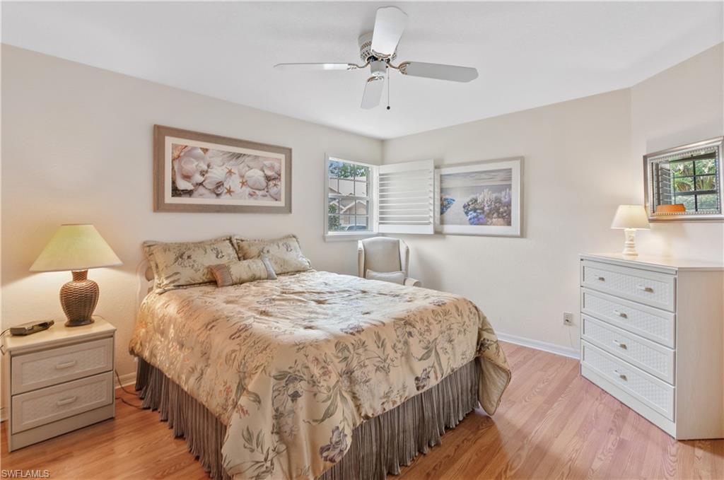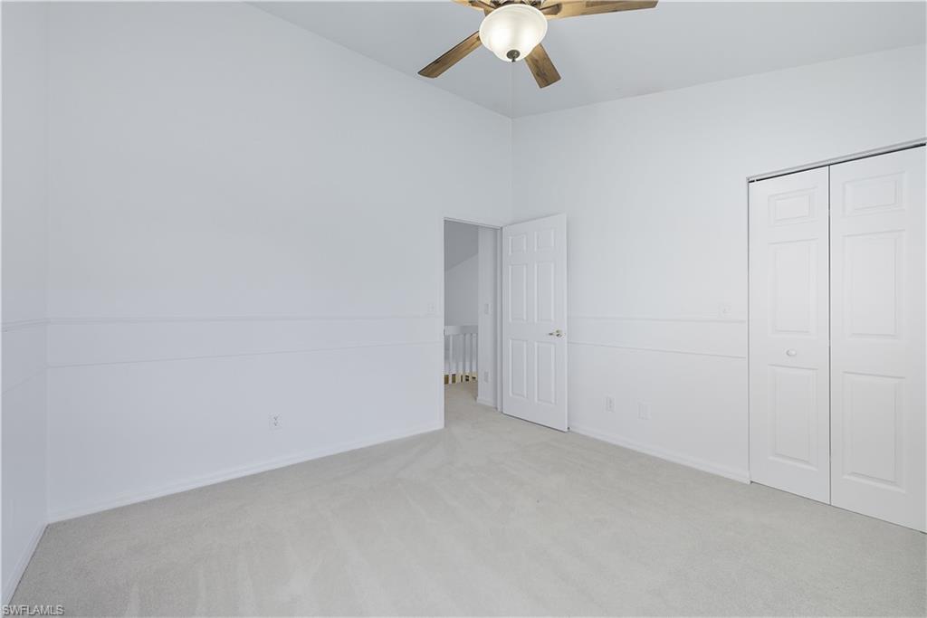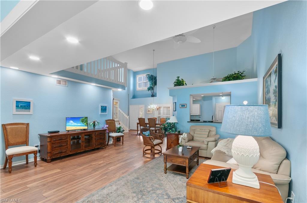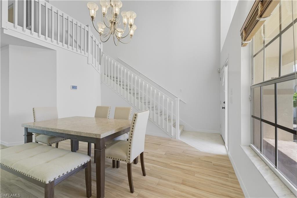 This townhouse is located in a vibrant gated community, with all amenities included. The highly desirable top floor Antiqua model has vaulted ceilings and lots of light. Extensive updates include: complete newer floorings, newer stainless steel appliances, high efficiency Trane AC unit, plantation shutters, master bath walk-in glass shower, foyer with oak staircase, expanded new paver driveway, double garage with floored attic. The HOA fee is among the lowest with no assessments. The amenities include golf, 8 Hard Tru tennis courts, 5 swimming pools, 3 pickleball courts, bocce, shuffle board and a newly updated club house, fiber optic internet and cable . Estero is in the heart Southwest Florida, only minutes to the airport, beaches and shopping malls.