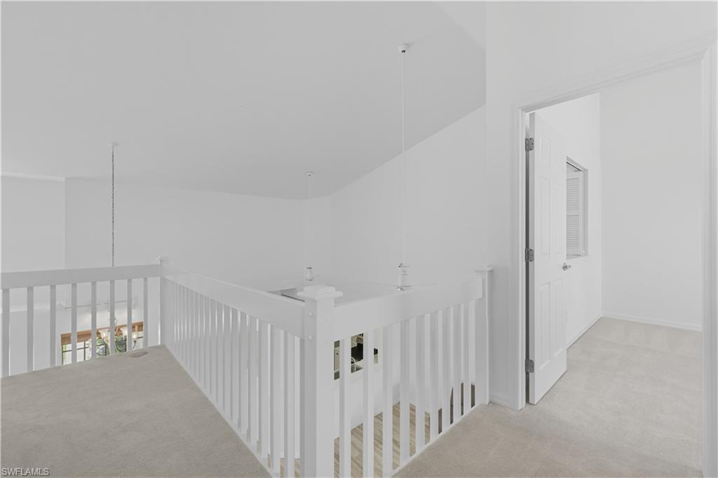 Discover the spacious Cancun Model, a three-bedroom, two-and-a-half-bath end unit boasting picturesque long lake views. The kitchen features a vaulted ceiling and a window, allowing natural light to brighten the space. The oversized one-car garage includes pull-down stairs for convenient attic access. Numerous upgrades enhance this home, including a kitchen with raised panel cabinets, granite countertops, stainless steel appliances, and a tile backsplash. Flooring consists of a mix of tile, carpet and laminate downstairs, with updated carpet upstairs. Plantation shutters are installed throughout, and the lanai is equipped with protective roll-up shutters. A newer A/C unit was installed in 2022. This property is offered furnished. Breckenridge offers an unparalleled lifestyle with a wealth of amenities. Residents can enjoy five pools, shuffleboard, pickleball, bocce, Har-Tru tennis courts, an exercise room, and a community room for events. The 18-hole Par 3 executive golf course offers no cart fees! Conveniently located in Southwest Florida, Breckenridge is just minutes from top dining and shopping destinations such as Coconut Point, Miromar Outlets, and Gulf Coast Town Center. Entertainment at Hertz Arena and travel from RSW International Airport are also a short drive away. This property is a must-see!