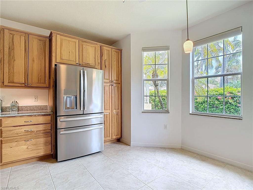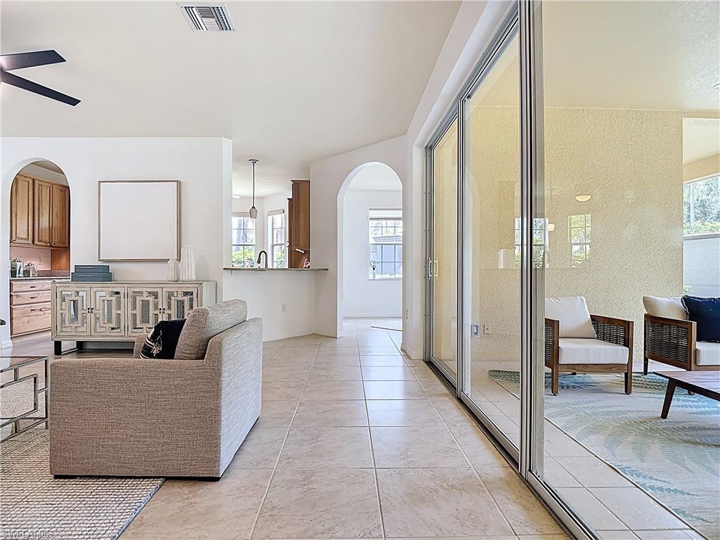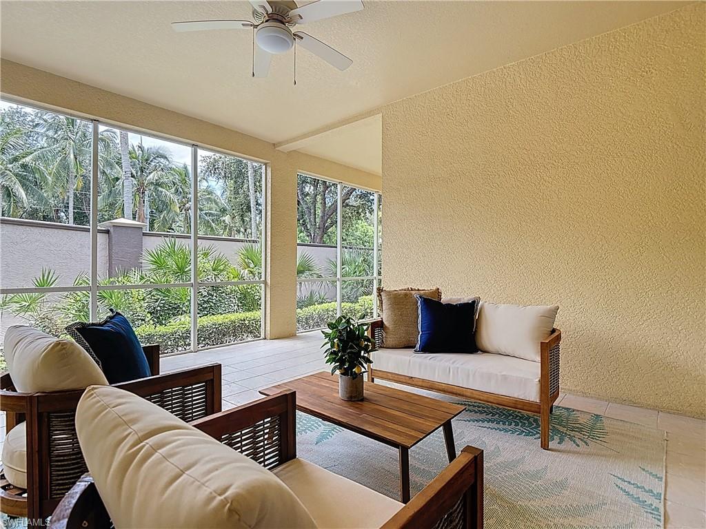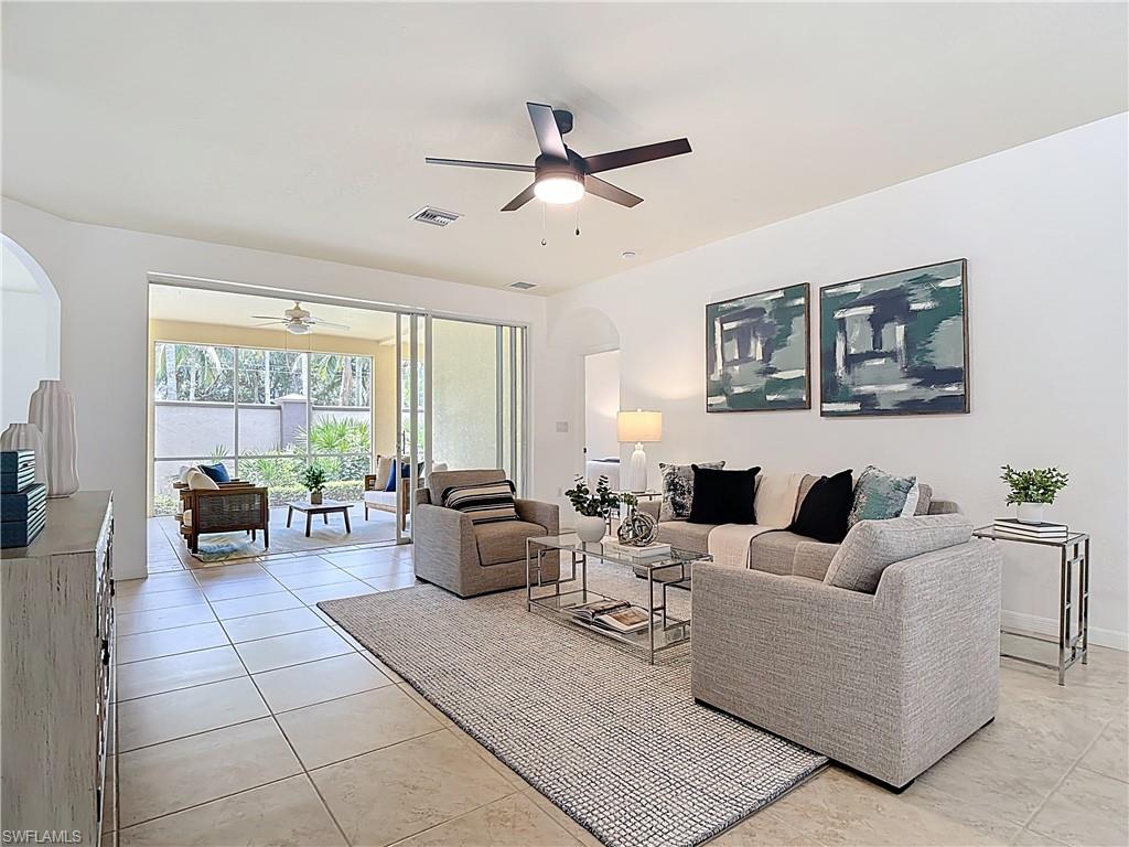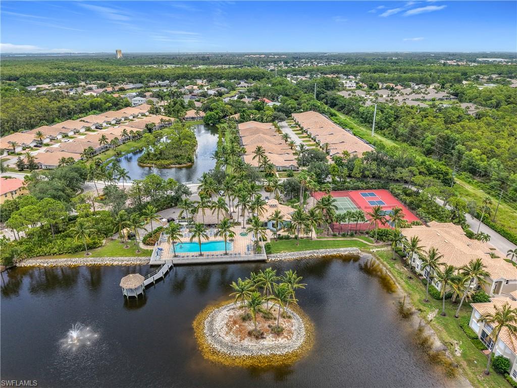 Rock Bottom Price!! Don't Miss This BEAUTIFUL Lake View with water feature!! Immaculate home, 2 BR plus den/flex room. 2 Baths include master with large tub and separate shower. Attached 2-car garage, BRAND NEW Carrier 3 ton A/C, Huge Florida room completely enclosed with high impact sliders for additional square footage. Granite counter tops, custom travertine back splash. Lots of storage and cabinet space. Location! Easy access to Coconut Point Mall for shopping and dining, easy access to I-75 and Airport. Amenities include Pickleball and Tennis Courts, grills, Tiki hut, pool and spa, and exercise room. Come live the Florida lifestyle!