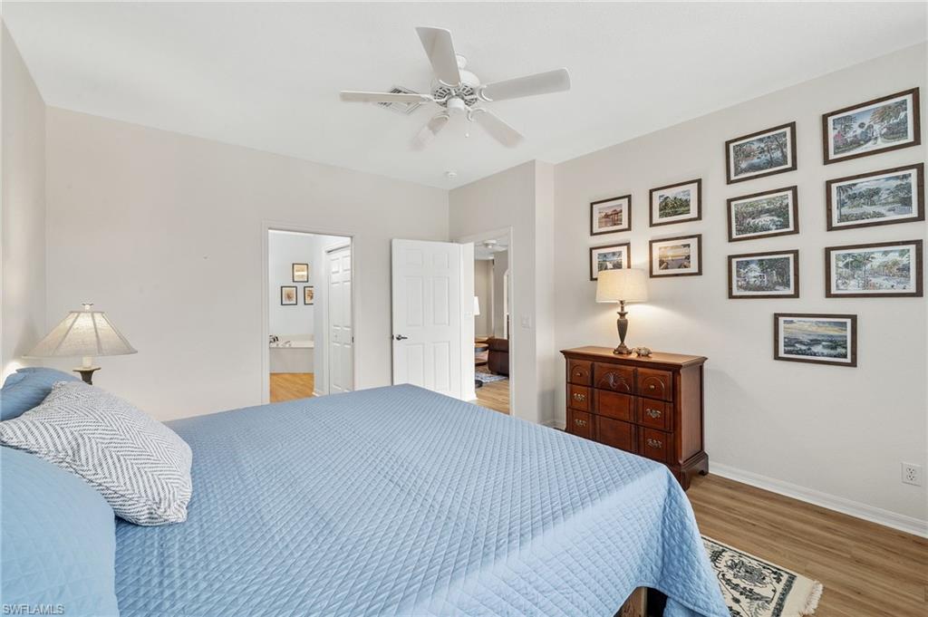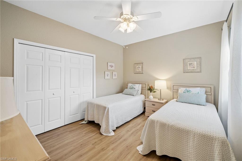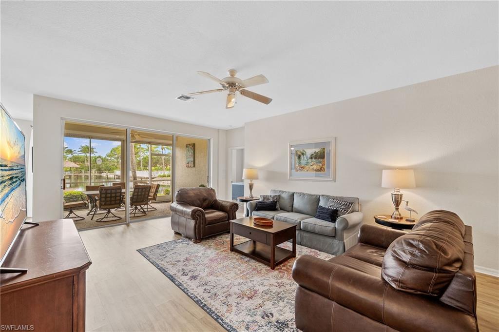 1st-Floor Coach Home with Stunning Views in Coconut Shores! Breathtaking sunset views from the screened rear lanai of this 2-bedroom + den, 2-bathroom coach home in the highly sought-after Coconut Shores community. Offering a spacious and versatile great room floor plan, this home features luxury vinyl flooring throughout, an eat-in kitchen with a breakfast bar, and an inviting living area with combined dining and family room spaces. The flexible den can easily transform into a home office or a 3rd bedroom, perfect for your needs. Retreat to the spacious master bedroom, complete with a walk-in closet and an en suite bathroom featuring dual sinks, a separate tub, and a walk-in shower. Coconut Shores offers an array of amenities, including pickleball and tennis courts, an exercise room, a BBQ grill, a community room with a kitchen, shuffleboard, and a resort-style pool and spa—all within a short walk from your front door. Conveniently located near shopping, dining, beaches, the interstate, and Florida Gulf Coast University, this property is perfect for enjoying the Southwest Florida lifestyle.