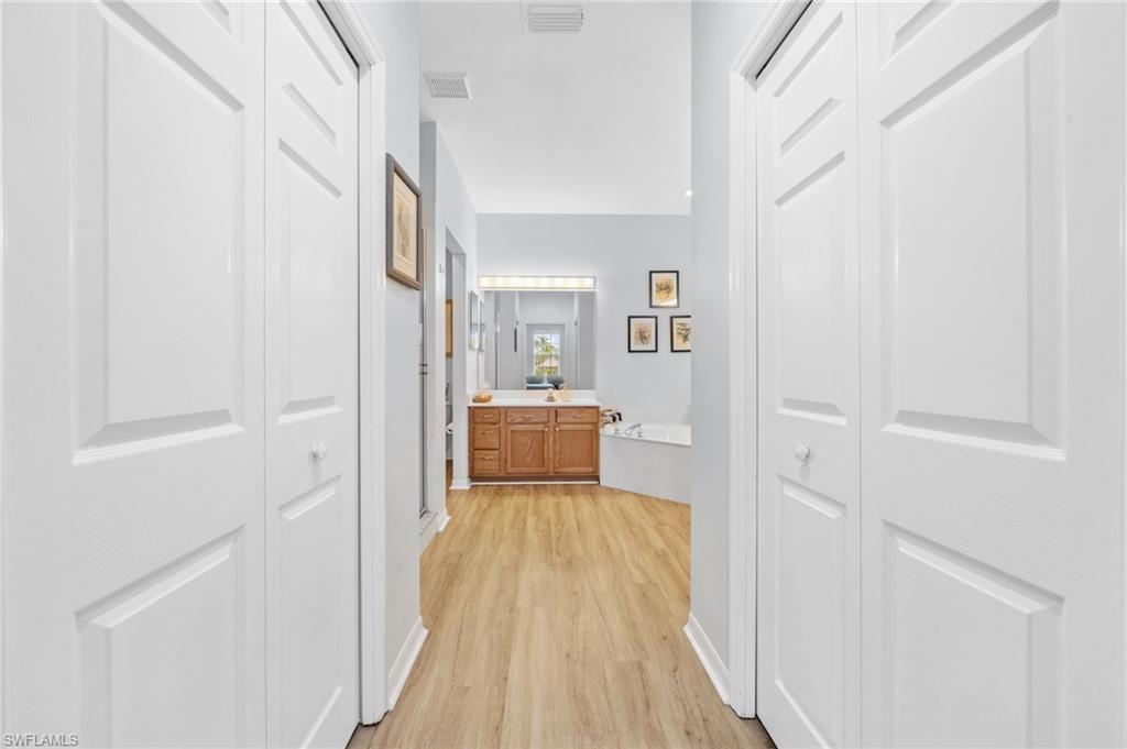 Welcome to your serene sanctuary in the highly desirable Coconut Shores community, perfectly positioned on the west side of US-41—no flood insurance required, thanks to its X Flood Zone status. This meticulously maintained 3-bedroom, 2-bath home offers 1,709 sq. ft. under air, blending modern upgrades with tranquil lakefront living. Step inside and be greeted by wide vinyl plank flooring throughout—no carpet, just seamless style and easy maintenance. Freshly painted interior, plantation shutters and a newer roof (2023) ensure peace of mind, while recent updates to the A/C (2017) and water heater (2020) add comfort and efficiency. The VIP suite is a private retreat, featuring a newly renovated, oversized shower, while the guest bath invites relaxation with a soothing jetted tub and shower combo. Enjoy breathtaking western lake views from your living room and extended screened lanai, where sunsets shimmer over the water feature, creating a peaceful and private backdrop for everyday living or entertaining guests. The open-concept layout flows effortlessly, offering space to gather, unwind, and make memories. Live steps from resort-style amenities: pickleball, tennis, swimming, a fitness center, and a vibrant tiki bar with grills and refrigeration—all just a stroll away. The quiet, friendly community includes cable and WiFi in the dues, with a new Hotwire installation underway for enhanced connectivity. Walk to Coconut Point Mall for shopping, dining, and entertainment, or simply relax at home, knowing you’re in a prime Estero location close to everything yet tucked away in peaceful privacy. With a spacious 2-car garage and a layout designed for comfort, this home is perfect for year-round living or a seasonal escape. Don’t miss your chance to experience the best of Southwest Florida living—schedule your private tour today and discover why 23204 Coconut Shores Dr. is the perfect place to call home.