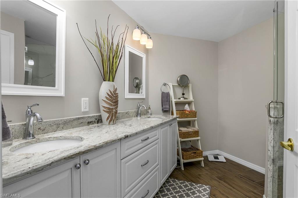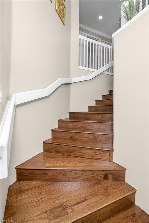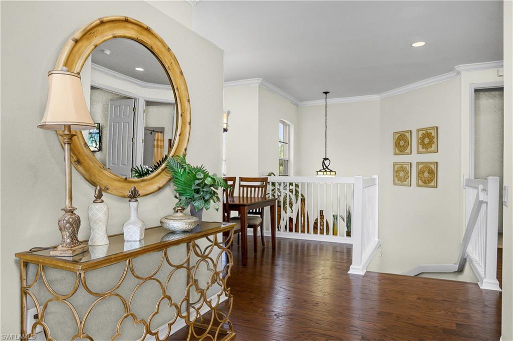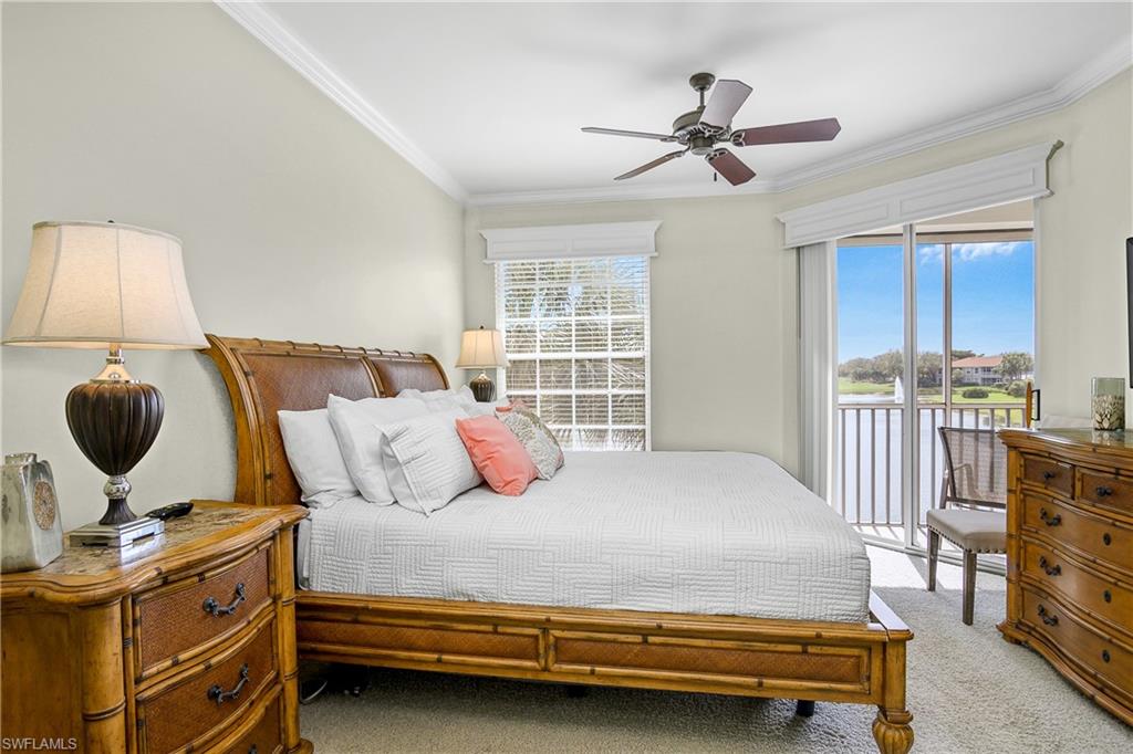 WHAT A VIEW!!!! Long westerly lake and golf views from this upper level THREE BEDROOM, FRESHLY PAINTED COACH HOME in the demand bundled golf community of COPPERLEAF at the Brooks. This tastefully remodeled home features beautiful hardwood flooring throughout great room, dining room and staircase, updated kitchen with granite countertops and glass tile backsplash plus newer appliances including a wine cooler, crown molding throughout, updated bathrooms, and tiled lanai. Other improvements include HVAC 2018, Storm Smart Hurricane Screen on lanai, and a new roof in 2020. You will love the location close to the community pool and it's proximity to shopping, dining, beaches and SWFL International Airport. Copperleaf is a premier gated, bundled golf community so as soon as you close on your home, you are an immediate golfing member of one of the finest bundled golf communities SWFL has to offer. Enjoy it's newly remodeled state of the art clubhouse and restaurants. Private membership to the Brooks Commons Club is optional and offers a private restaurant, fitness center, pickleball and events.