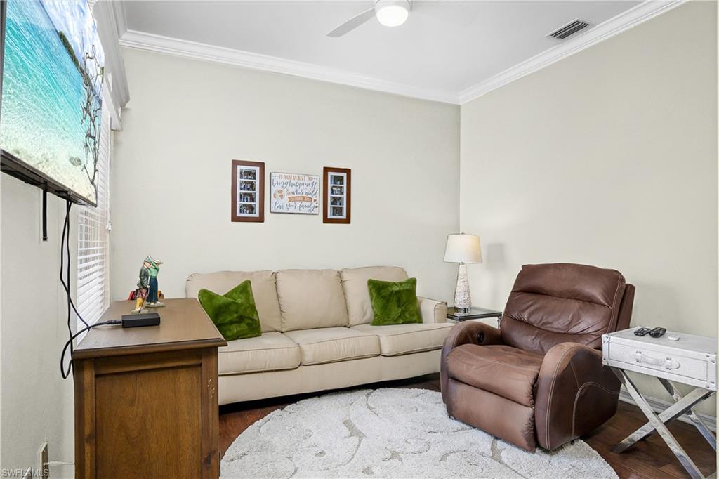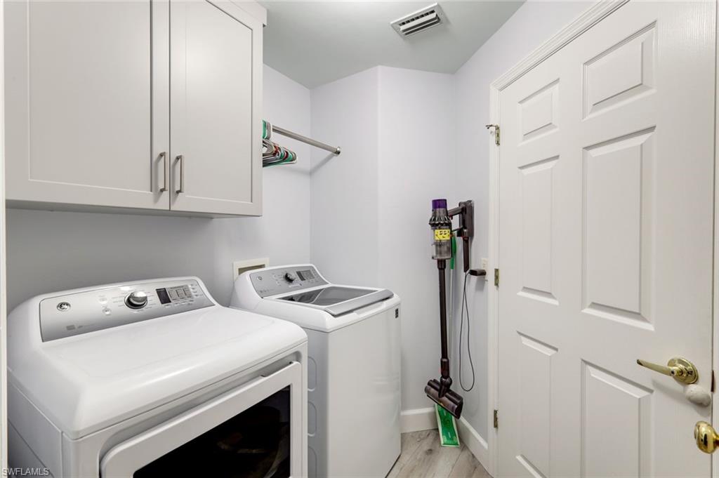 STUNNING GOLF COURSE VIEWS from this first floor 2+ den, 2 bath coach home in the sought after gated, bundled golf community of Copperleaf at the Brooks. This freshly painted coach with all new luxury vinyl flooring, newer high end kitchen including 4 year new appliances, remodeled master bath along with new carpet in the owner's suite with two closets is MOVE IN READY! Other features include a Storm Smart hurricane screen installed in 2018, allowing you to leave the lanai furniture in the lanai all year long and have hurricane protection, and an epoxied garage floor. New roof 2019 and new HVAC in 2021. You will love the location, close to shopping, dining, SWFL Int'l Airport, and the white sand beaches of SW Florida. Copperleaf is a premier bundled golf community with the membership deeded to the real estate so when you close on your home, you are an immediate golfing member. The state of the art new clubhouse offers indoor and outdoor dining and bars, community rooms, and a classy proshop. Wait! There is more! Ospreys is a separate outdoor restaurant and bar close to the Bocce courts for a fun afternoon. You can also enjoy tennis, fitness center, library, card games and more. Private membership to the Commons Club is optional and offers yet a third restaurant, pickle ball, fitness center, events along with a private beach club. See membership brochure in supplements. Come and see for yourself why Copperleaf is a fabulous community.