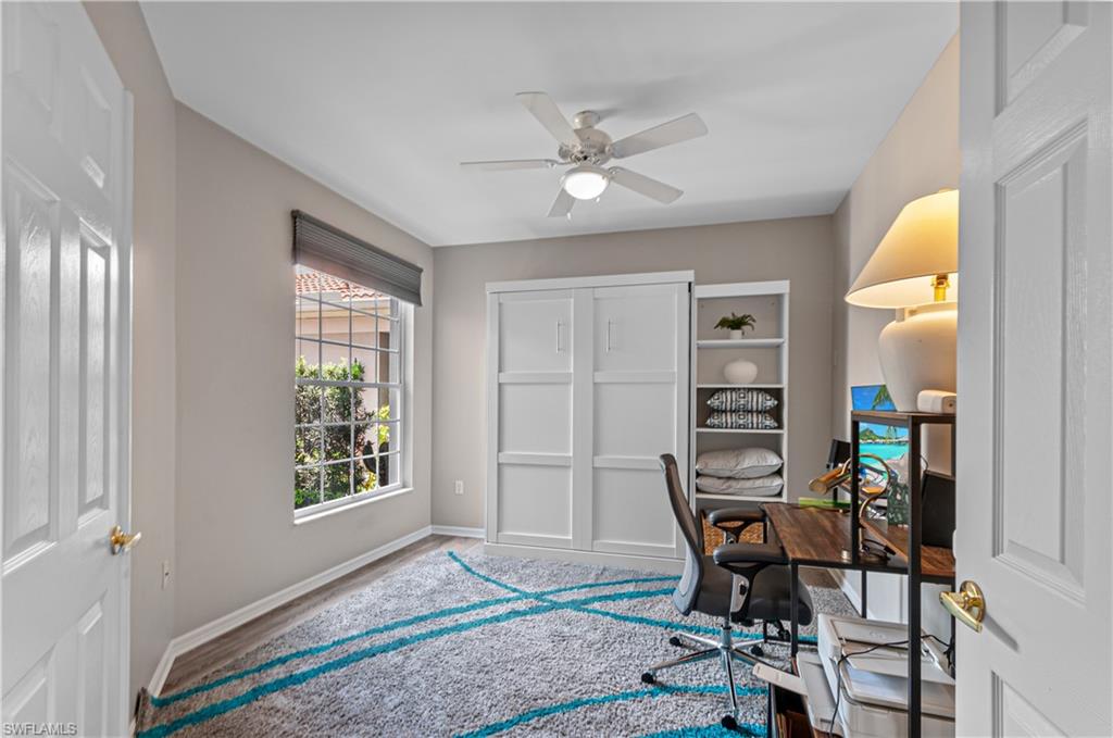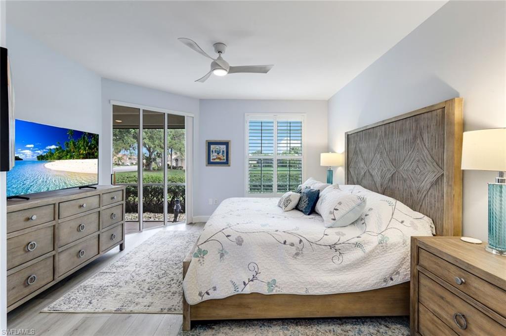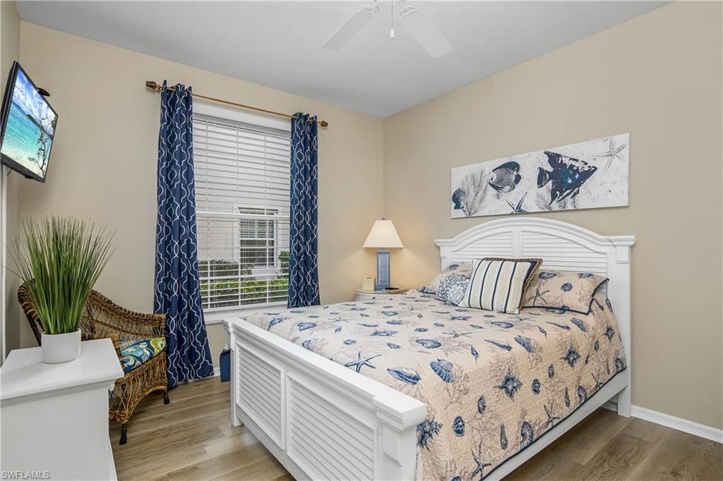Welcome to this meticulously maintained and beautifully renovated 2 bedroom + den, 2 bathroom first floor home. This Ibis floor plan is a light, bright and open great room plan, ideal for entertaining. Feel at peace with beautiful views from the primary bedroom. The primary bathroom features a separate shower and bath and dual sinks. The spacious guest room is perfect for privacy, and the den is ideal for overflow guests, furnished with a murphy bed. Enjoy fantastic views of the golf course and lake from the lanai. Tastefully remodeled with wood flooring in bedrooms and den, stainless steel appliances, B board in the kitchen, electric shutters on the lanai, water heater 2021 and HVAC 2018. Copperleaf offers an exceptional lifestyle with bundled golf, fitness center, tennis courts, resort style pool & more. Relax in comfort in the stunning recently renovated main clubhouse, The Leaf, or the outdoor dining/bar The Osprey. You also have the option of joining The Commons Club with private beach club. Its prime location puts you minutes away from world class shopping, dining and entertainment.