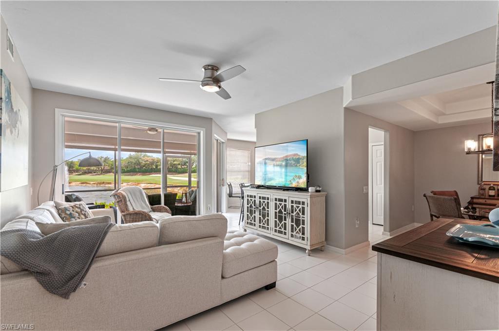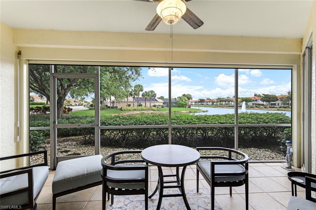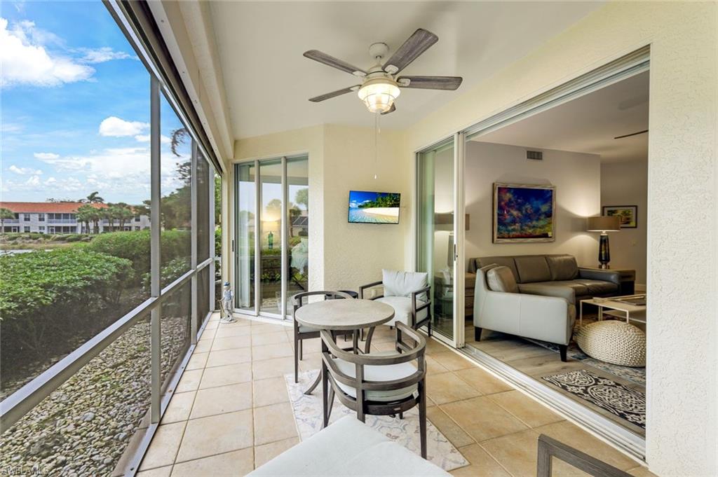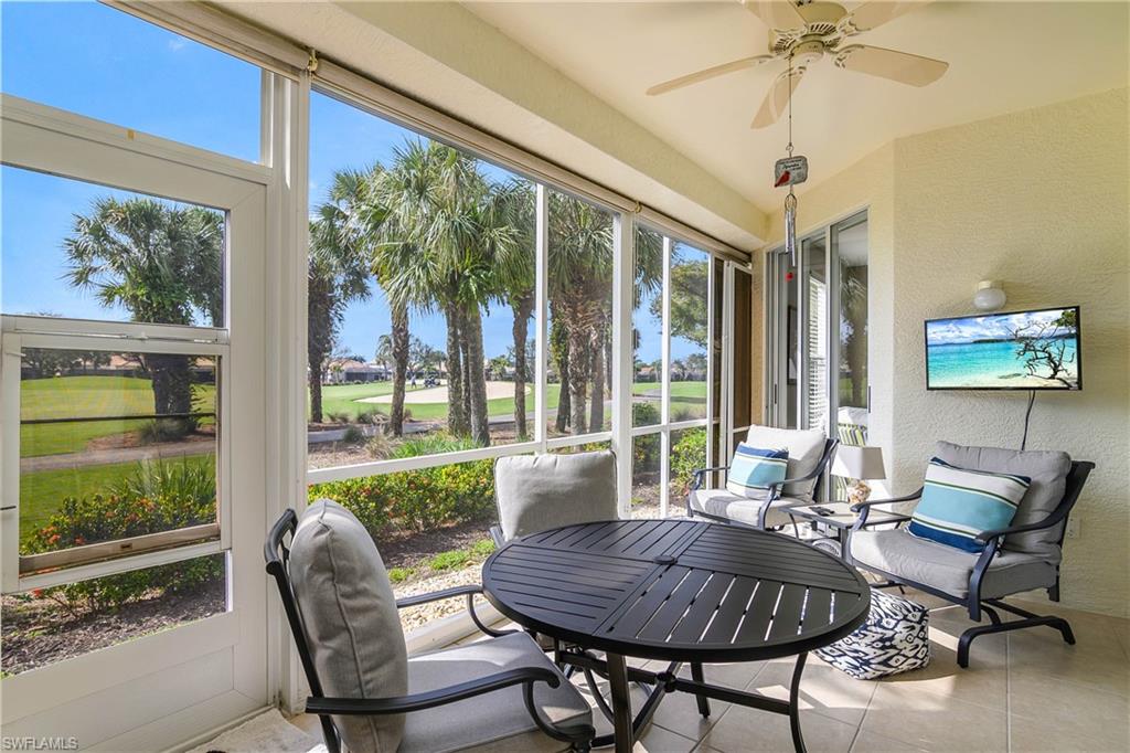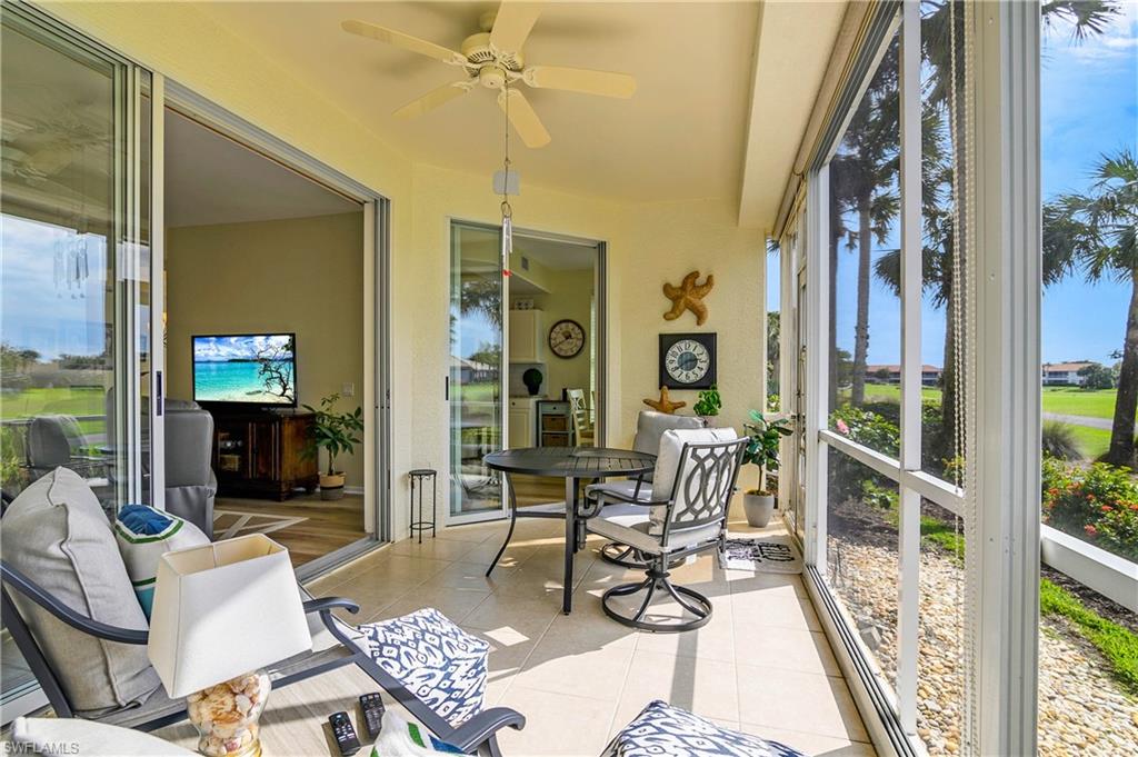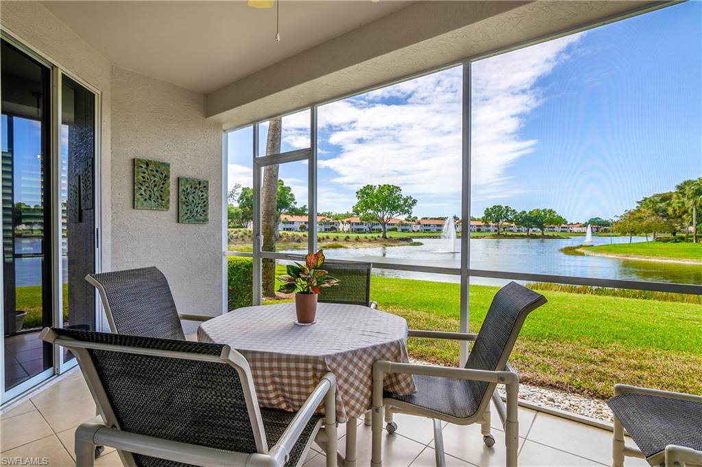 FIRST FLOOR END UNIT WITH SPECTACULAR GOLF COURSE AND LAKE VIEWS from this 2+ Den, 2 Bath coach home in the demand gated, bundled golf community of Copperleaf at the Brooks. Beautifully maintained and updated with rich bamboo flooring in great room, dining room and office, refaced and extended kitchen cabinets, custom window treatments, and it is being sold turnkey furnished! The single hung windows have all been replaced with impact windows. The roof was new in 2019. Bonus!! The lanai is glassed in adding extra living space but opens up to become a screened lanai. There is a phantom screen on the front door, the garage floor is epoxied, along with a new garage door opener and tracks. You will love the location close to the community pool, shopping, dining, SWFL Int'l Airport, and the white sand beaches of SW Florida! Copperleaf is a premier bundled golf community with the membership deeded to the real estate so the day you close on your new home, you are a golfing member. The state of the art new clubhouse offers indoor and outdoor dining and bars, community rooms, and a classy pro shop. Wait, there is more! Ospreys is a separate outdoor restaurant and bar close the the bocce courts for a fun afternoon. You can also enjoy tennis, fitness center, library, card games and more! Private membership to the Commons Club is option and and offers yet another dining option, pickleball, state of the art fitness center, events, concerts, and a private beach club. See the membership brochure in supplements. Come see for yourself why Copperleaf is a fabulous community!
