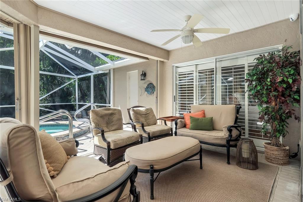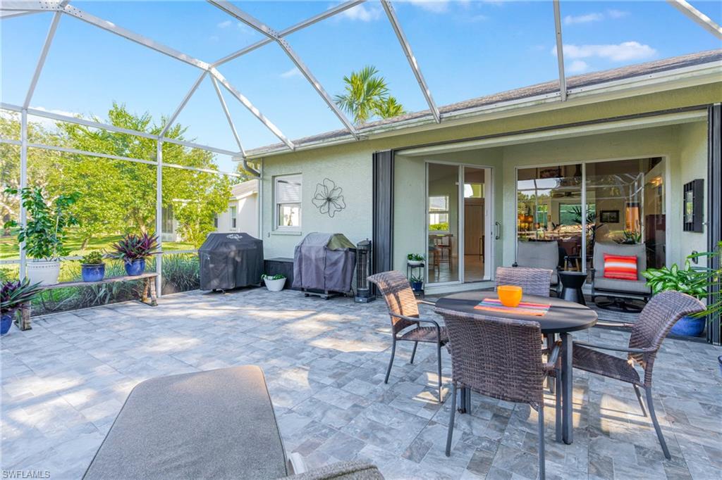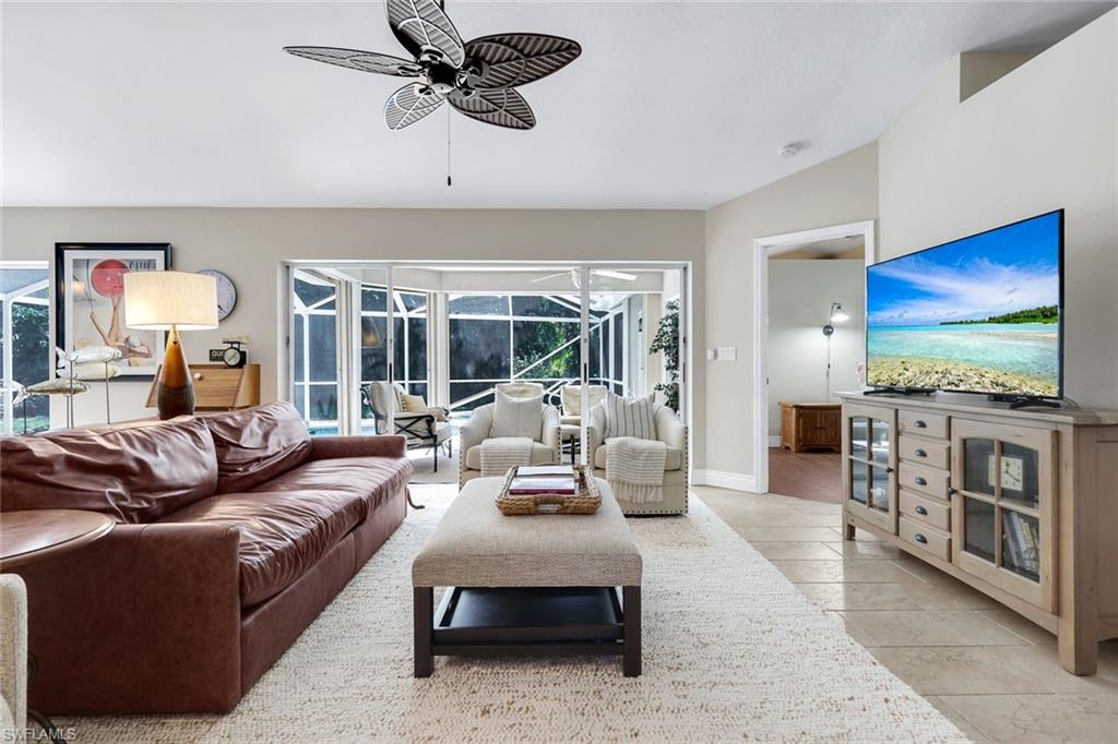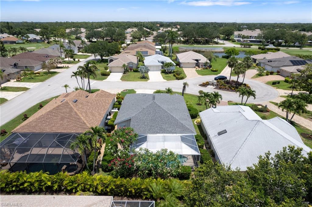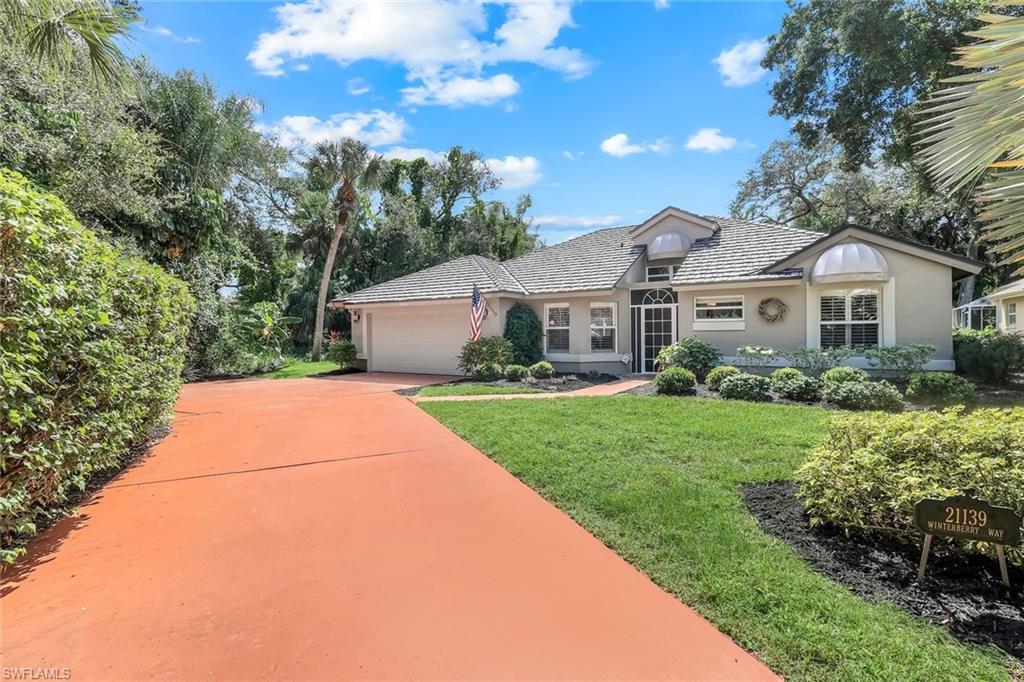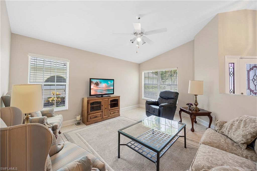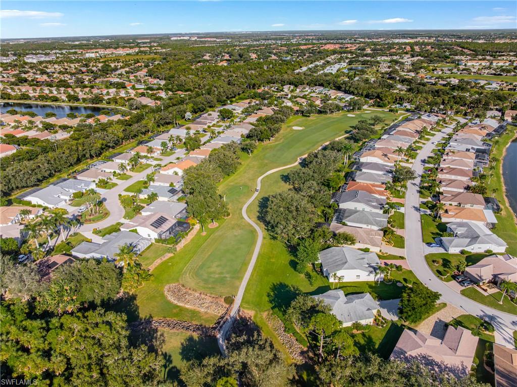 Welcome to this beautifully cared-for single-family home in the sought-after Estates section of Villages of Country Creek. This Captiva floor plan has been tastefully updated to create an inviting, light-filled space that feels instantly like home. Inside, you’ll find 2 bedrooms plus a den, PLUS an additional versatile office/bonus room, with plenty of storage. Step out to the huge extended lanai—finished with screened enclosure and elegant tile—where peaceful mornings and golden sunsets come with sweeping views of the 14th hole. This home is sitting on over a quarter acre lot surrounded by mature trees giving shade on your patio and a feeling like you have the 18-hole executive golf course all to yourselves. This is the prettiest, and most private lot in the community! Enjoy modern comfort and peace of mind with impact-resistant windows, a 2 year old A/C, and a 5-year-old water heater. The kitchen shines with newer stainless-steel appliances and a large undermount sink, placed under premium natural granite countertops, and under cabinet lighting. Other highlights include soring ceilings - welcoming in an abundance of natural light, Electric fireplace, 70ft long paver driveway, plantation shutters, a spacious laundry room, multiple walk in closets for extra storage, this home is charming and full of character— Furnishings are negotiable. Ideally located just minutes from RSW Airport, shopping, dining, and all the best of Estero living. Come see why this home stands out—a perfect blend of character, comfort, and Country Creek charm.