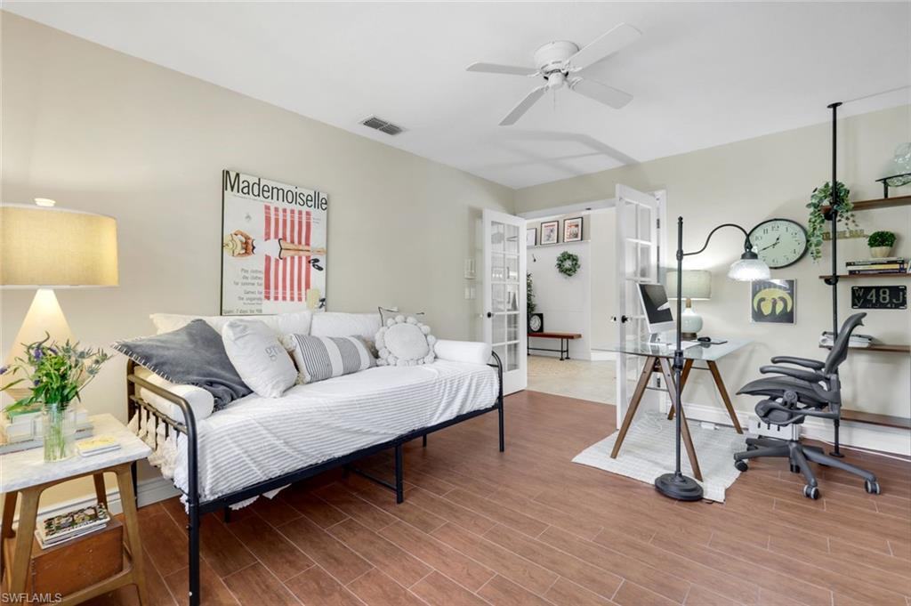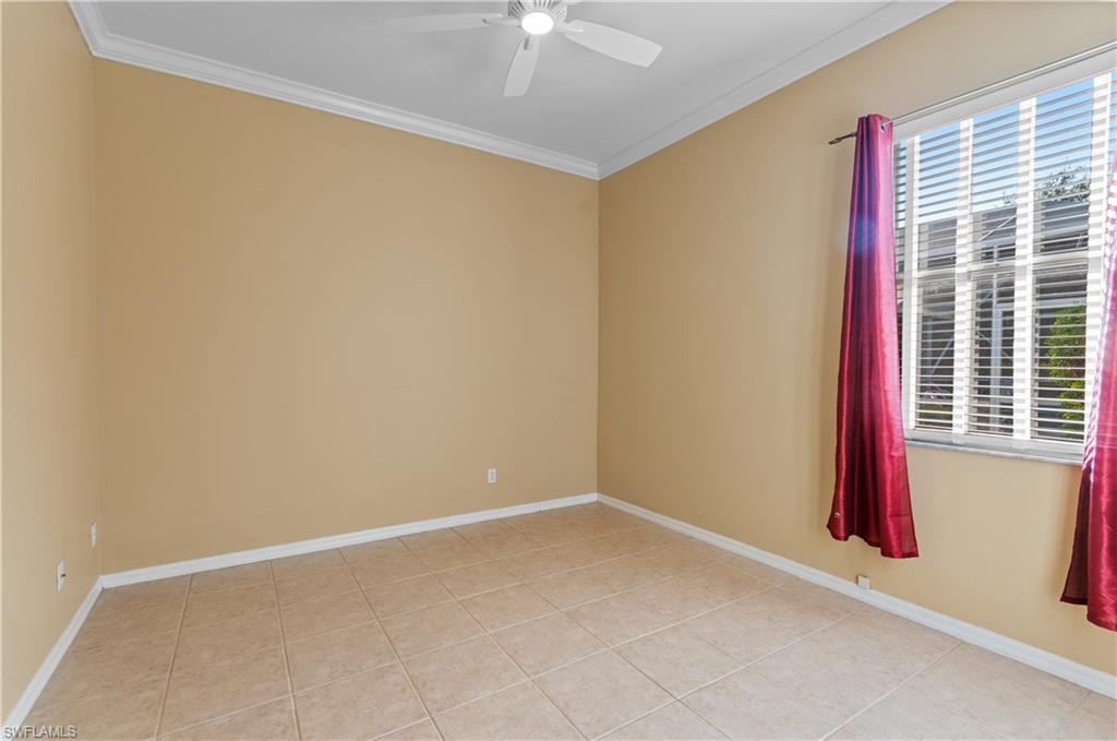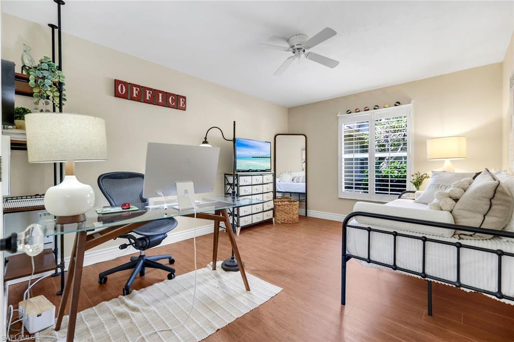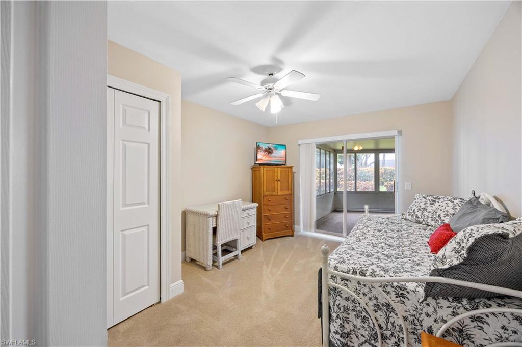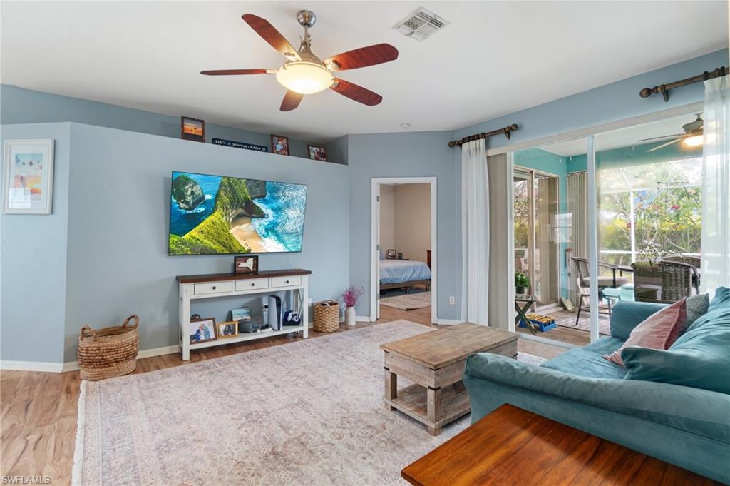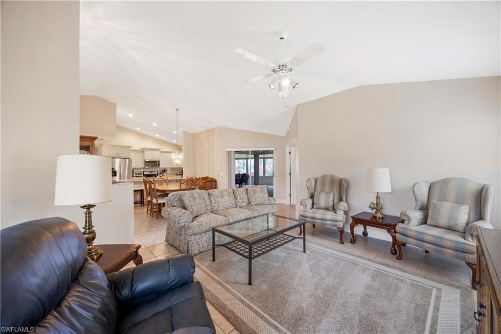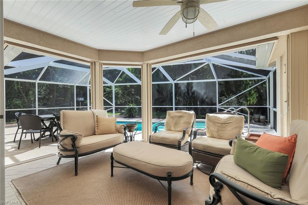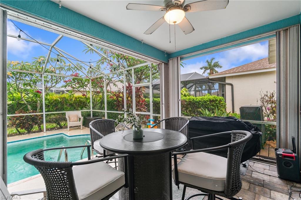 Welcome to this beautifully cared-for single-family home in the sought-after Estates section of Villages of Country Creek. This Captiva floor plan has been tastefully updated to create an inviting, light-filled space that feels instantly like home. Inside, you’ll find 2 bedrooms plus a den, PLUS an additional versatile office/bonus room, with plenty of storage. Step out to the huge extended lanai—finished with screened enclosure and elegant tile—where peaceful mornings and golden sunsets come with sweeping views of the 14th hole. This home is sitting on over a quarter acre lot surrounded by mature trees giving shade on your patio and a feeling like you have the 18-hole executive golf course all to yourselves. This is the prettiest, and most private lot in the community! Enjoy modern comfort and peace of mind with impact-resistant windows, a 2 year old A/C, and a 5-year-old water heater. The kitchen shines with newer stainless-steel appliances and a large undermount sink, placed under premium natural granite countertops, and under cabinet lighting. Other highlights include soring ceilings - welcoming in an abundance of natural light, Electric fireplace, 70ft long paver driveway, plantation shutters, a spacious laundry room, multiple walk in closets for extra storage, this home is charming and full of character— Furnishings are negotiable. Ideally located just minutes from RSW Airport, shopping, dining, and all the best of Estero living. Come see why this home stands out—a perfect blend of character, comfort, and Country Creek charm.