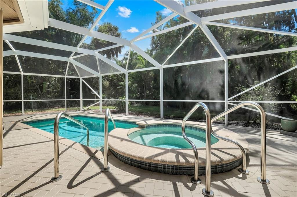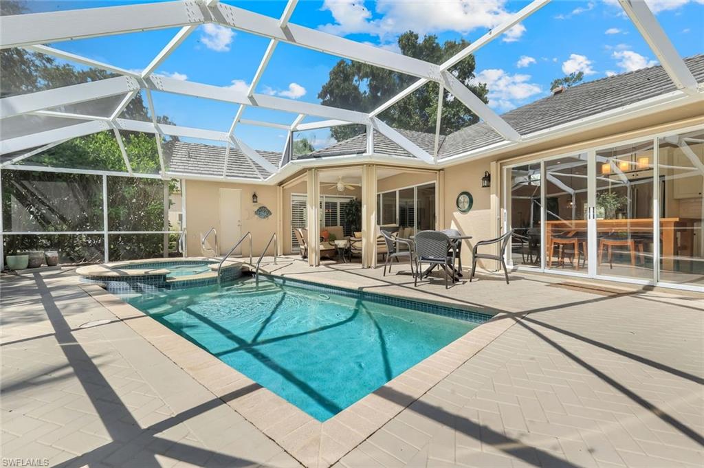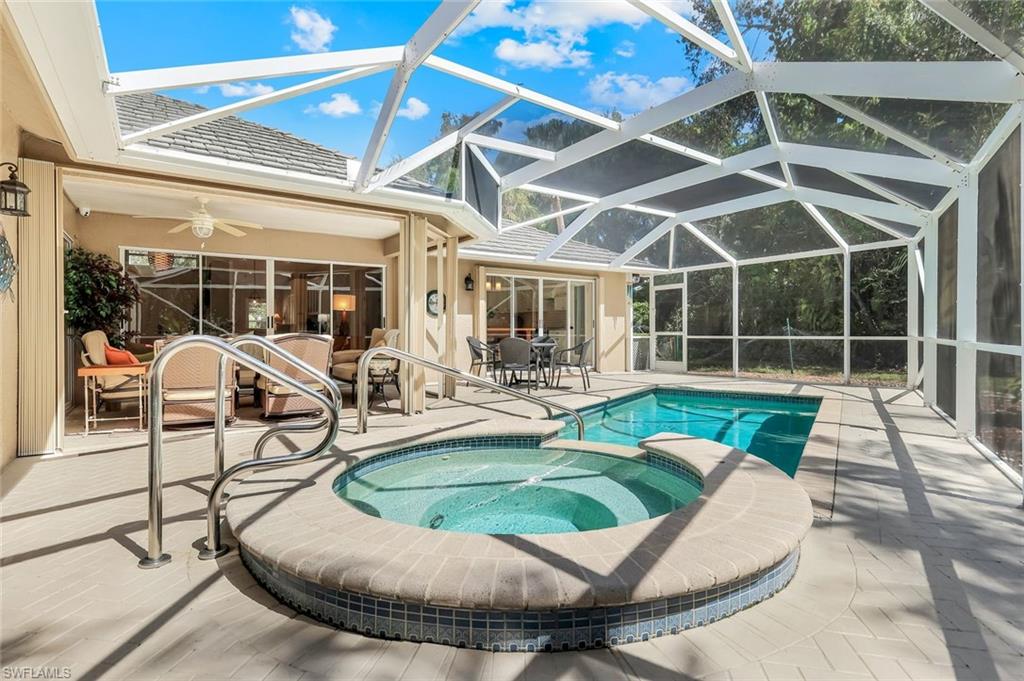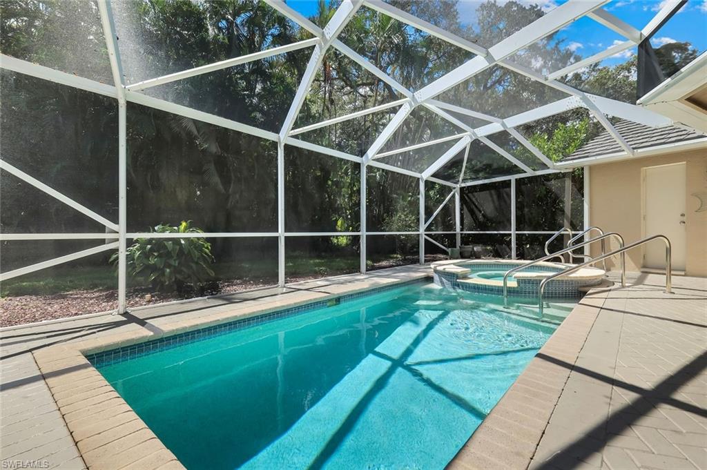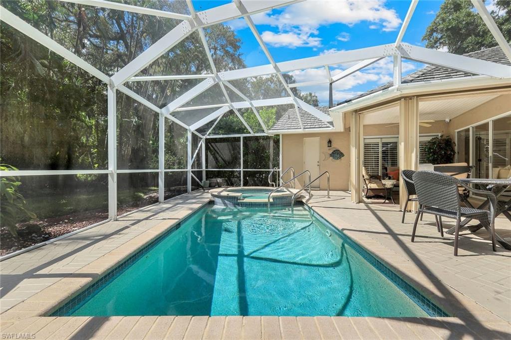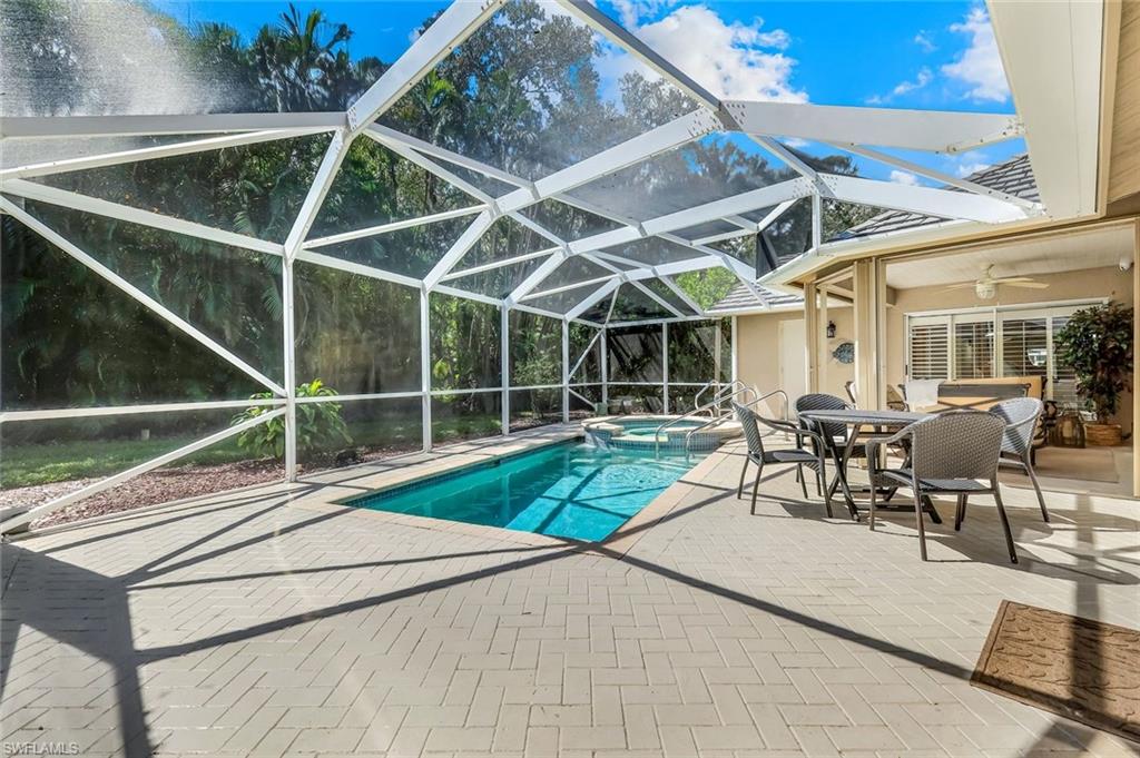 Welcome to one of the largest single-family floor plans in the highly sought-after Country Creek community, right in the heart of the Village of Estero! This was the original Canterbury model home, you'll notice many designer upgrades! This home is located in the premier Estates section and offers just under 2,100 sq. ft. of living space with 3 bedrooms, 2 baths, and a 2-car garage. Situated on a prime end lot with only one neighboring home, this property provides exceptional privacy along with breathtaking golf course and long lake views from your lanai. And the best part? Your very own gorgeous and refreshing pool & hot tub—perfect for relaxing or entertaining! Key features & updates include: - Gorgeous private pool & hot tub for year-round enjoyment. - New shingle roof (2017) for peace of mind. - New refrigerator (2023) to complement the beautiful white kitchen. - Luxury vinyl flooring throughout (2019)—stylish & durable! - Expansive master suite with lanai access, dual sinks, soaking tub & separate shower and large walk-in closet. - Formal dining room & separate breakfast nook—perfect for entertaining! - Hurricane protection for all windows and doors, featuring mostly electric shutters and accordion shutters on select windows for added security and peace of mind. All this in a low-fee, bundled golf community offering golf, a clubhouse, restaurant, 5 tennis courts, 5 swimming pools, bocce ball, a fitness center, and more! Plus, club membership is transferable to renters. Unbeatable location! Just minutes from Coconut Point Mall, Miromar Outlets, and SWFL Airport. This is Florida living at its finest—schedule your private tour today!