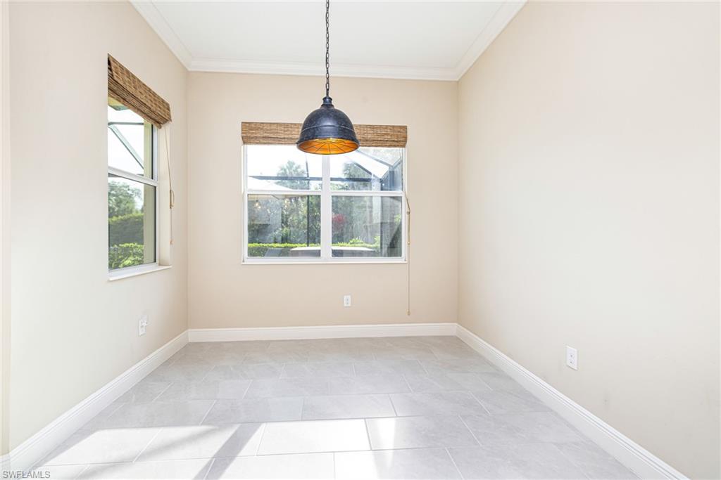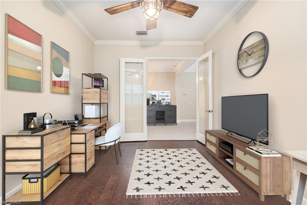 Welcome to 21281 Estero Palm Way – a meticulously cared-for 2-bedroom + den, 2-bathroom home located in the sought-after gated community of Estero Place. This natural gas neighborhood offers charm and convenience in equal measure. As you step inside, you'll find a bright, open floor plan filled with natural light and accented by sophisticated features like tray ceilings and crown molding. The spacious living area seamlessly connects to the kitchen, creating the perfect space for hosting family and friends. The primary suite is a private retreat with a roomy walk-in closet and a spa-like en-suite bathroom featuring dual vanities and a walk-in shower. Outdoors, the screened extended lanai invites you to relax and take in peaceful lake views. With impact-resistant glass windows, this home offers both comfort and security. Residents of Estero Place enjoy a nature boardwalk and direct access to the Three Oaks bike path. Ideally situated in the heart of Estero, this home puts you just minutes from Coconut Point Mall, Gulf Coast Town Center, pristine Southwest Florida beaches, RSW International Airport, and convenient routes via I-75 and US-41.