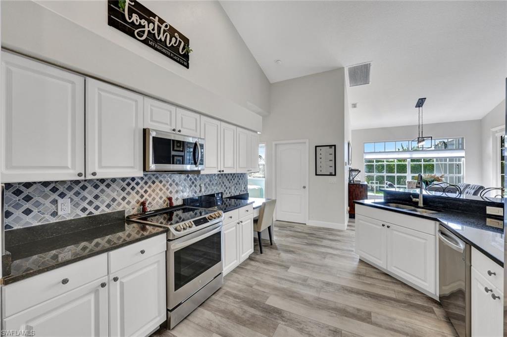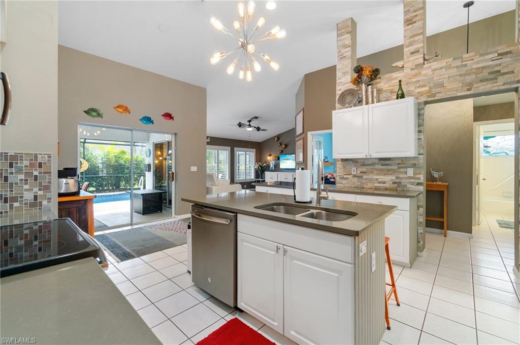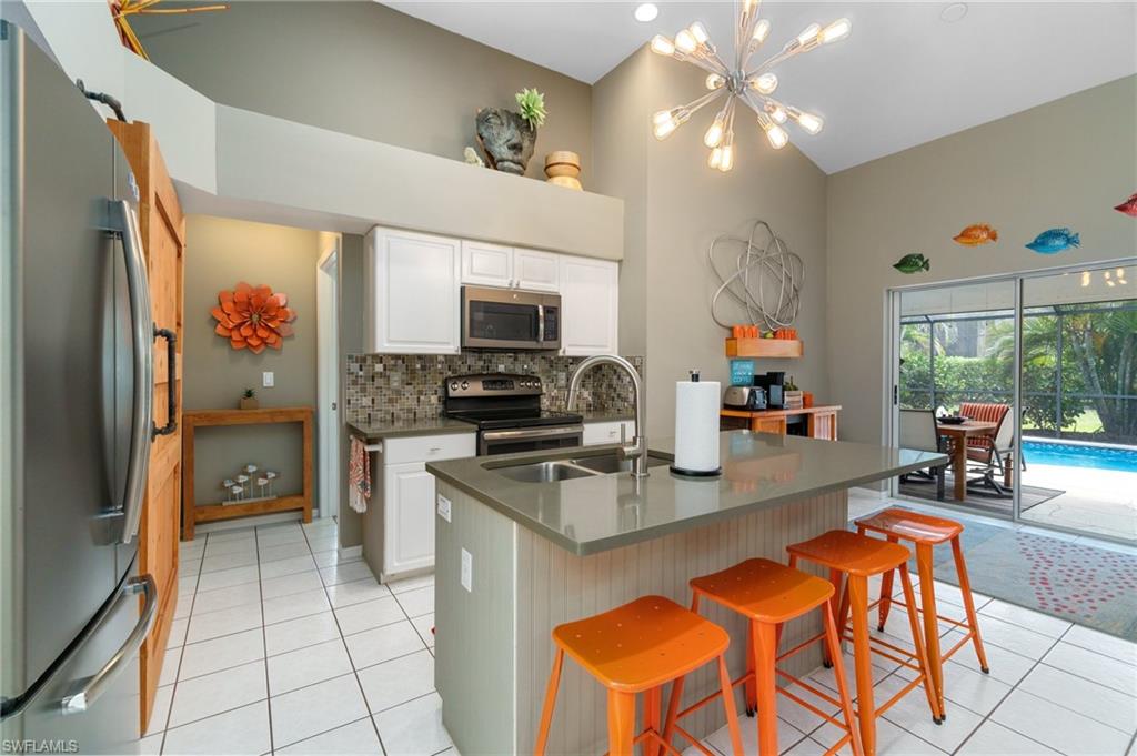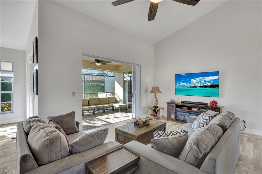 This beautifully maintained 3-bedroom, 2-bathroom home in the highly sought-after Fountain Lakes community of Estero offers an unbeatable combination of style, functionality, and prime location. From the moment you arrive, you'll be captivated by the home's charming curb appeal, featuring a lush, manicured lawn, mature trees providing natural shade, and a welcoming screened-in entryway—perfect for enjoying the Florida breeze. Step inside to discover a spacious, open-concept floor plan bathed in natural light, enhanced by vaulted ceilings and neutral tile flooring throughout. The heart of the home is the chef-inspired kitchen, boasting custom cabinetry, granite countertops, a stylish backsplash, and stainless steel appliances, including an induction stovetop range. A large island with bar seating invites gatherings, while the built-in wine/beverage fridge adds a touch of luxury. The kitchen seamlessly flows into the living and dining areas, making it ideal for entertaining or relaxing with loved ones. The expansive primary suite is a true retreat, featuring wood-style flooring, a sitting area, and private access to the pool. The en-suite bathroom impresses with dual sinks, a spacious vanity, and a walk-in shower, creating a spa-like ambiance. The additional bedrooms are generously sized and well-appointed, offering comfort and versatility for guests or a home office. Step outside to your private outdoor oasis—a screened-in lanai with a heated pool that can be enjoyed year-round! Whether you're soaking up the sun, dining al fresco, or unwinding under the covered patio, this backyard is designed for relaxation and entertainment. A fully fenced yard ensures privacy and is perfect for pets. Recent upgrades include newer plumbing, a pool resurfacing, newer pool heater and pump, and a 12,000-watt dual-fuel generator with a transfer switch—providing peace of mind during power outages. Living in Fountain Lakes means access to resort-style amenities, including a private 9-hole golf course, pickleball and tennis courts, a community pool, fitness center, and more—all with LOW HOA fees! The location is unbeatable—just across from Coconut Point Mall and a short drive to SWFL International Airport and pristine Gulf Coast beaches. Don’t miss the chance to make this incredible home yours—schedule your private showing today!