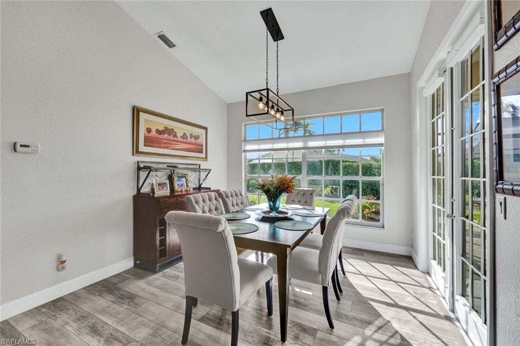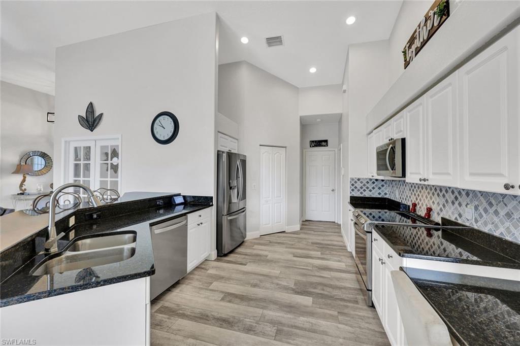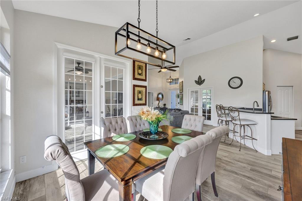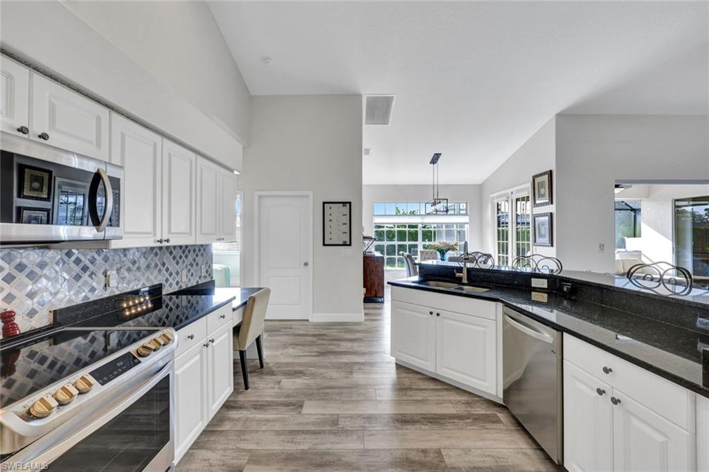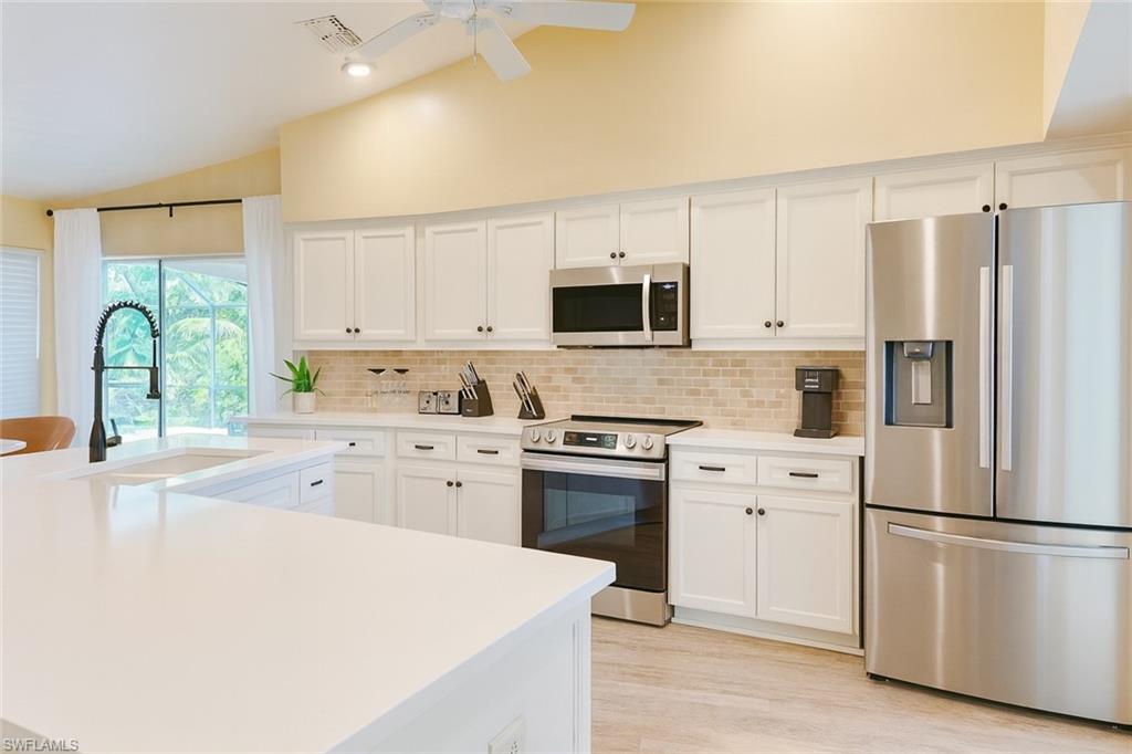 This beautifully maintained 3-bedroom, 2-bathroom home in the highly sought-after Fountain Lakes community of Estero offers an unbeatable combination of style, functionality, and prime location. From the moment you arrive, you'll be captivated by the home's charming curb appeal, featuring a lush, manicured lawn, mature trees providing natural shade, and a welcoming screened-in entryway—perfect for enjoying the Florida breeze. Step inside to discover a spacious, open-concept floor plan bathed in natural light, enhanced by vaulted ceilings and neutral tile flooring throughout. The heart of the home is the chef-inspired kitchen, boasting custom cabinetry, granite countertops, a stylish backsplash, and stainless steel appliances, including an induction stovetop range. A large island with bar seating invites gatherings, while the built-in wine/beverage fridge adds a touch of luxury. The kitchen seamlessly flows into the living and dining areas, making it ideal for entertaining or relaxing with loved ones. The expansive primary suite is a true retreat, featuring wood-style flooring, a sitting area, and private access to the pool. The en-suite bathroom impresses with dual sinks, a spacious vanity, and a walk-in shower, creating a spa-like ambiance. The additional bedrooms are generously sized and well-appointed, offering comfort and versatility for guests or a home office. Step outside to your private outdoor oasis—a screened-in lanai with a heated pool that can be enjoyed year-round! Whether you're soaking up the sun, dining al fresco, or unwinding under the covered patio, this backyard is designed for relaxation and entertainment. A fully fenced yard ensures privacy and is perfect for pets. Recent upgrades include newer plumbing, a pool resurfacing, newer pool heater and pump, and a 12,000-watt dual-fuel generator with a transfer switch—providing peace of mind during power outages. Living in Fountain Lakes means access to resort-style amenities, including a private 9-hole golf course, pickleball and tennis courts, a community pool, fitness center, and more—all with LOW HOA fees! The location is unbeatable—just across from Coconut Point Mall and a short drive to SWFL International Airport and pristine Gulf Coast beaches. Don’t miss the chance to make this incredible home yours—schedule your private showing today!
